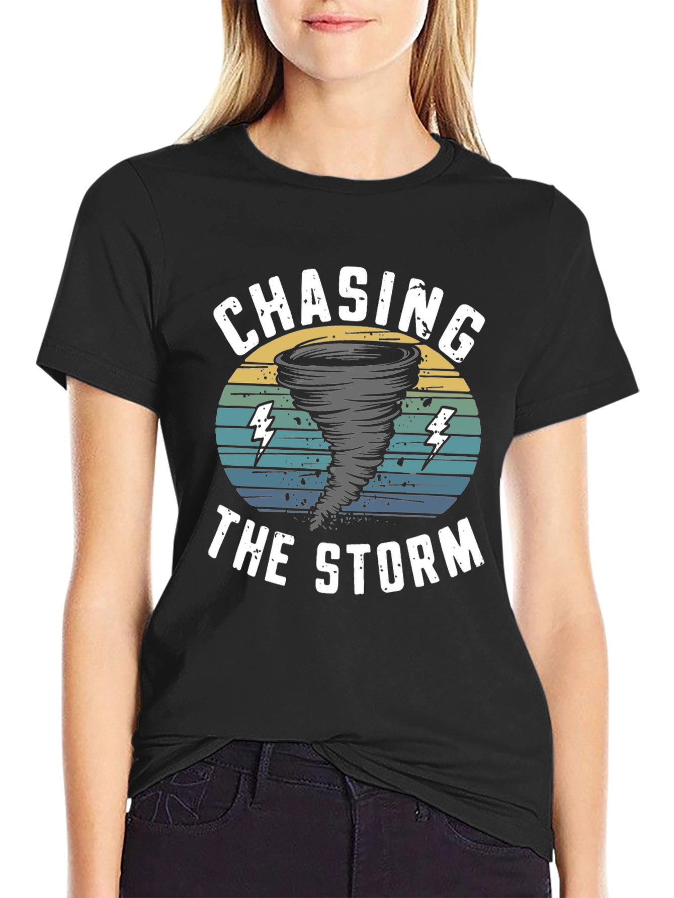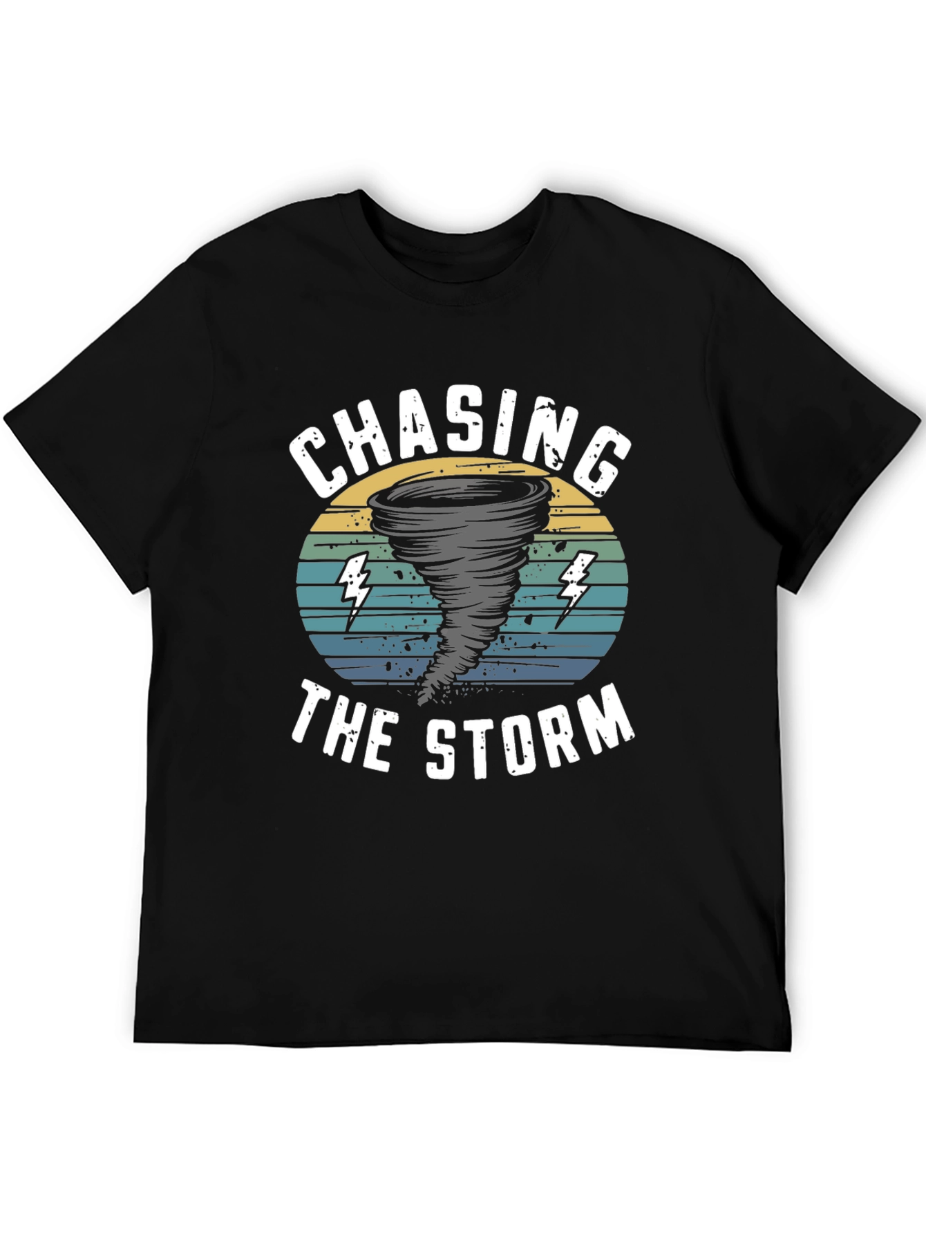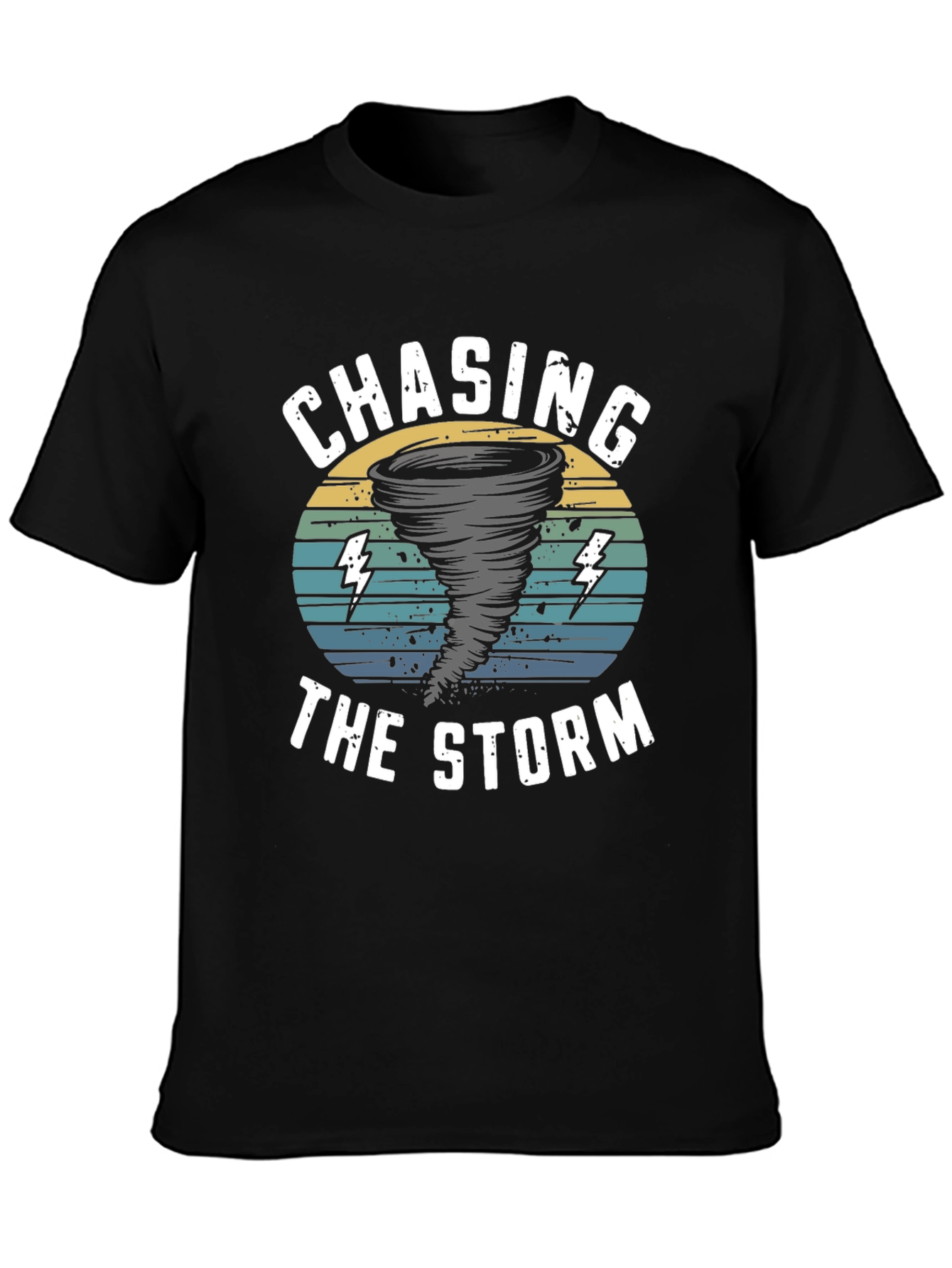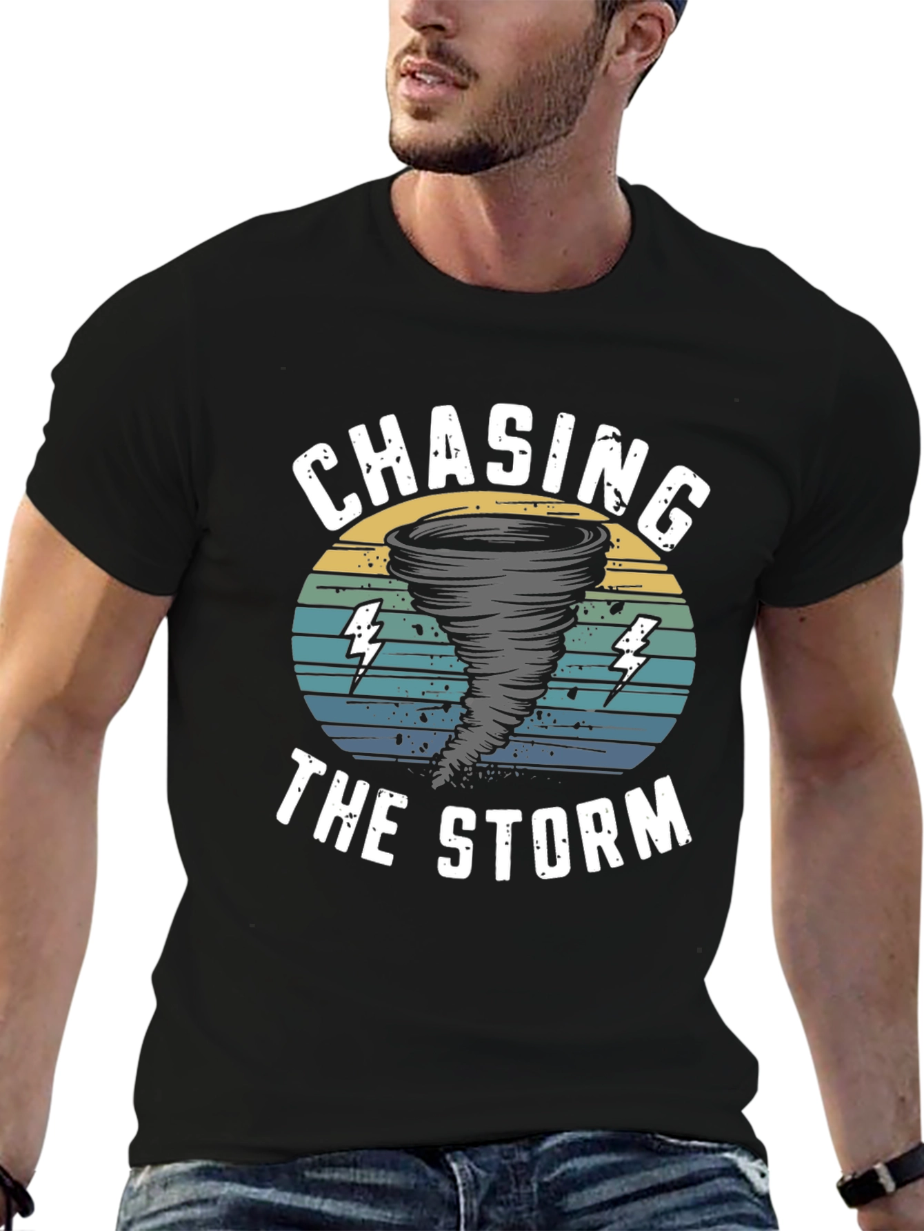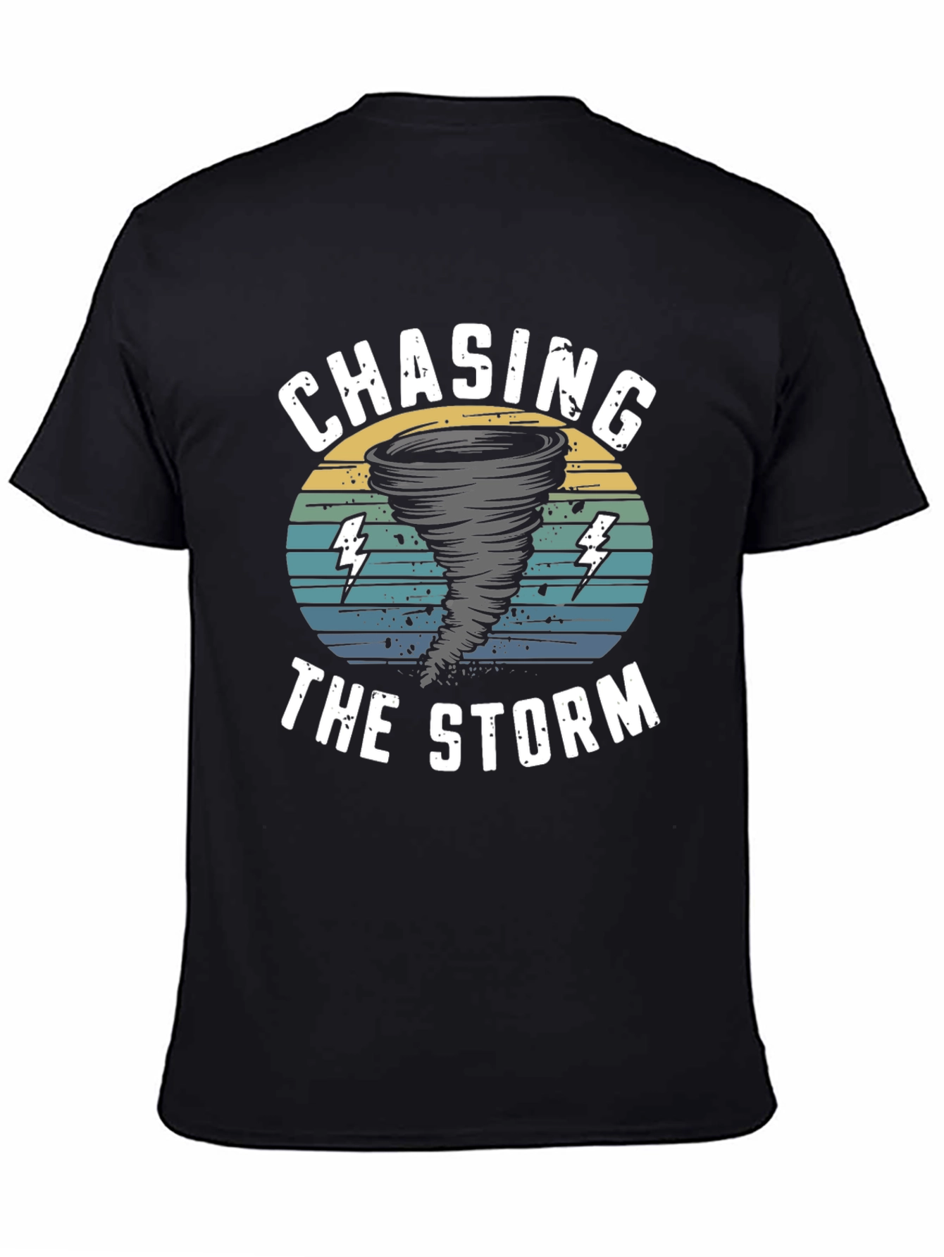 This bold black graphic tee features a captivating design of a swirling tornado set against a vintage-style sunburst background. Electric lightning bolts add a dramatic touch. The words "CHASING THE STORM" are emblazoned above and below the image in a distressed, eye-catching font. Made from comfortable materials, this T-shirt is perfect for casual wear, outdoor adventures, or expressing your love for wild weather. Pair it with jeans or shorts for a cool, relaxed look. Ideal for storm chasers, weather enthusiasts, or anyone who appreciates unique graphic designs. Stand out from the crowd with this statement piece!