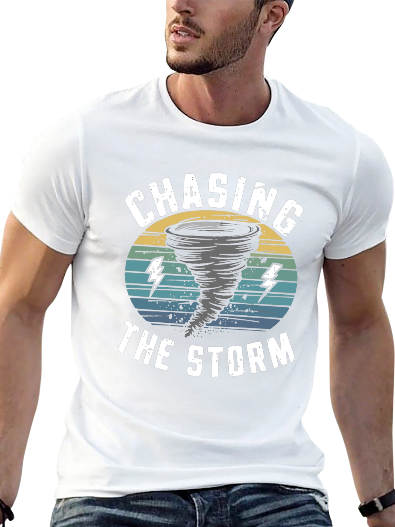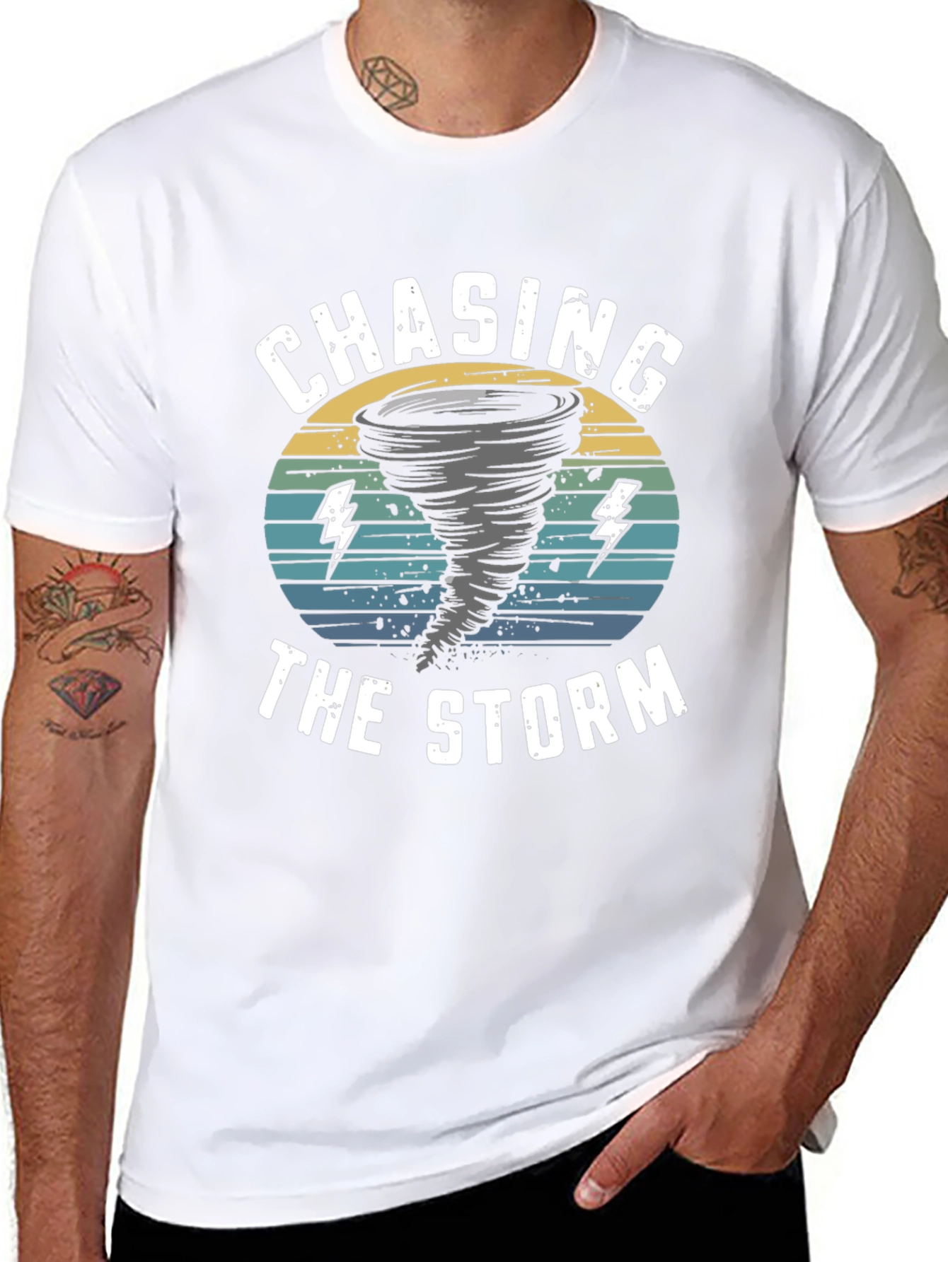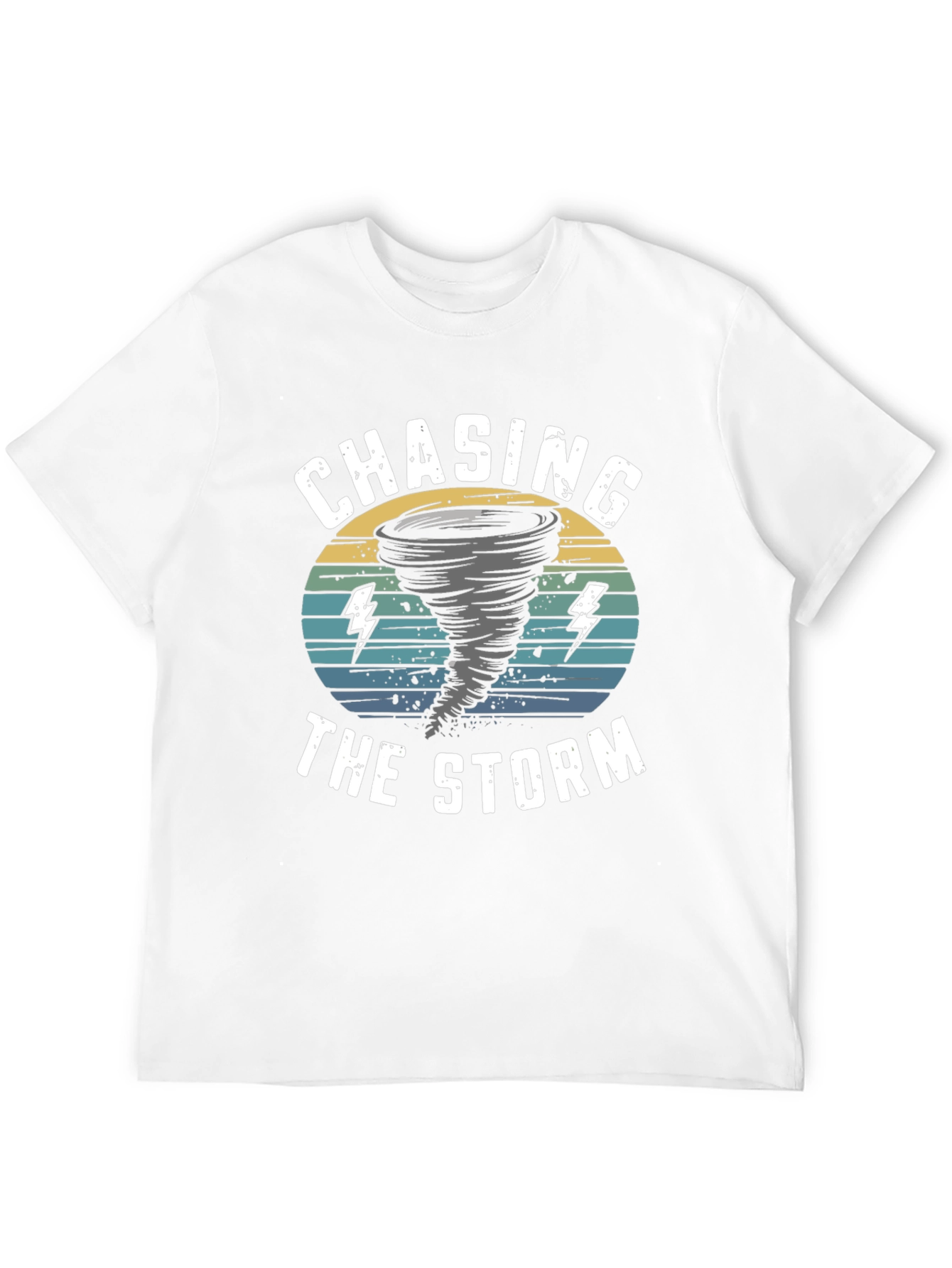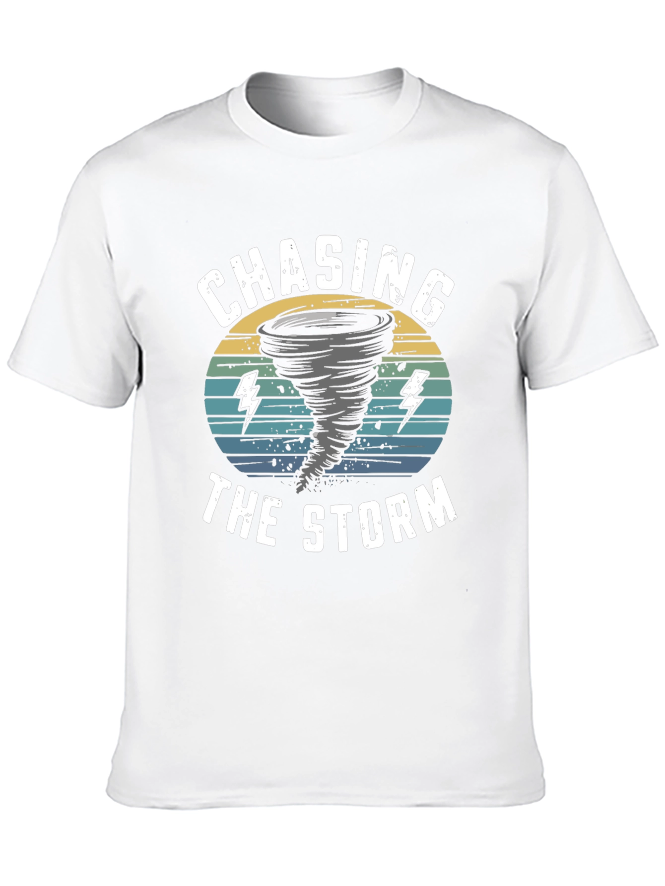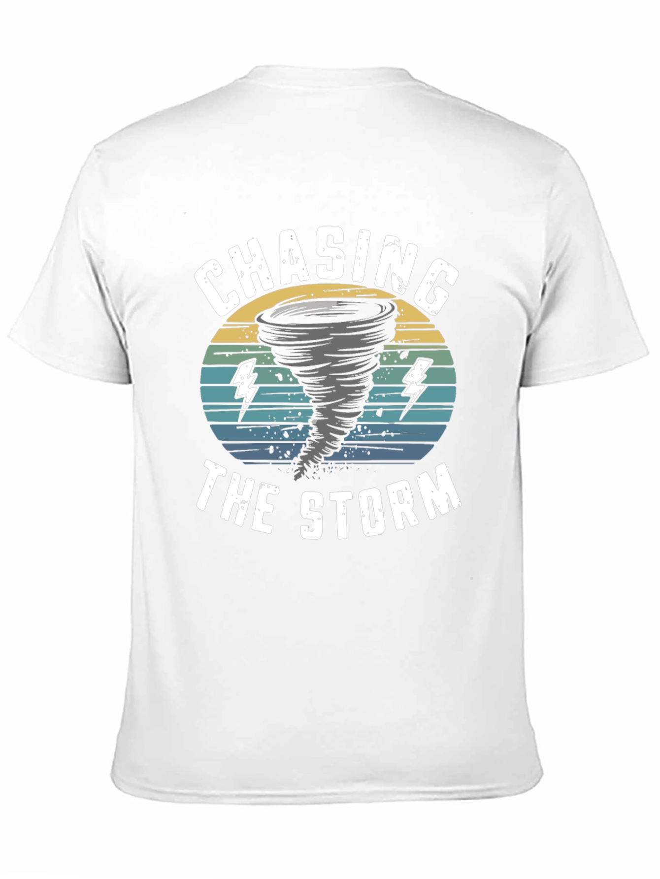 This bold black graphic tee features a captivating design of a swirling tornado set against a vintage-style sunburst background. Electric lightning bolts add a dramatic touch. The words "CHASING THE STORM" are emblazoned above and below the image in a distressed, eye-catching font. Made from comfortable materials, this T-shirt is perfect for casual wear, outdoor adventures, or expressing your love for wild weather. Pair it with jeans or shorts for a cool, relaxed look. Ideal for storm chasers, weather enthusiasts, or anyone who appreciates unique graphic designs. Stand out from the crowd with this statement piece!