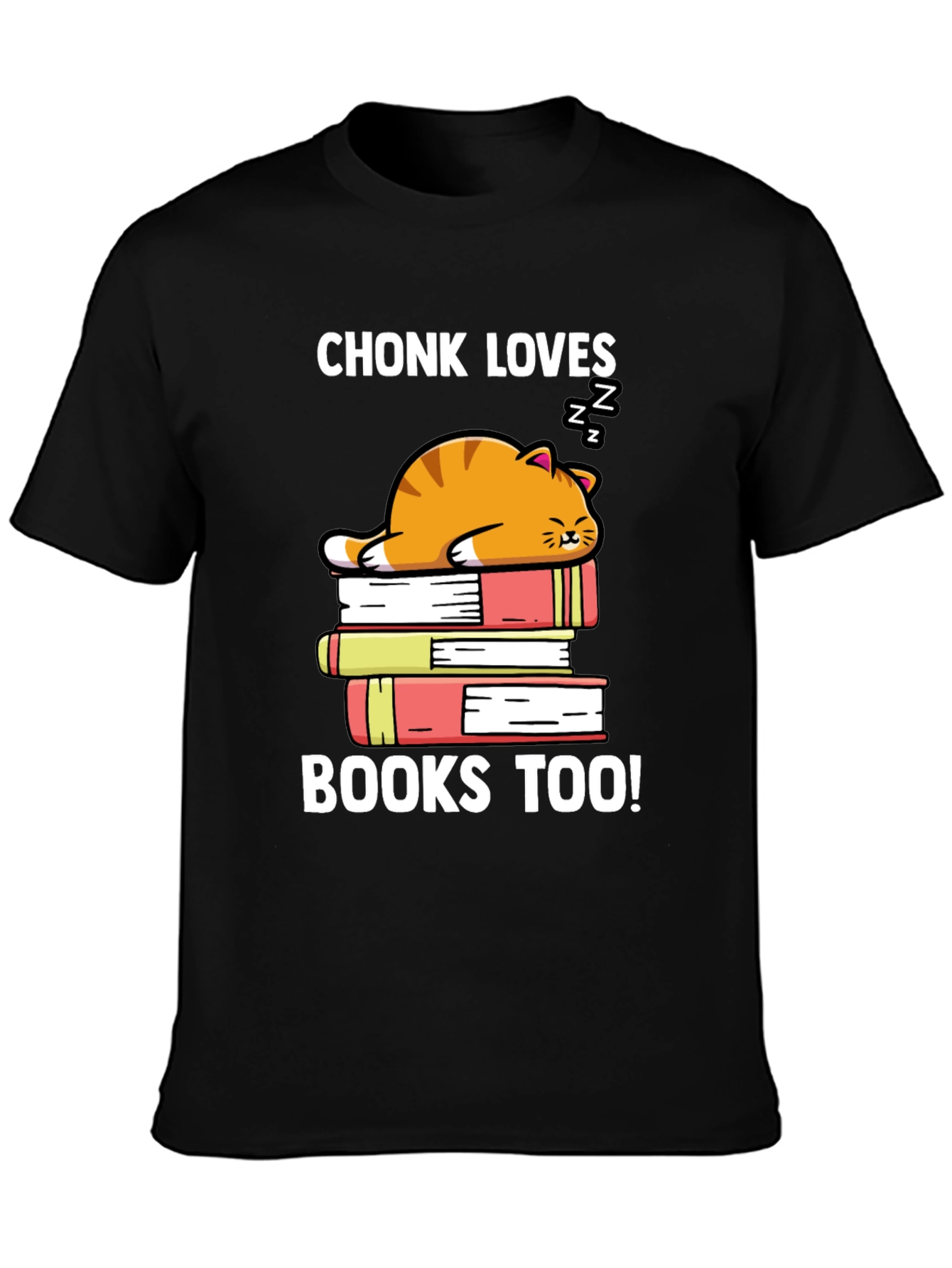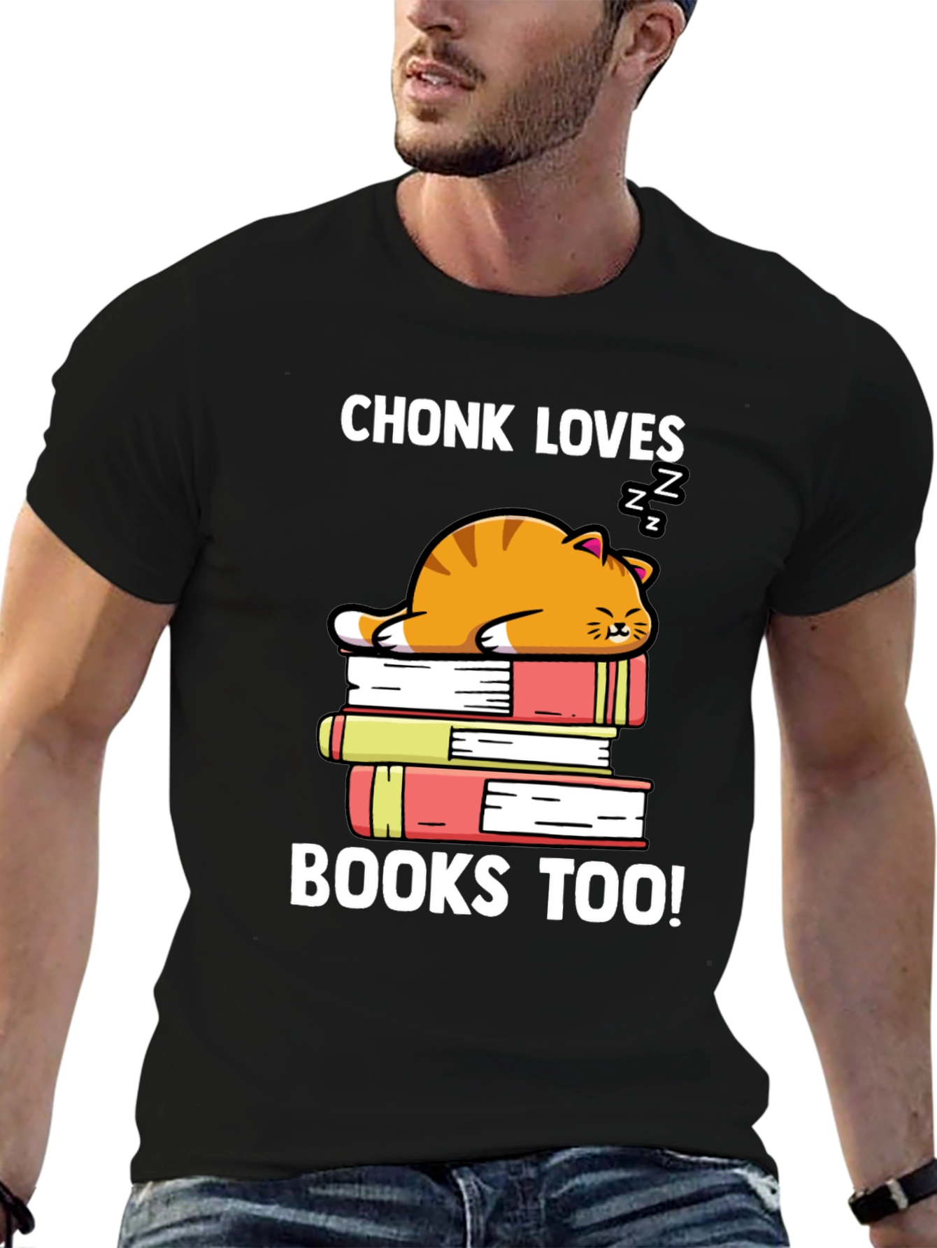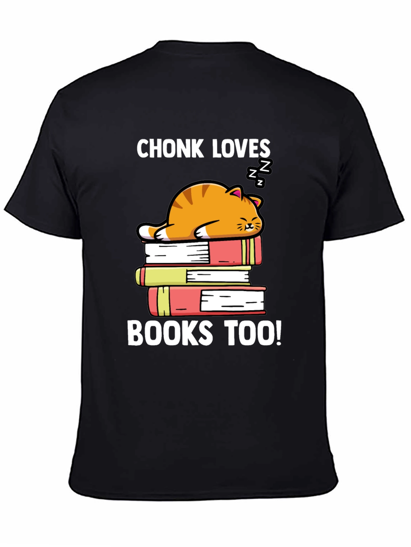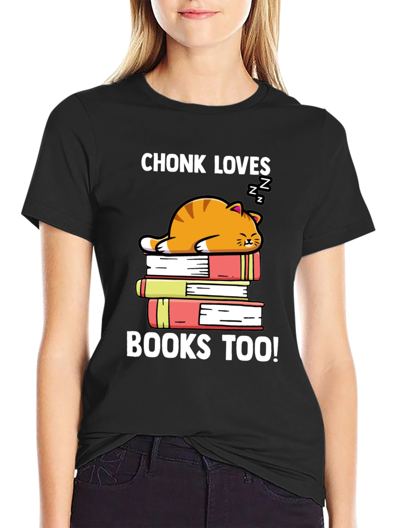 This adorable t-shirt features a cute, chubby cat napping on a stack of books. The design is printed on a comfortable, black short-sleeved shirt. The print showcases the phrase "CHONK LOVES BOOKS TOO!" above and below the cat image. This tee is perfect for cat lovers and bookworms alike. Show off your love for feline friends and literature with this charming and unique shirt. This makes a great gift for yourself or any friend who adores cats and a good read. Grab yours today and wear your passion with pride!
