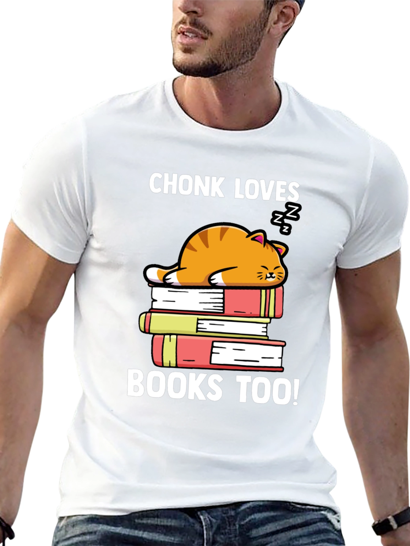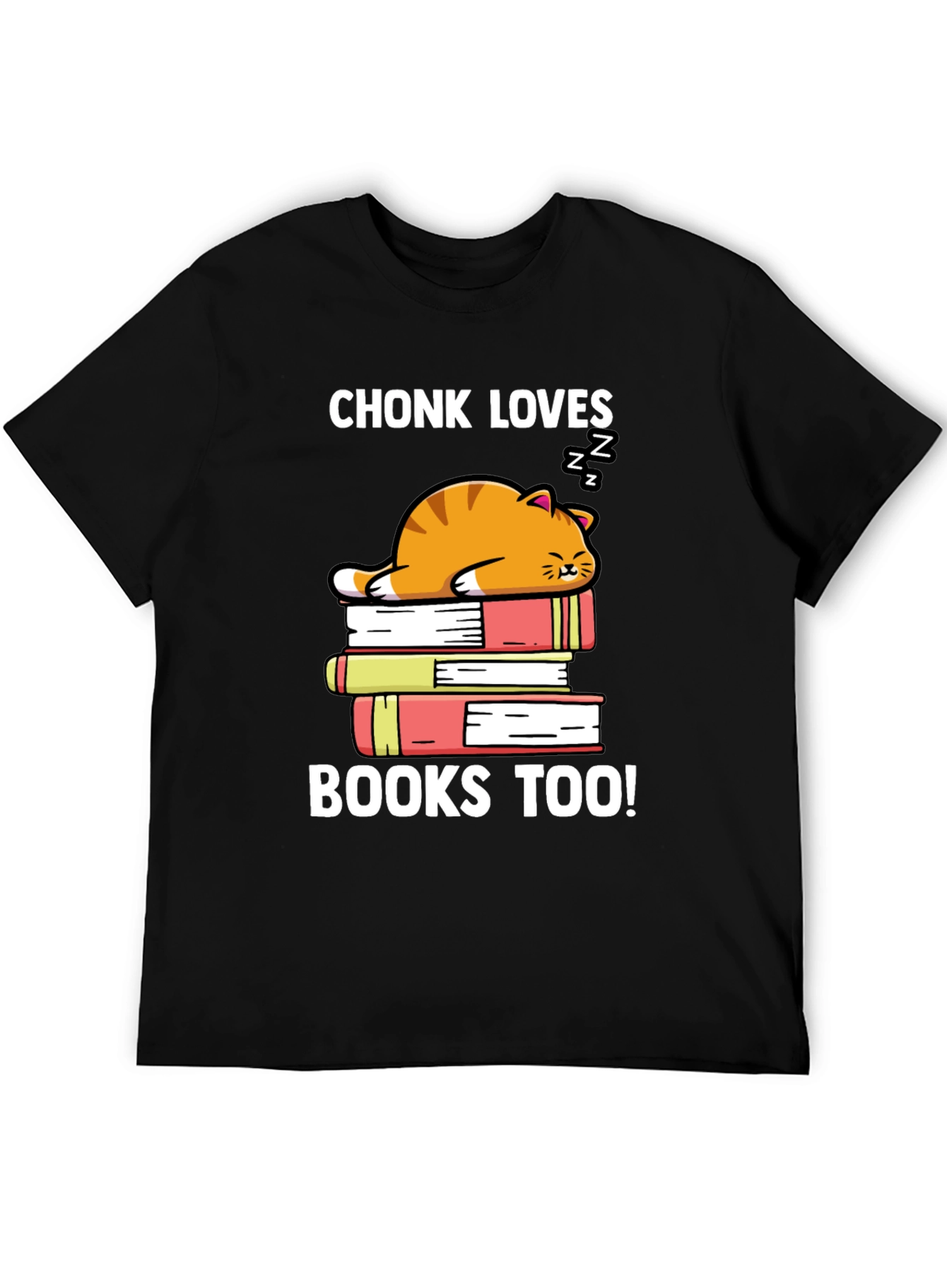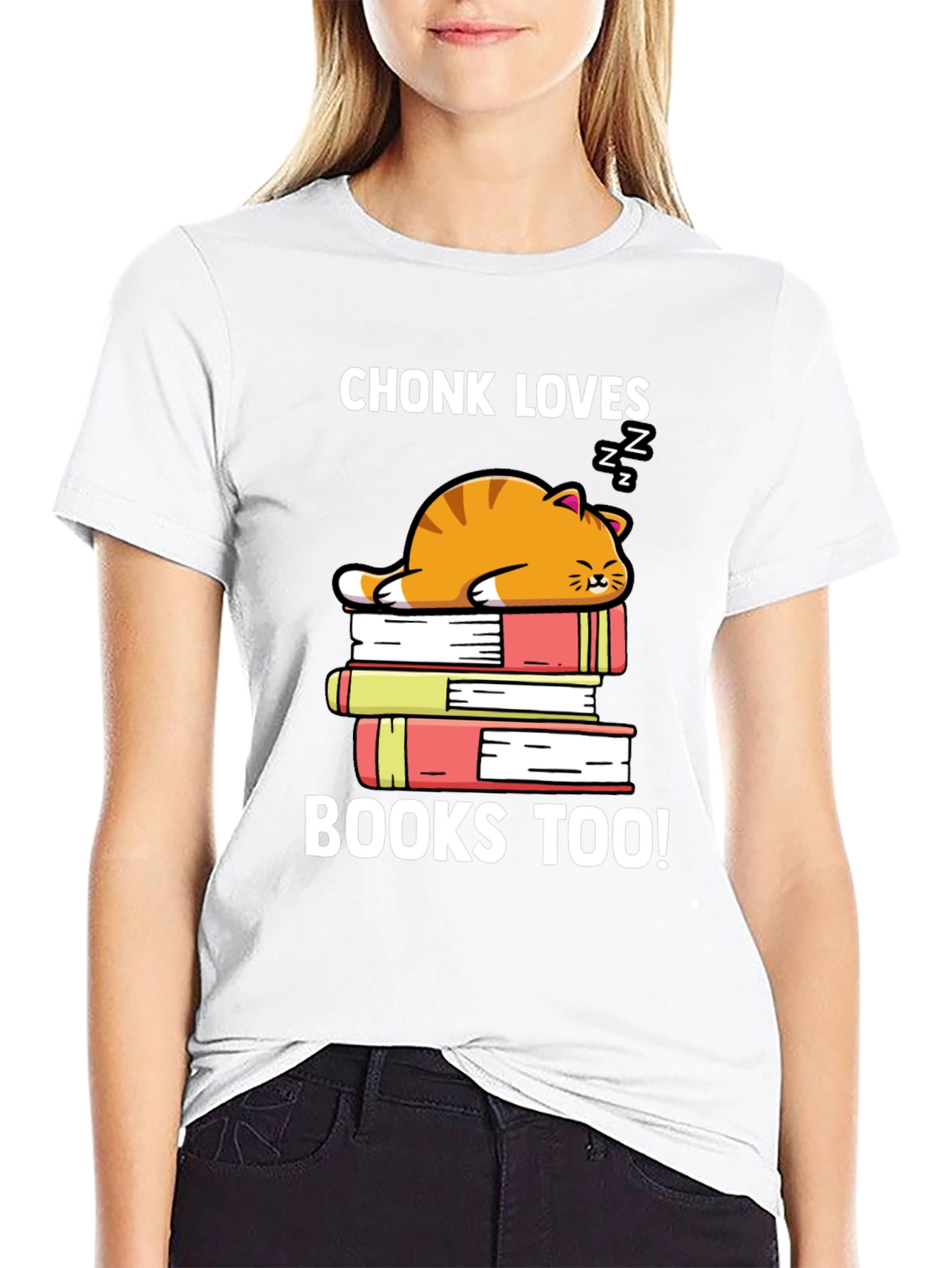 This adorable t-shirt features a cute, chubby cat napping on a stack of books. The design is printed on a comfortable, black short-sleeved shirt. The print showcases the phrase "CHONK LOVES BOOKS TOO!" above and below the cat image. This tee is perfect for cat lovers and bookworms alike. Show off your love for feline friends and literature with this charming and unique shirt. This makes a great gift for yourself or any friend who adores cats and a good read. Grab yours today and wear your passion with pride!
