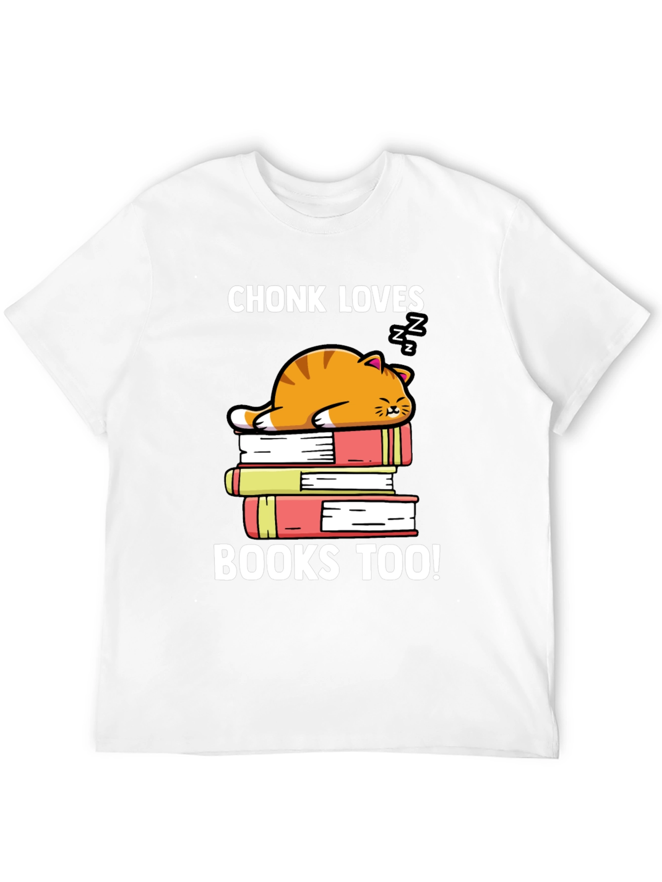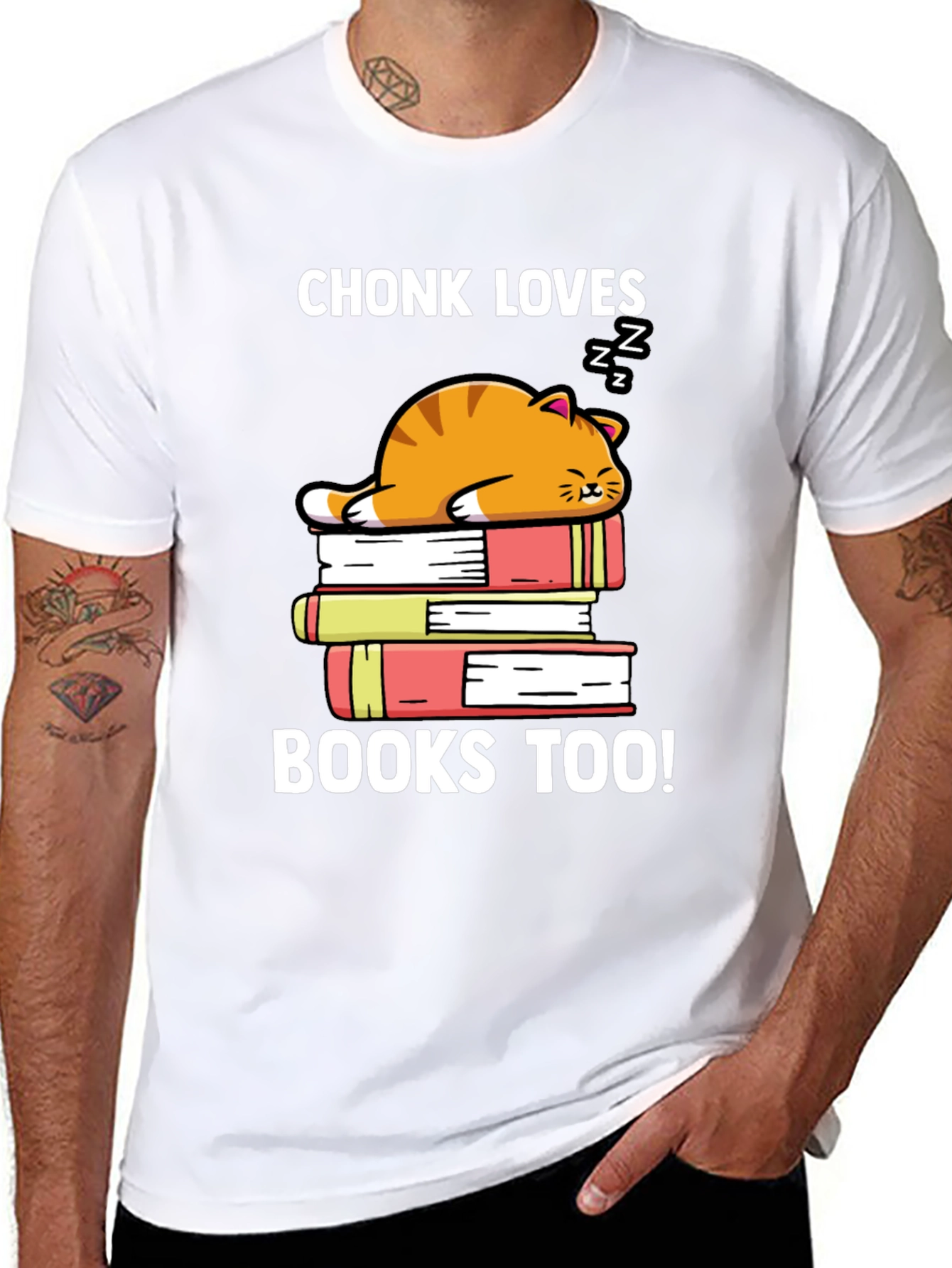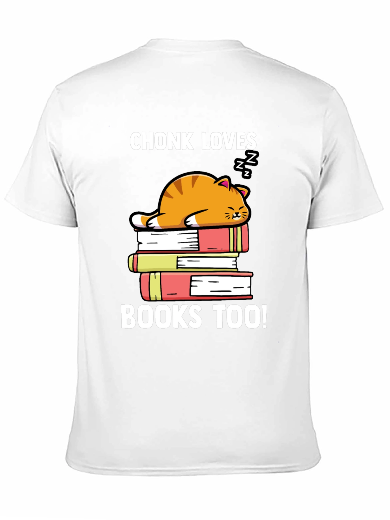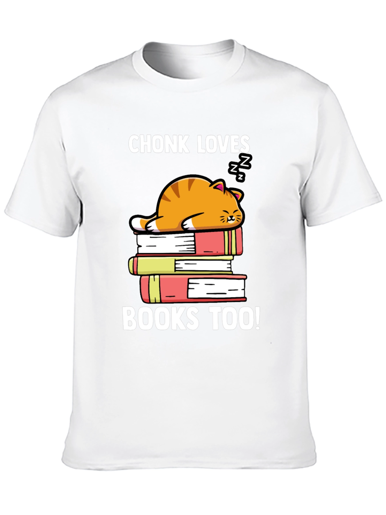 This adorable t-shirt features a cute, chubby cat napping on a stack of books. The design is printed on a comfortable, black short-sleeved shirt. The print showcases the phrase "CHONK LOVES BOOKS TOO!" above and below the cat image. This tee is perfect for cat lovers and bookworms alike. Show off your love for feline friends and literature with this charming and unique shirt. This makes a great gift for yourself or any friend who adores cats and a good read. Grab yours today and wear your passion with pride!
