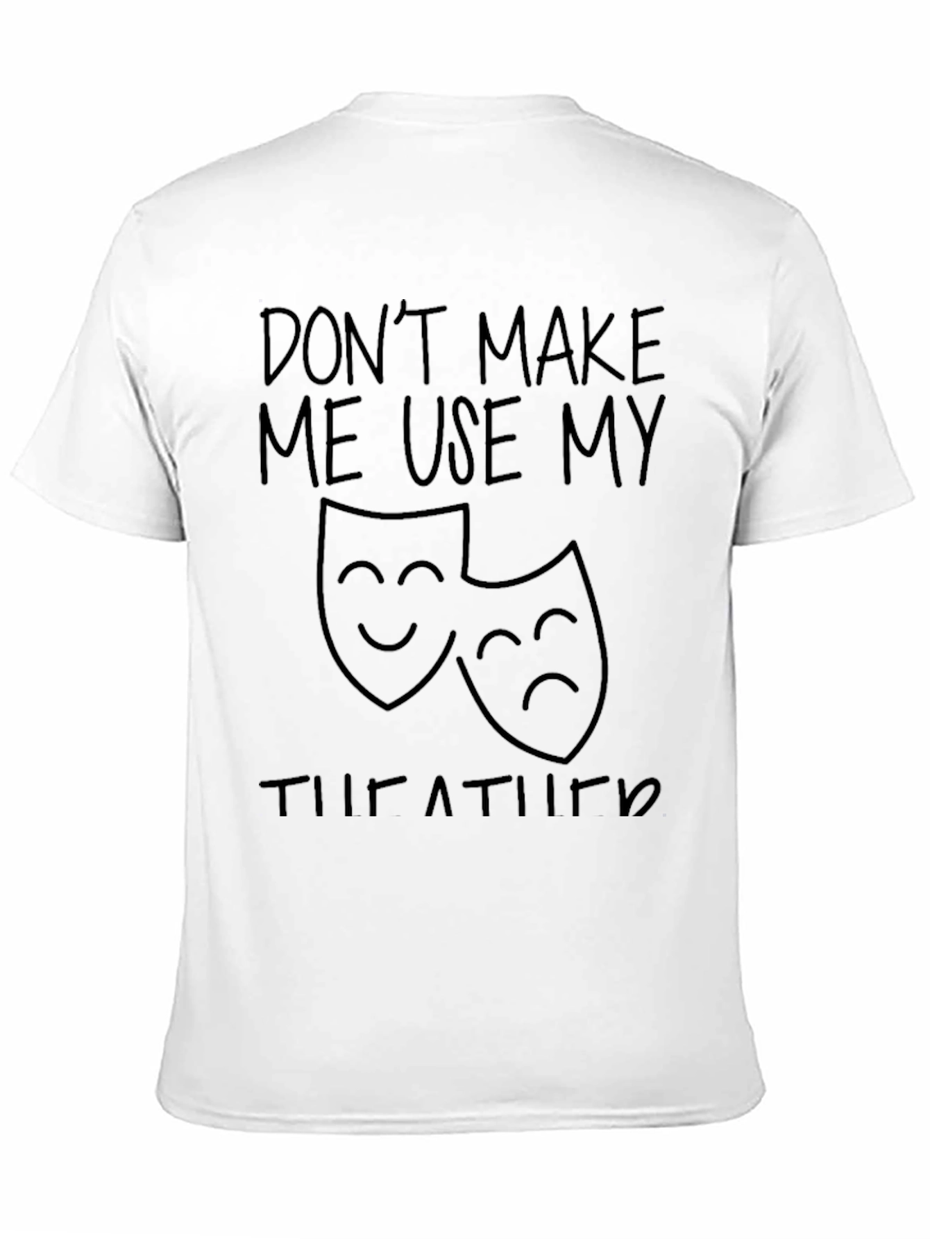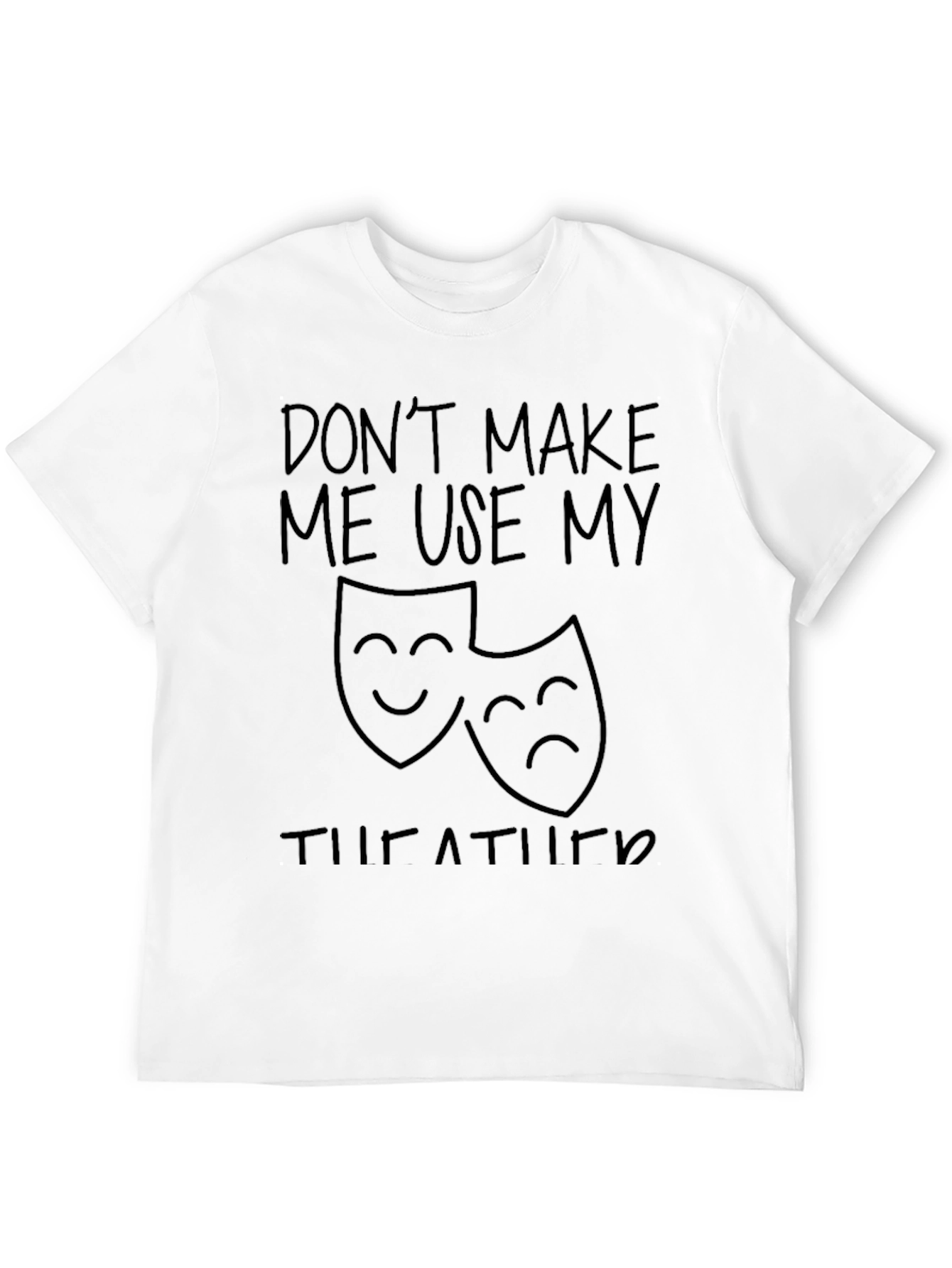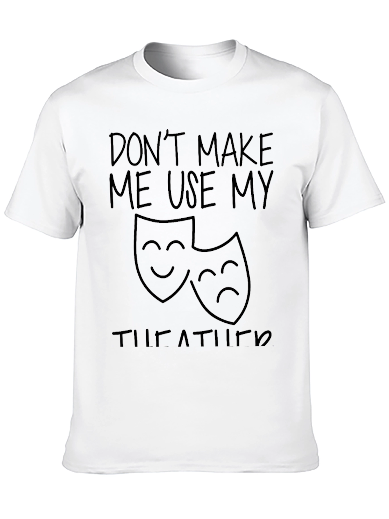Show off your dramatic side with this unique t-shirt! This black t-shirt features the saying "Don't Make Me Use My Theatre" with drama masks that add a touch of personality. The soft fabric ensures a comfortable fit, making it perfect for everyday wear or your next show. It's a fun way to express your love for the stage. Whether you're an actor, stage manager, or theatre enthusiast, this t-shirt is sure to get a laugh. Get yours today!