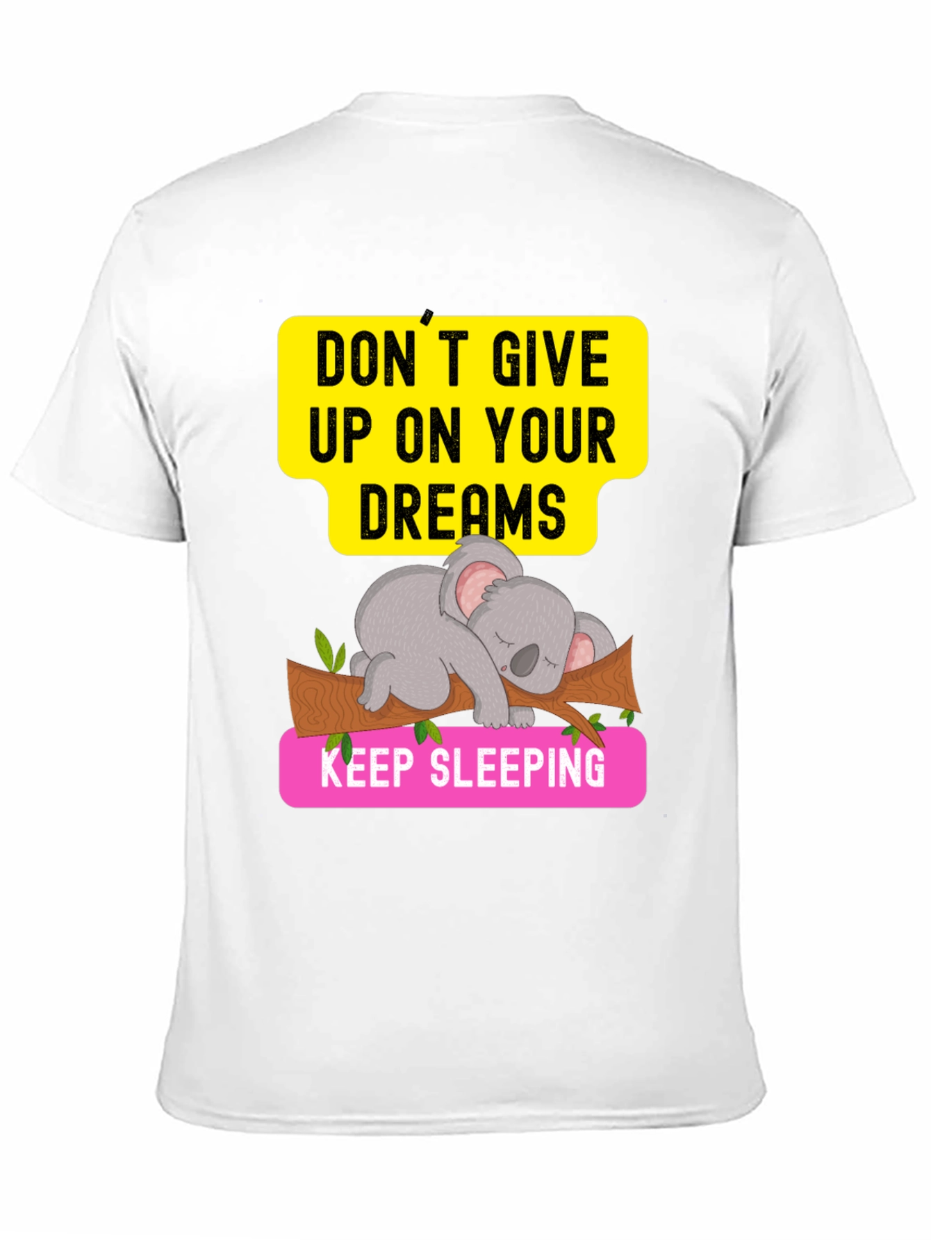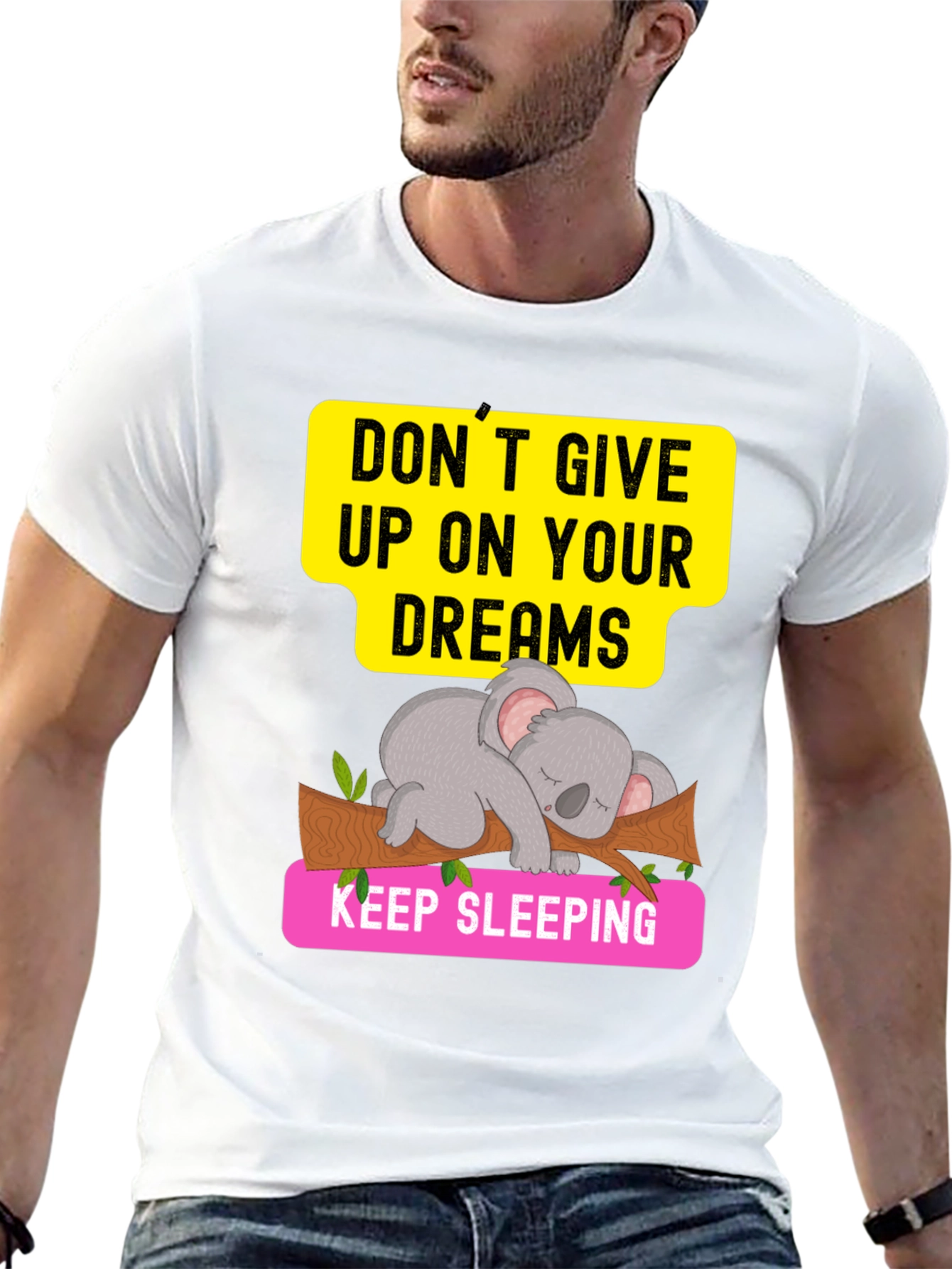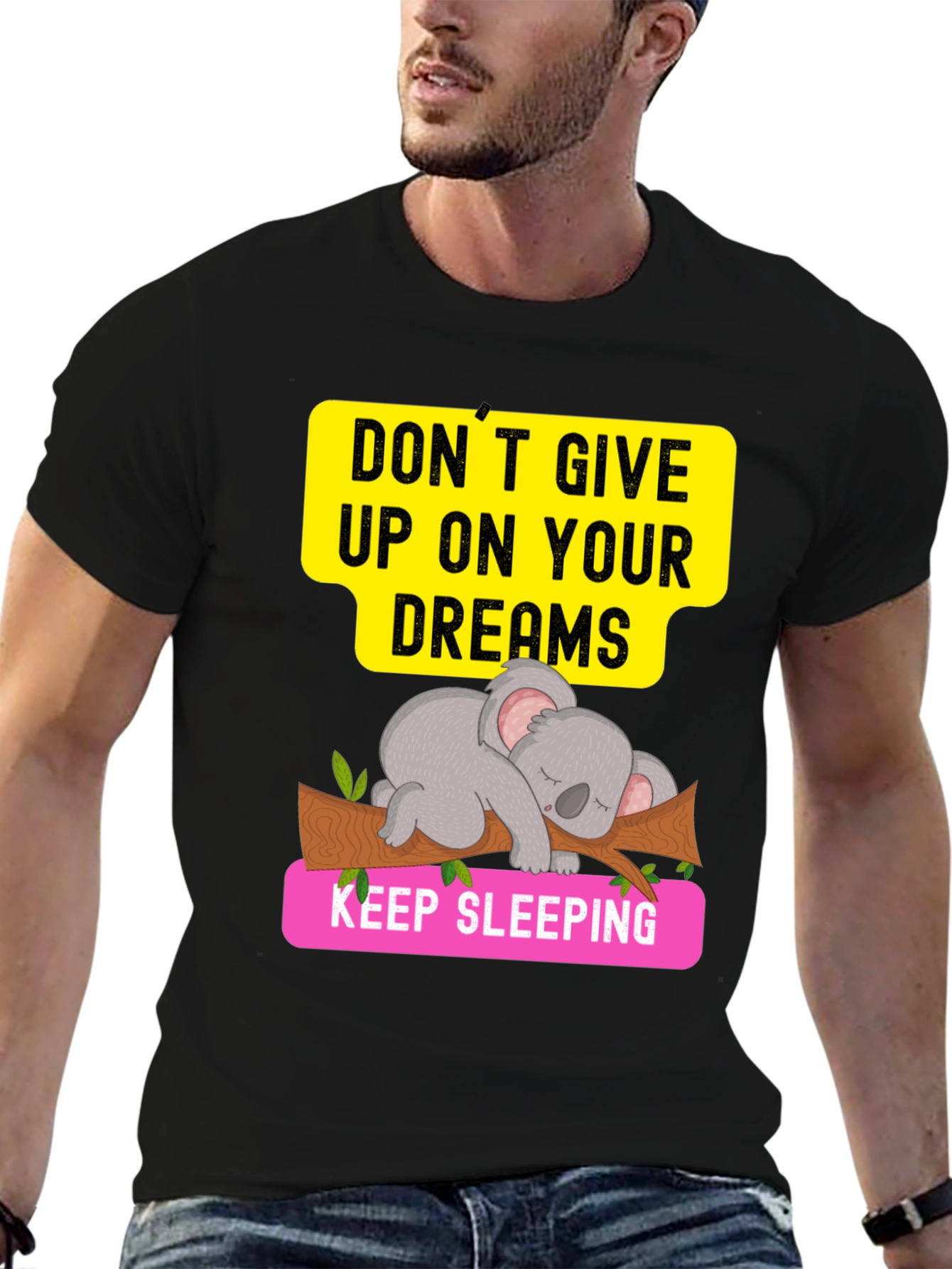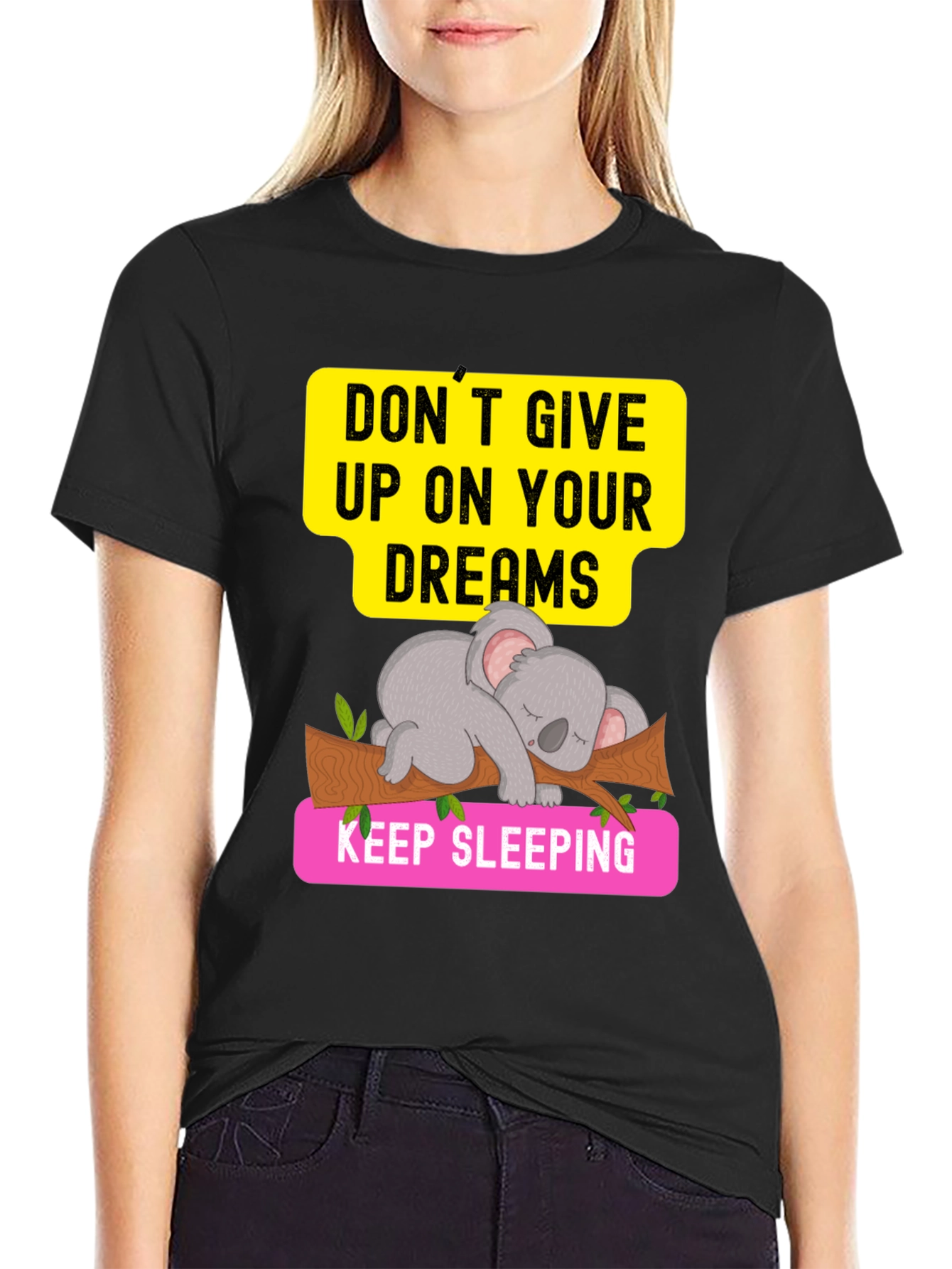Embrace your inner relaxation with this charming black tee featuring a sleeping koala! The shirt showcases a cute cartoon koala dozing on a branch, framed by the playful text: "DON'T GIVE UP ON YOUR DREAMS" and "KEEP SLEEPING". The design features bright yellow and pink blocks highlighting the text. Made from a comfortable-looking fabric, this casual t-shirt is perfect for lounging, sleepovers, or making a statement about your love for naps. It's a fun, quirky way to express your chill vibes and add a touch of whimsy to your wardrobe. A great gift for animal lovers and dreamers alike! Add this unique piece to your collection and let the world know you're serious about your rest.