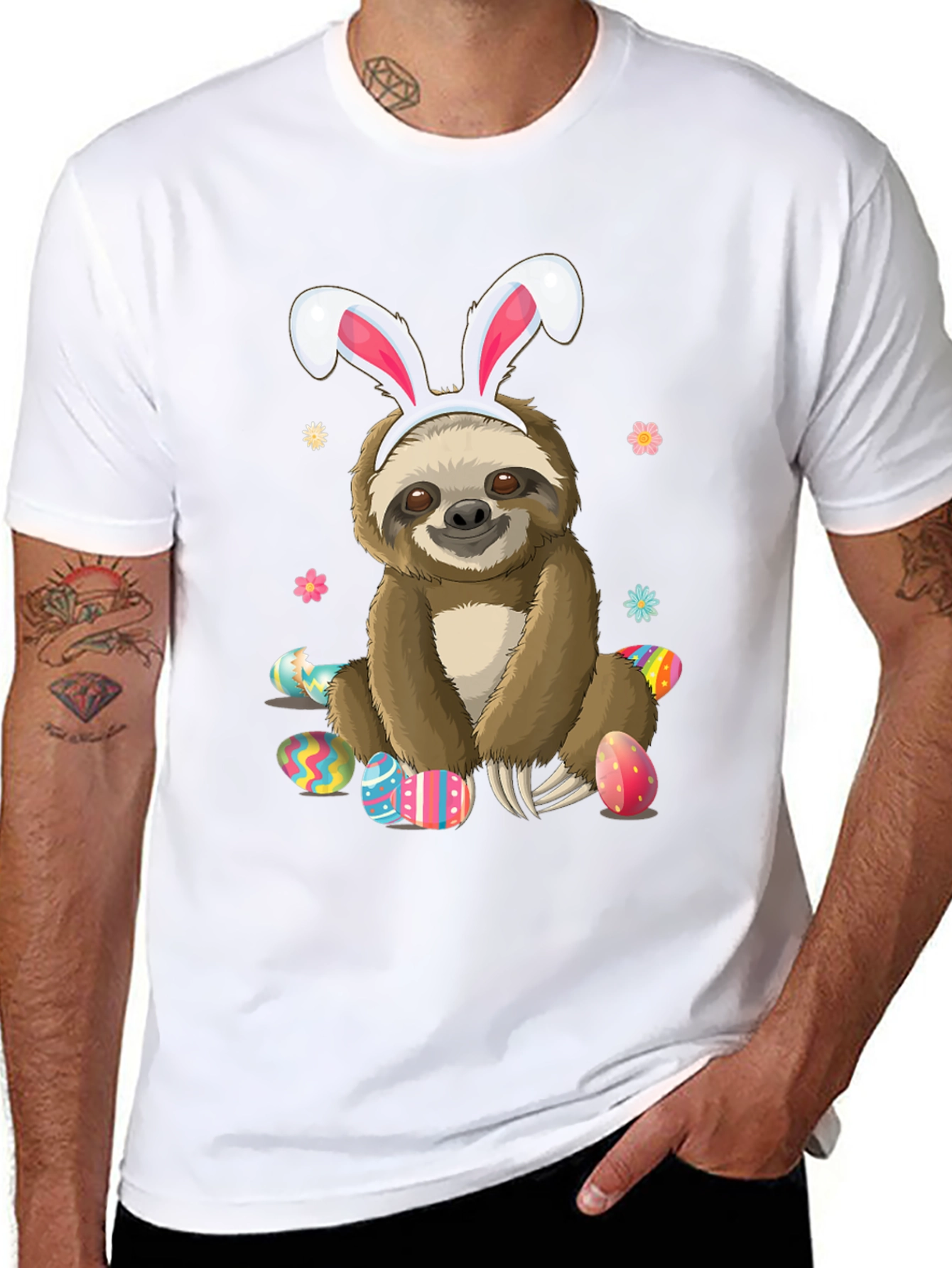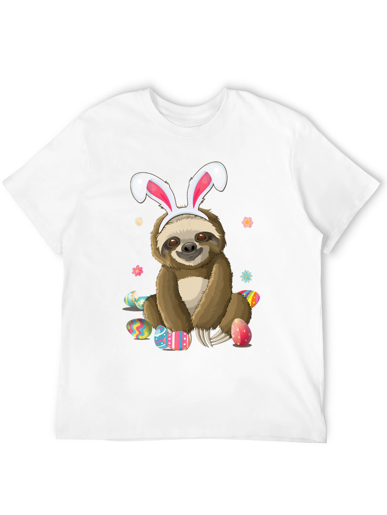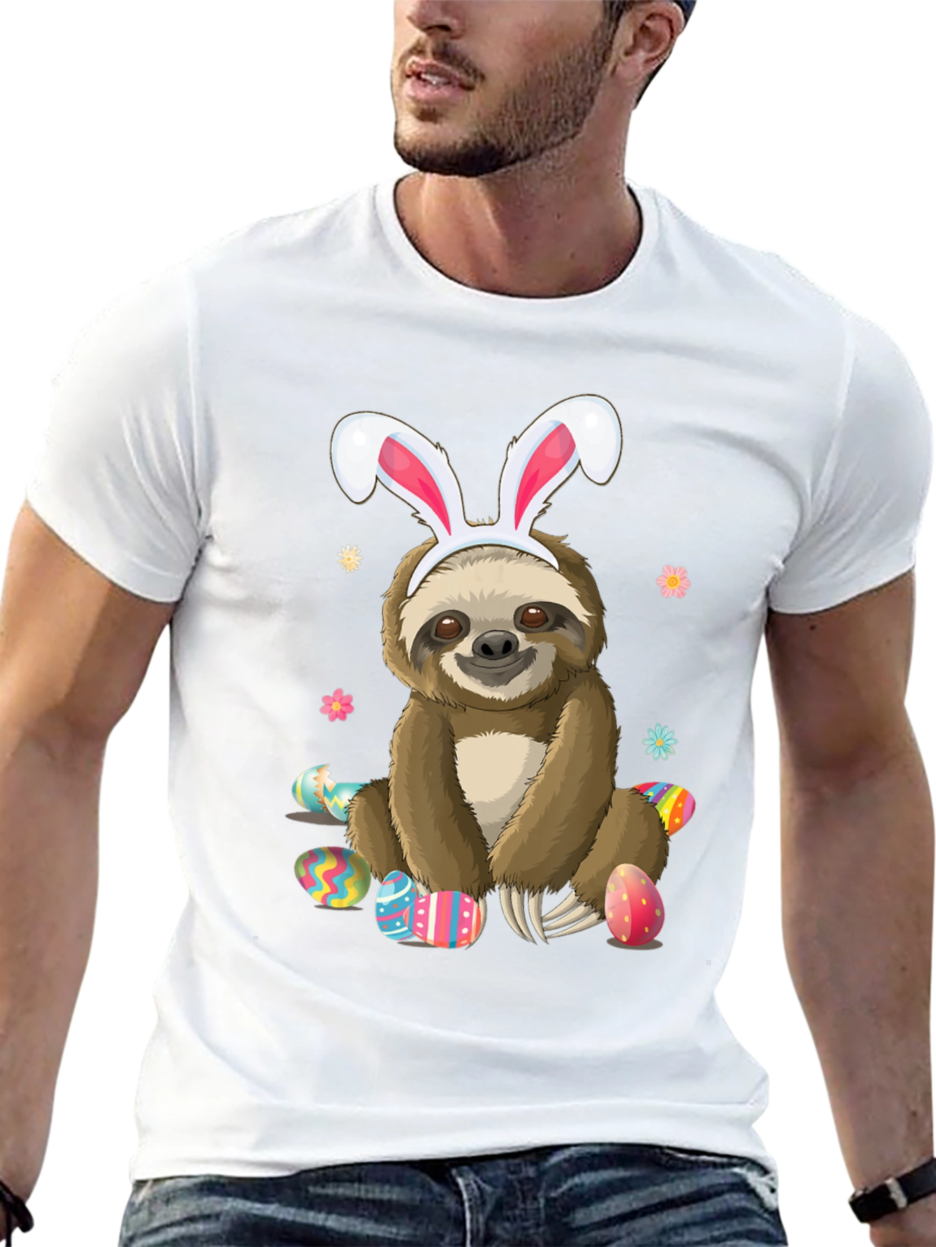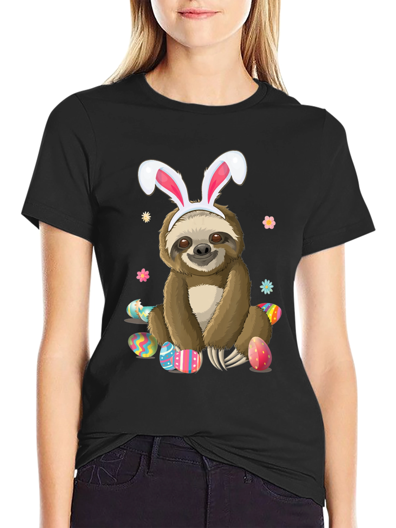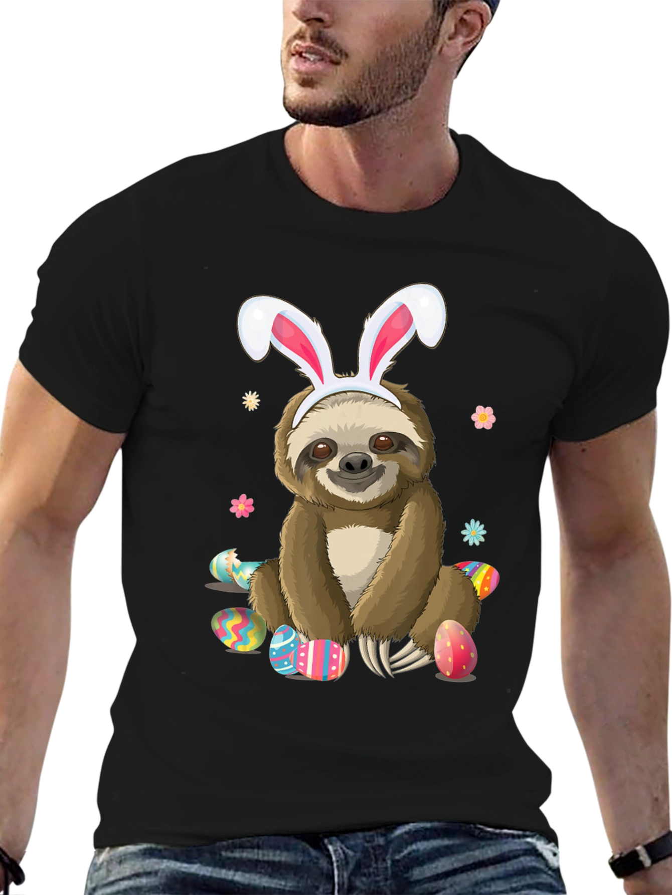Celebrate Easter in style with this adorable black t-shirt featuring a charming sloth wearing bunny ears! The whimsical design includes colorful Easter eggs and flowers, adding a festive touch. Made from comfortable and breathable fabric, this shirt is perfect for casual wear during the holiday season. Show off your love for sloths and Easter with this unique and eye-catching tee. Ideal for family gatherings, egg hunts, or just spreading some Easter cheer. Get yours today and make this Easter extra special!