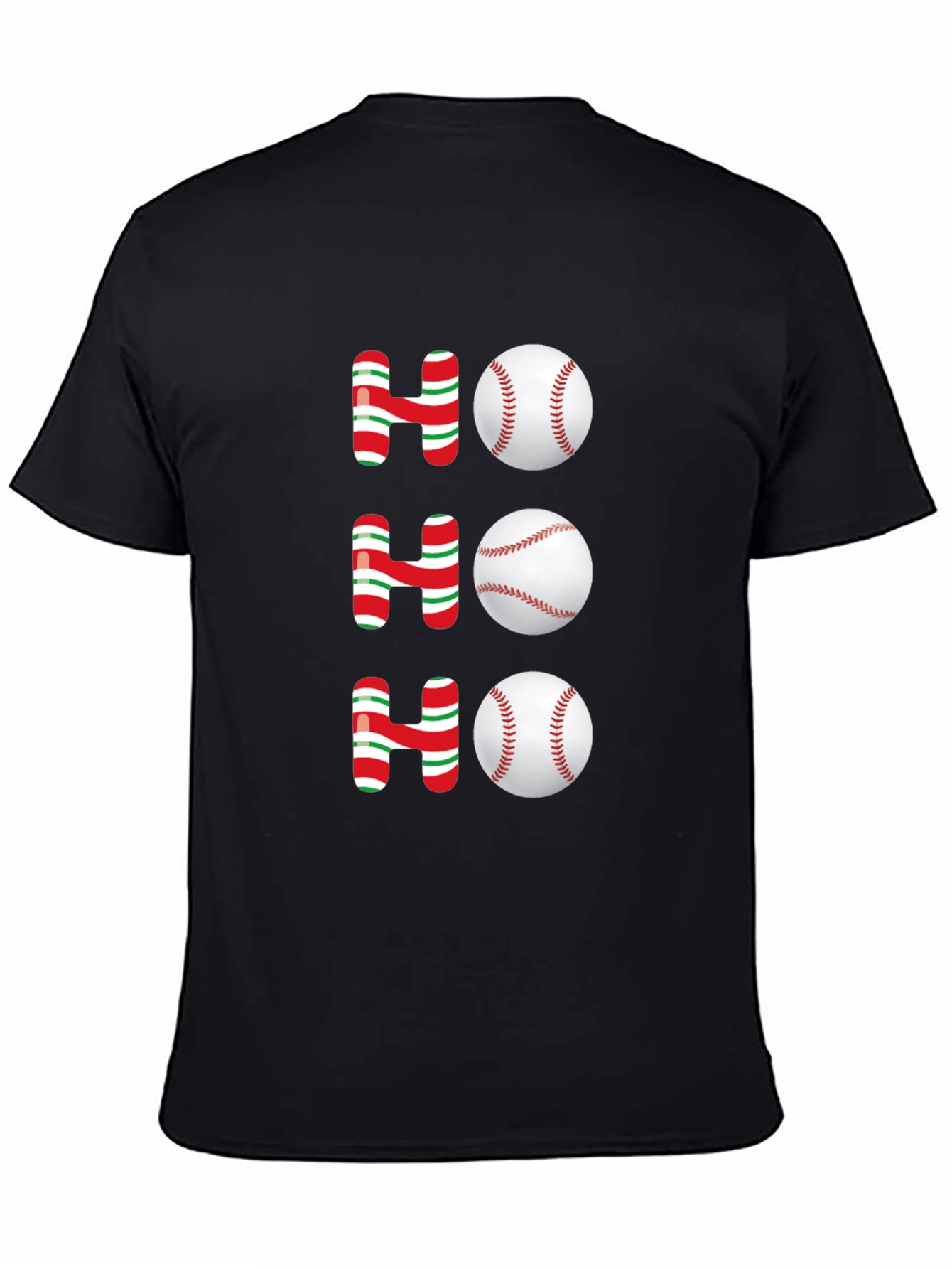 Show your holiday spirit with this festive black t-shirt. Featuring the playful text "HO HO HO" where the "O's" are cleverly replaced with baseballs, this unique design combines the love of the game with holiday cheer. The red and green striped pattern on the "H's" adds a touch of seasonal flair. Made from a comfortable-looking fabric, this t-shirt is perfect for casual wear during the holiday season or as a fun gift for baseball enthusiasts with a sense of humor. Wear it to your next holiday gathering, baseball game, or while relaxing at home. It's a guaranteed conversation starter!