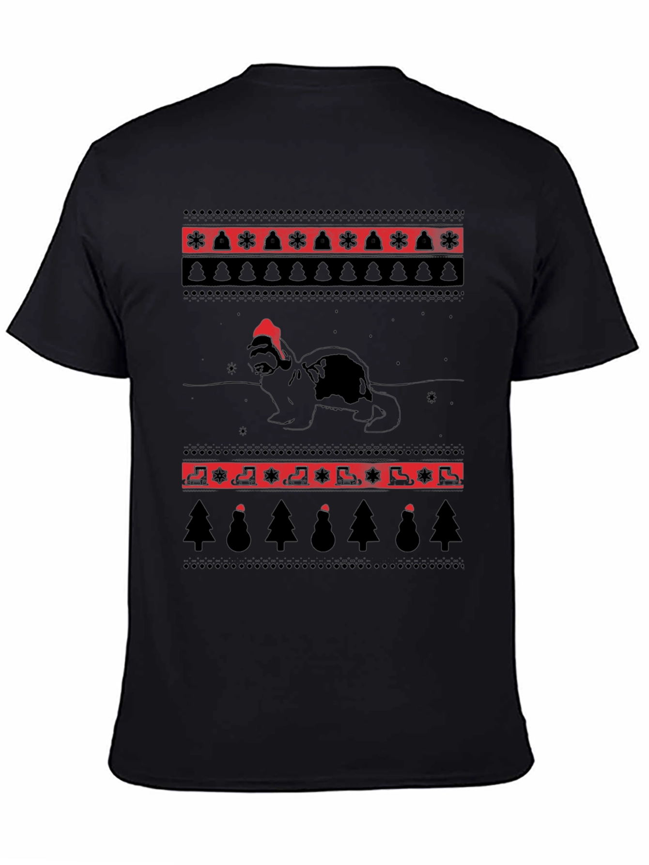 Spread holiday cheer with this unique black t-shirt featuring a whimsical Christmas-themed ferret design! The shirt showcases festive patterns of snowflakes, bells, ice skates, and Christmas trees in classic red and black, creating a playful 'ugly sweater' vibe. A central ferret illustration adds a touch of quirky charm, making this tee perfect for animal lovers and holiday enthusiasts alike. Made from comfortable, breathable fabric, this t-shirt is ideal for casual wear during the festive season. Dress it up with jeans and a jacket for holiday parties or wear it around the house while trimming the tree. Get ready to receive compliments on your unique holiday style!