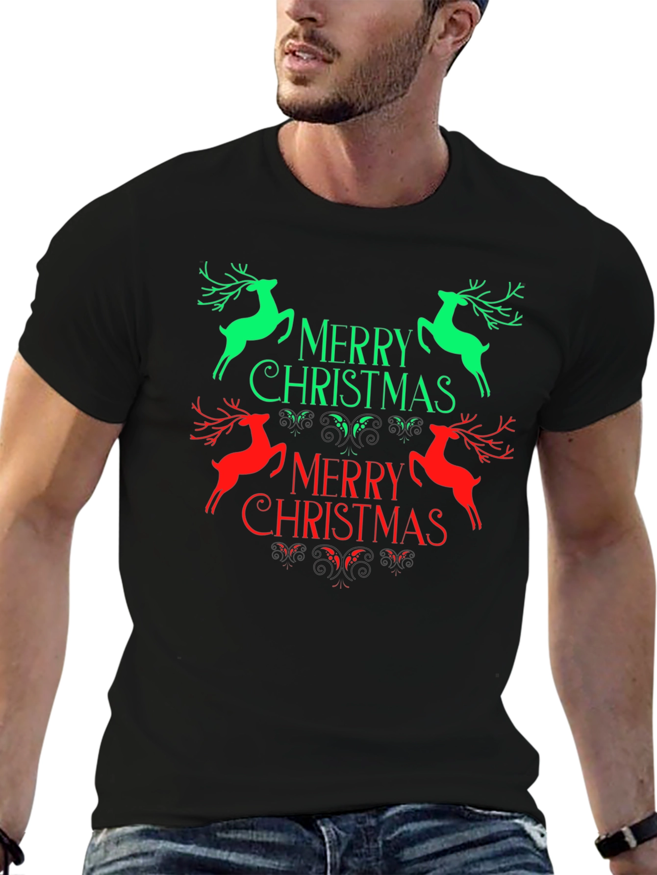 Spread holiday cheer with this eye-catching black t-shirt featuring a vibrant 'Merry Christmas' design. The design includes festive reindeer graphics in bright green and red, adding a playful touch to the classic holiday message. Made from a comfortable-looking fabric, this tee is perfect for casual wear during the Christmas season. Wear it to holiday parties, family gatherings, or just to show off your festive spirit. It's sure to bring a smile to everyone's face and make you the life of the party. Get yours today and celebrate in style!