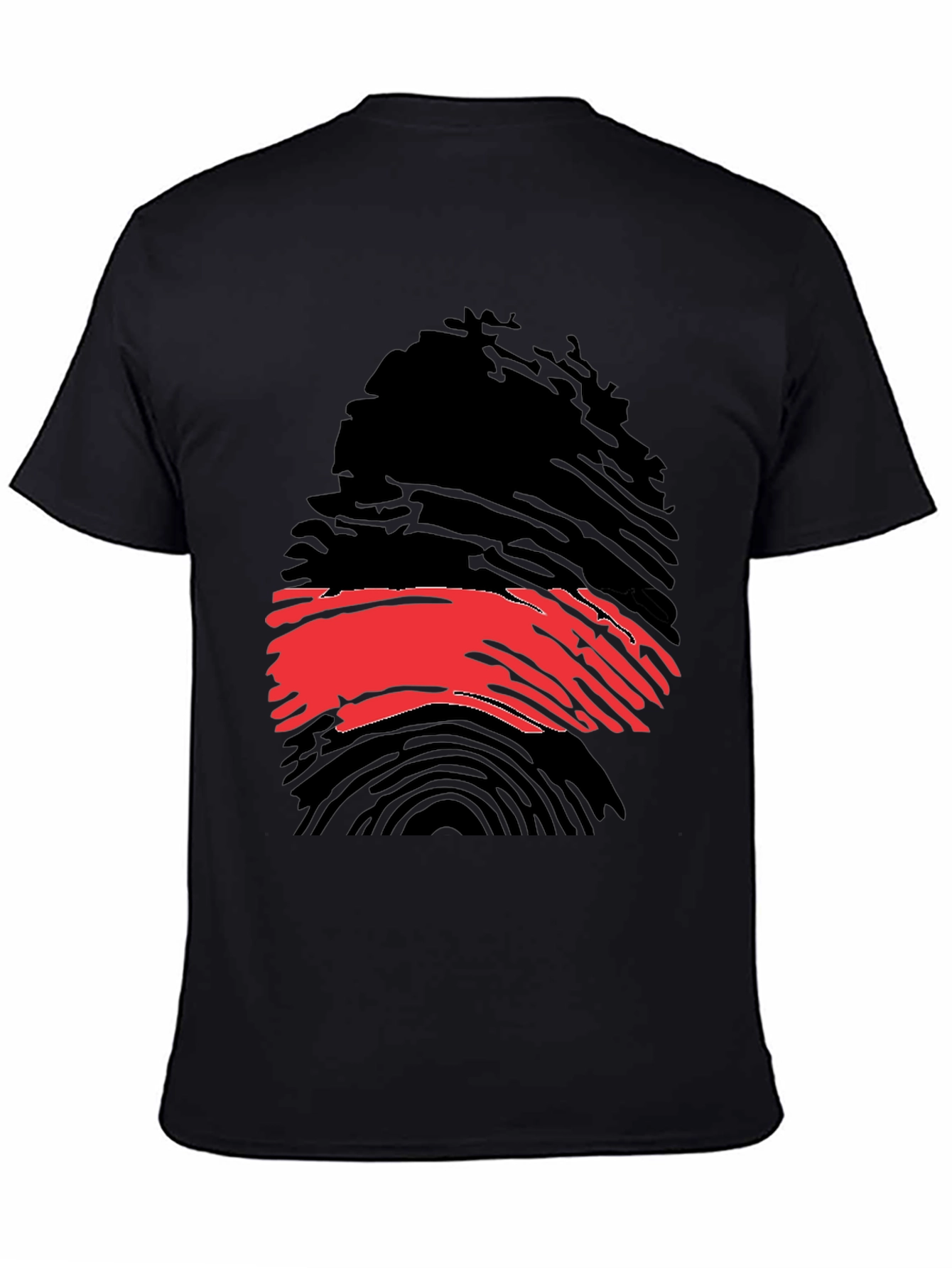 This stylish black tee features a unique fingerprint design with a bold red stripe accent. The eye-catching graphic makes a statement while the soft cotton blend material ensures all-day comfort. The design has an abstract feel with the fingerprint motif. Perfect for casual outings, concerts, or expressing your individual style. Pair it with jeans or shorts for a cool and comfortable look. This t-shirt is a great addition to any wardrobe and a conversation starter wherever you go.