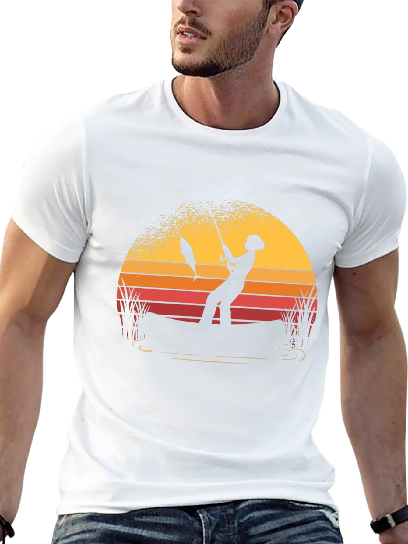 Cast off in style with this unique graphic tee! This black t-shirt features a striking design of a silhouetted fisher catching a fish against a vibrant sunset backdrop. The vintage-inspired design captures the essence of the great outdoors, making it perfect for fishing enthusiasts and nature lovers alike. Made from soft, breathable cotton, this shirt offers all-day comfort and a relaxed fit. Ideal for casual wear, fishing trips, or as a gift for the angler in your life. Wear your passion with this eye-catching fishing tee!