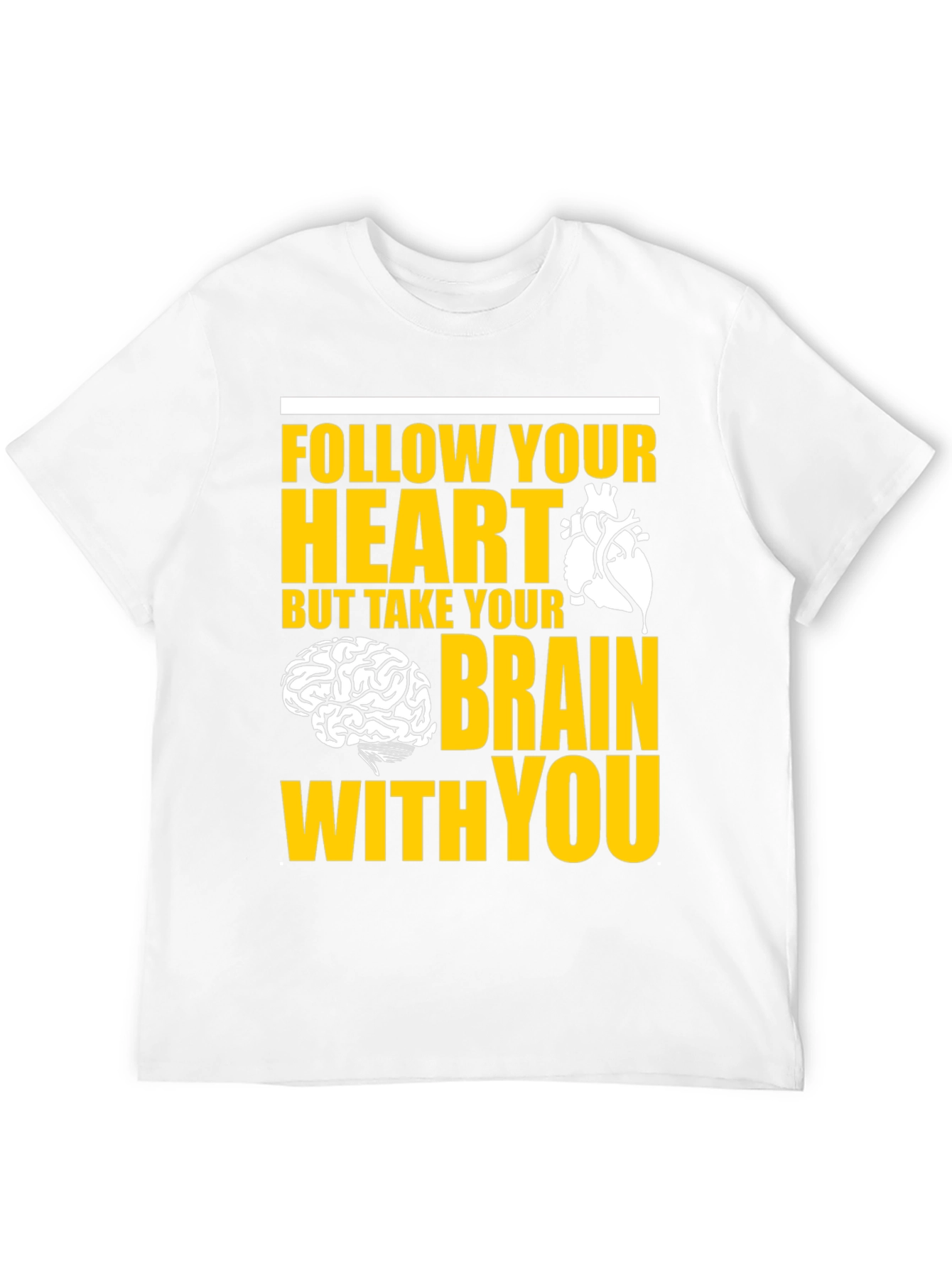 Show off your smarts with this clever graphic tee! The black t-shirt features a bold yellow print that reads 'Follow Your Heart But Take Your Brain With You', accompanied by illustrations of a heart and brain. Made from a soft, comfortable fabric, this shirt is perfect for everyday wear. Whether you're hitting the books or hanging out with friends, this shirt is sure to spark conversation and turn heads. Makes a great gift for the intelligent and humorous individual in your life. Grab yours today and wear your wit!