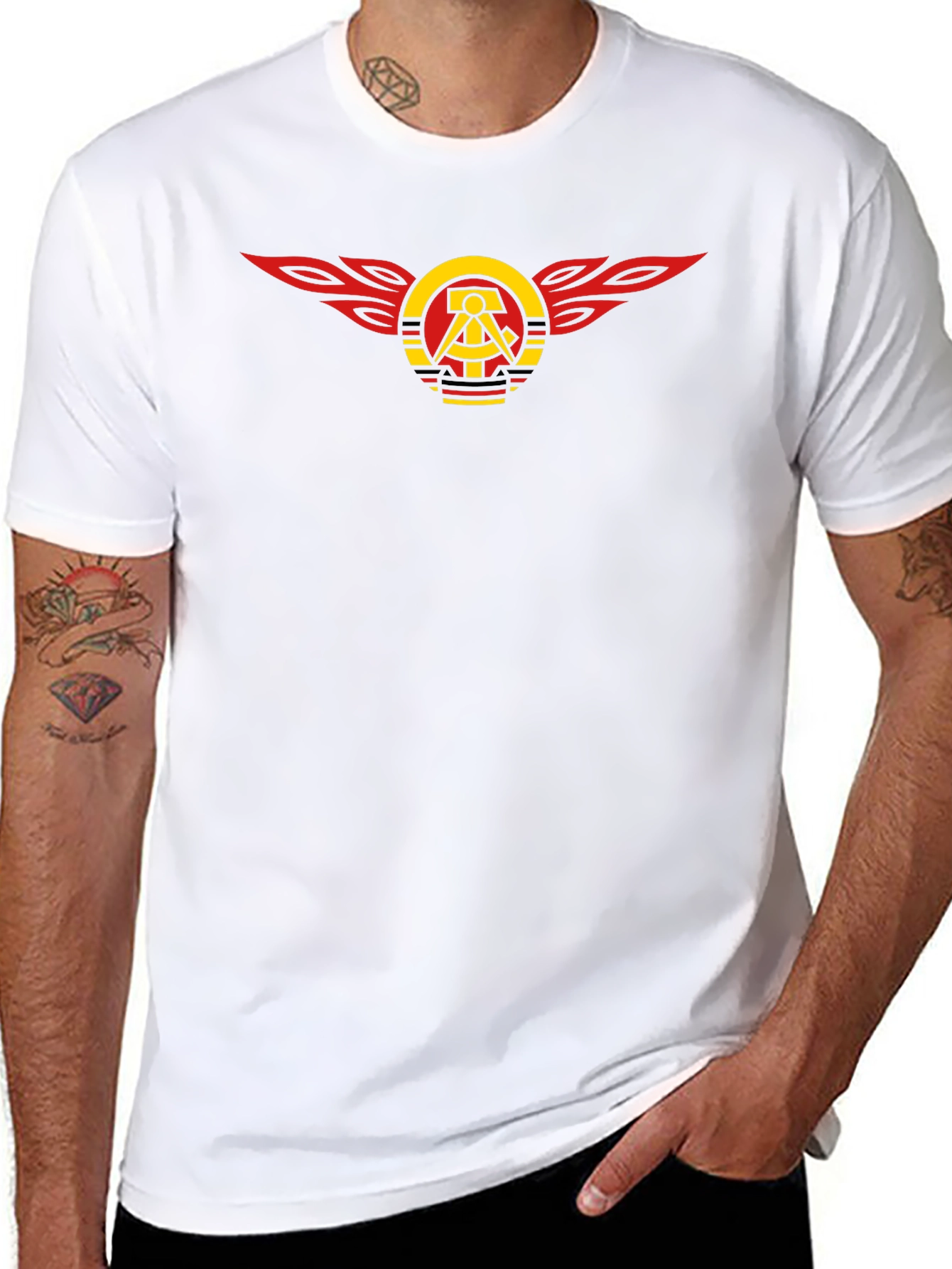 Show off your unique style with this eye-catching black t-shirt! The shirt features a striking graphic design with the classic hammer and compass symbol surrounded by bold red and yellow wings. The clean, crisp print ensures that the design pops against the dark fabric. Made from a comfortable, breathable material, this tee is perfect for everyday wear. Whether you're out with friends or relaxing at home, this t-shirt will keep you looking and feeling great. Make a statement and add this iconic piece to your wardrobe today!
