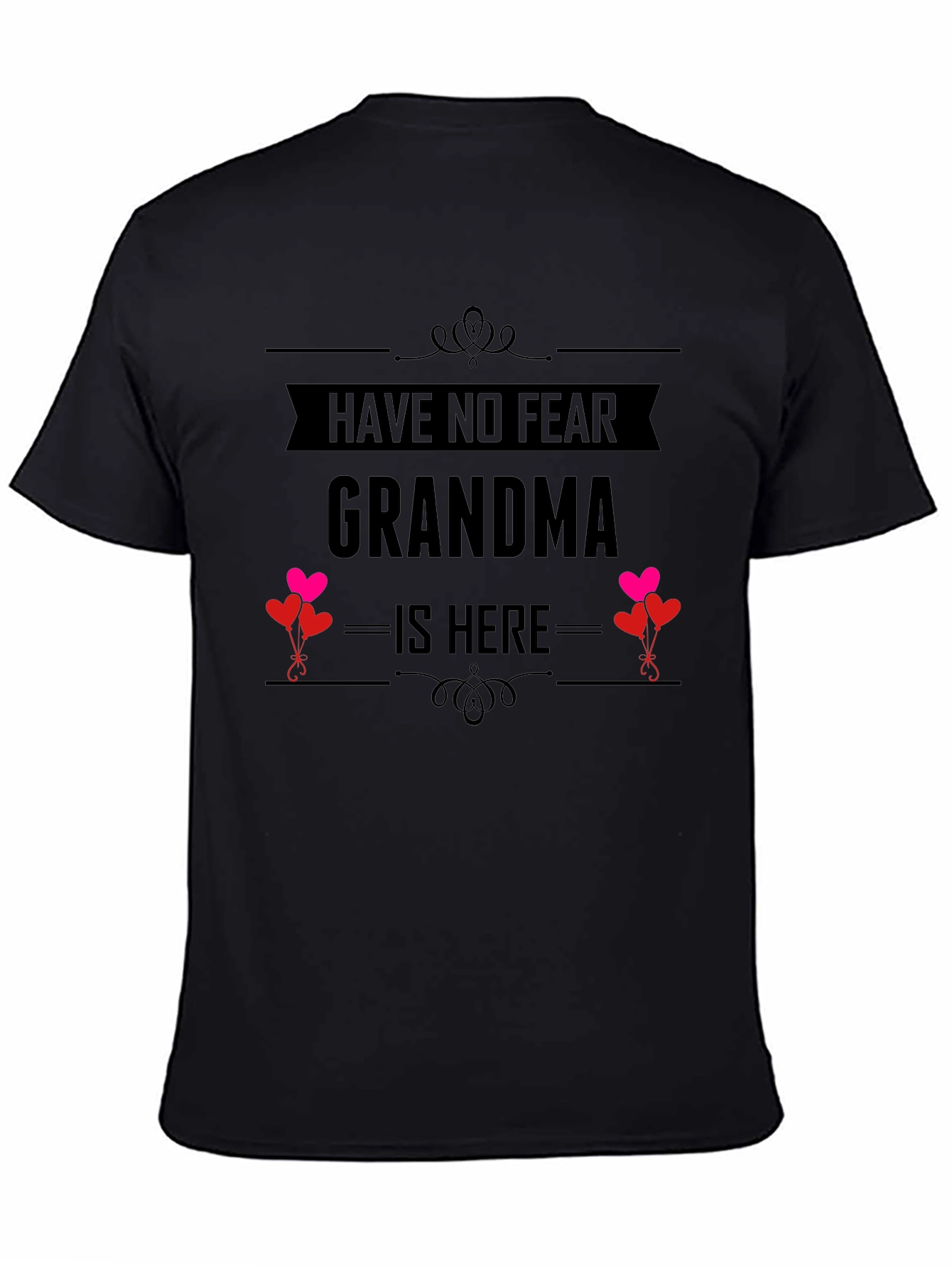 This classic black t-shirt features a humorous and heartwarming message: "HAVE NO FEAR, GRANDMA IS HERE". The design includes decorative lines above and below the text, as well as cute heart-shaped balloon graphics on either side. Perfect for showing appreciation for a special grandma in your life, this tee is sure to bring a smile. Made from a comfortable-looking fabric, it's ideal for everyday wear. Surprise your grandma with this unique and fun gift, or wear it yourself to let everyone know you're ready to save the day! A great conversation starter and a stylish way to express love for grandma.