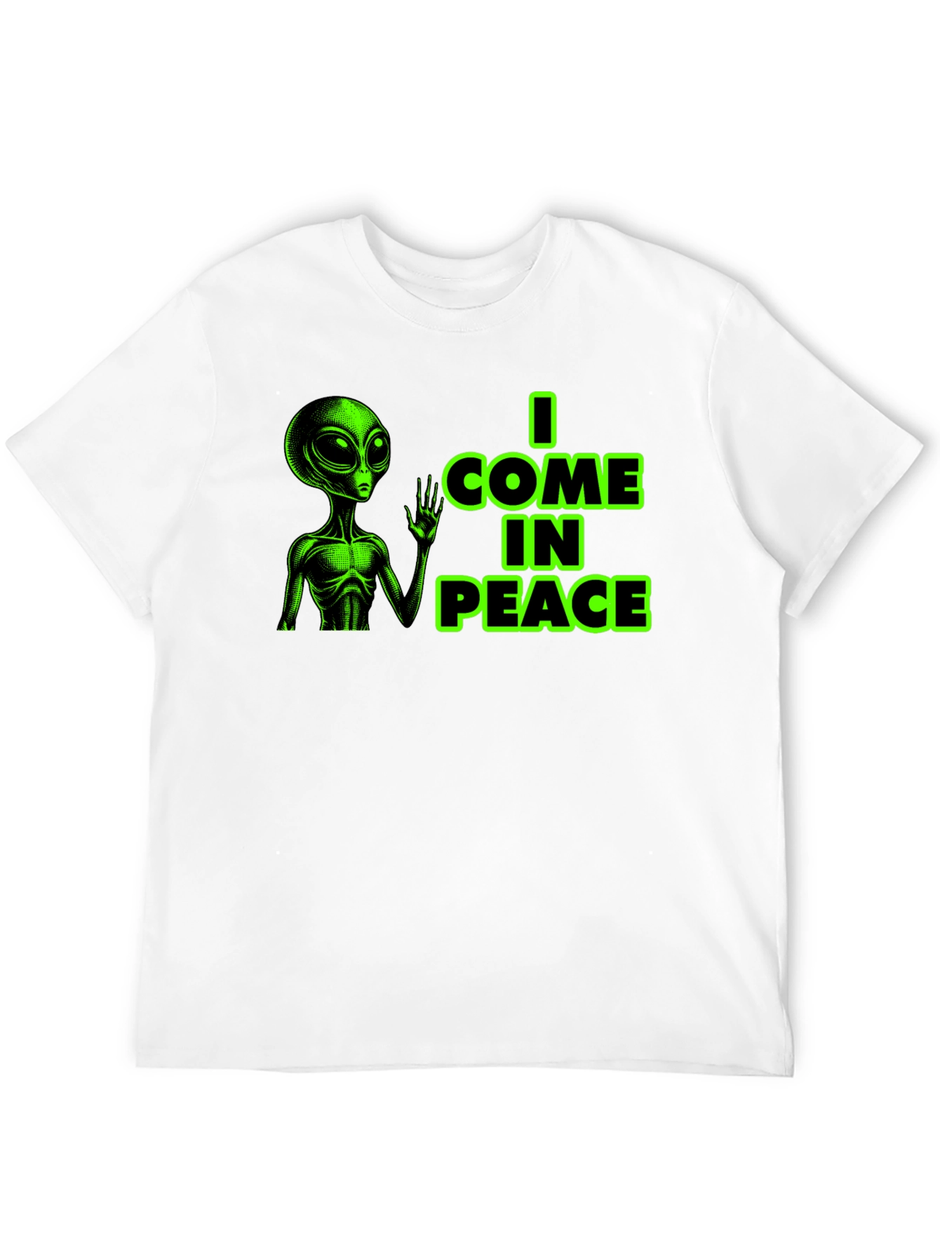 Make a statement with this bold black T-shirt featuring a vibrant green alien graphic and the phrase "I Come In Peace." The design showcases a friendly alien waving, adding a playful yet intriguing touch to your wardrobe. Crafted from a soft, comfortable fabric, this tee is perfect for casual wear, themed events, or sparking conversations. Its eye-catching print ensures you'll stand out from the crowd, expressing your unique sense of humor and style. Whether you're a sci-fi enthusiast or simply love quirky fashion, this T-shirt is a must-have addition to your collection. Pair it with jeans, shorts, or a jacket for a versatile and effortlessly cool look.