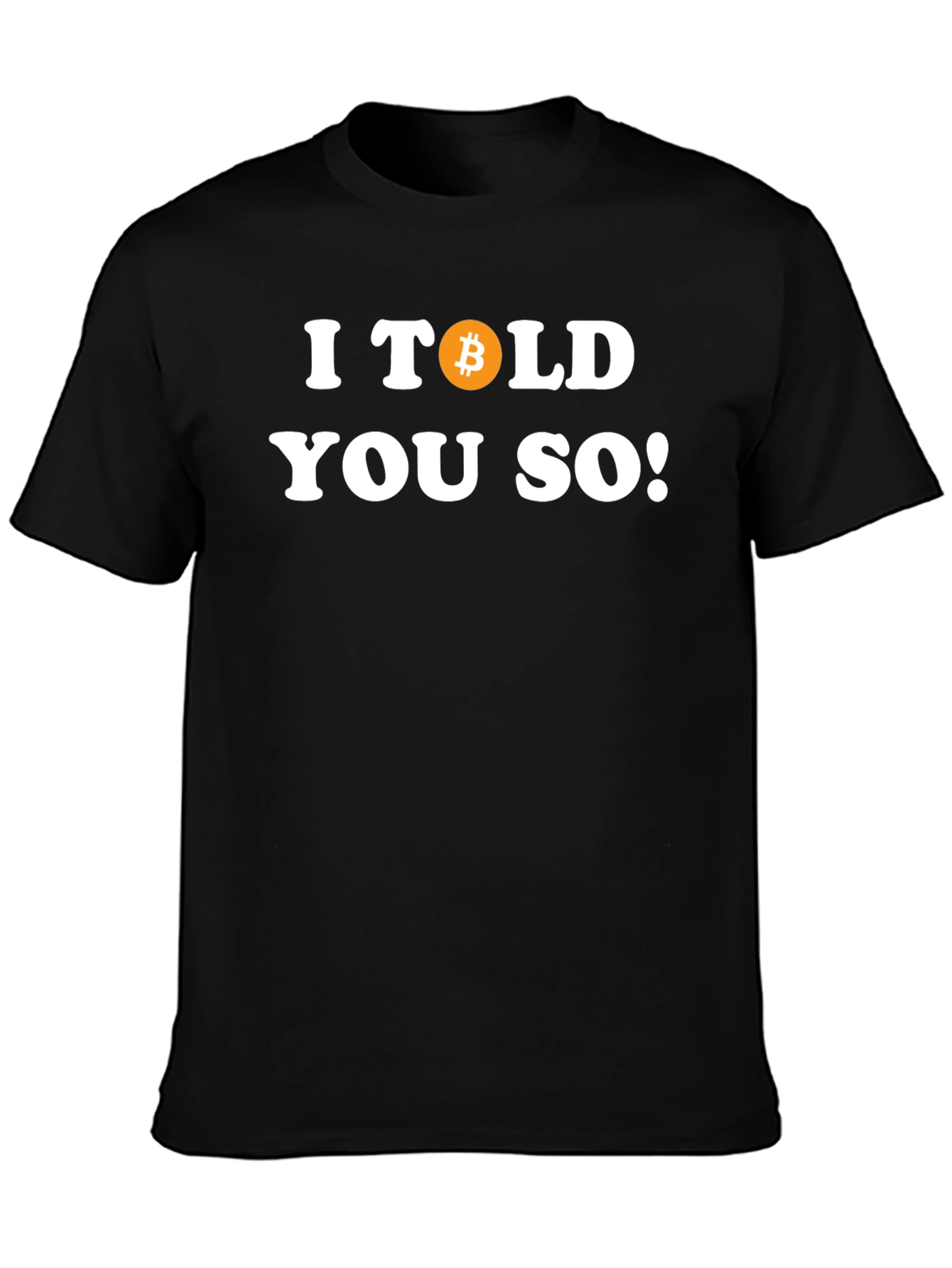 Show your crypto pride with this bold "I Told You So!" t-shirt. Featuring a prominent Bitcoin symbol, this statement tee is perfect for crypto enthusiasts who want to make a statement. Made from a comfortable black fabric, this casual shirt is suitable for everyday wear. Make a statement and celebrate your successful crypto investments with this must-have tee! Great for casual outings, crypto meetups, or as a conversation starter.