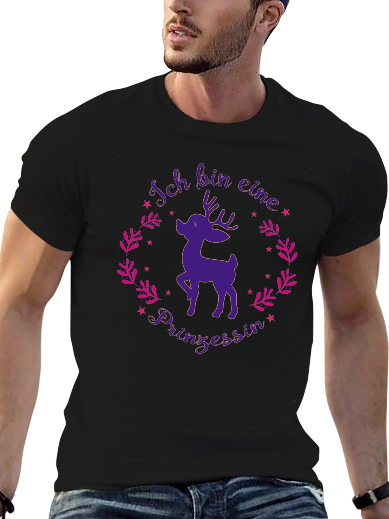 This black t-shirt features a charming graphic design, perfect for those who embrace their inner princess. The design showcases a purple reindeer encircled by a whimsical wreath of stylized pink leaves and stars, complemented by the German phrase "Ich Bin Eine Prinzessin." Ideal for casual wear, this tee adds a touch of playful elegance to any outfit. Made from a comfortable fabric, this t-shirt is perfect for expressing your fun-loving personality. Wear it with jeans or leggings for a casual yet stylish look, or dress it up with a skirt for a more polished ensemble.