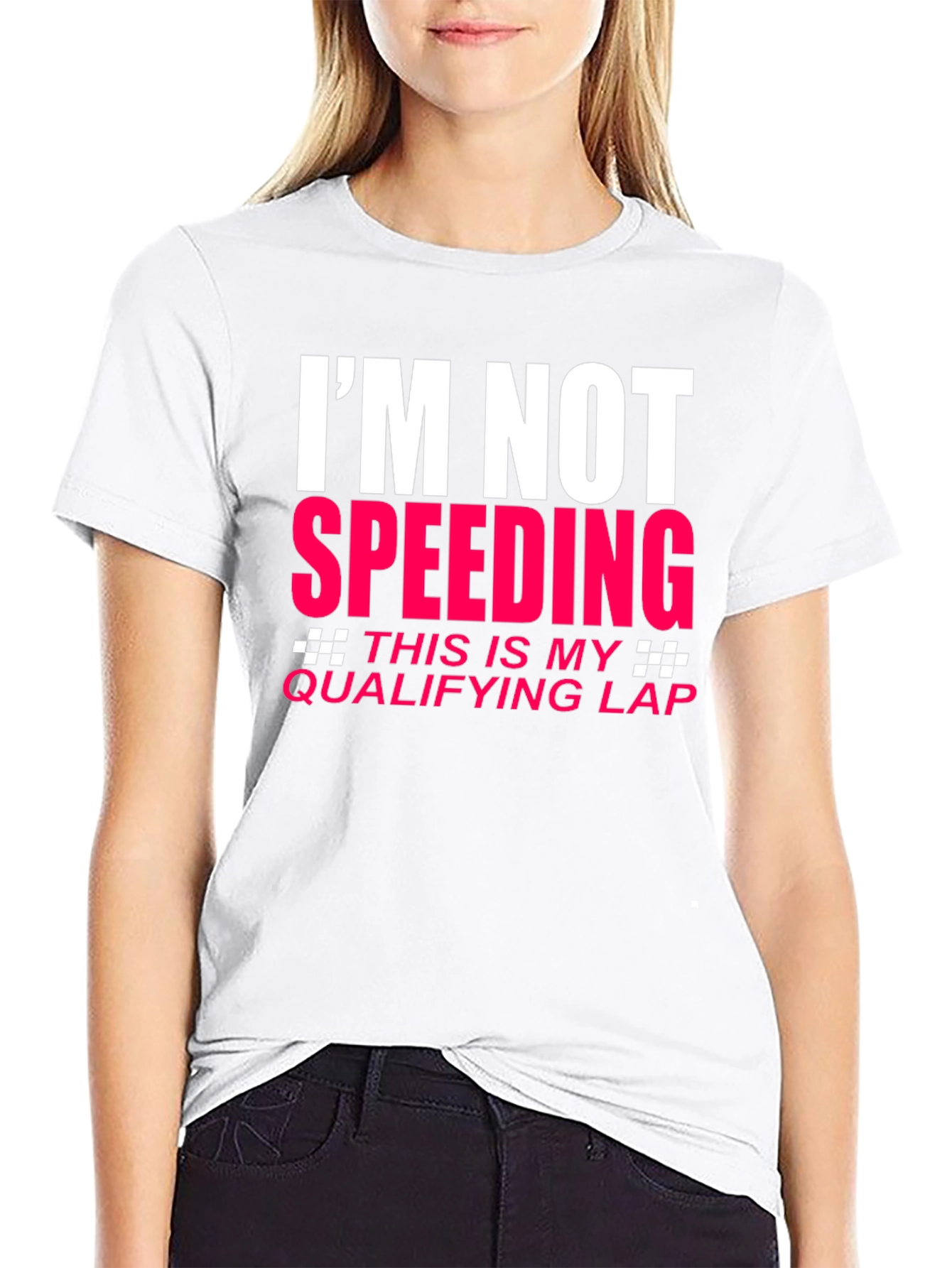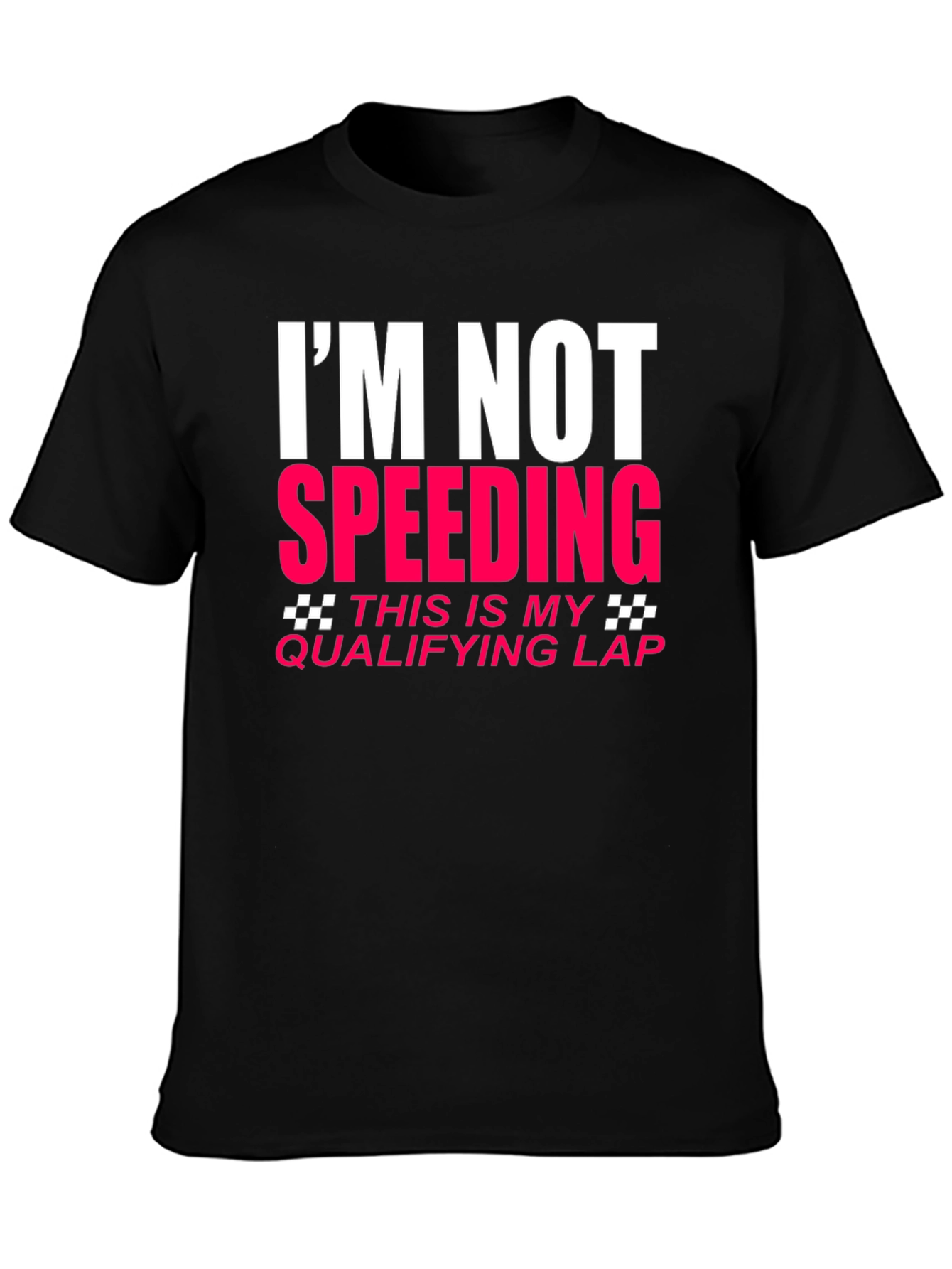 This classic fit black t-shirt features a bold white and pink graphic that reads "I'M NOT SPEEDING THIS IS MY QUALIFYING LAP" with checkered flag accents. The playful design is perfect for race car enthusiasts and anyone with a need for speed. Crafted from a comfortable, breathable fabric, this tee is ideal for everyday wear, casual outings, or a day at the track. Show off your sense of humor and racing spirit with this unique and eye-catching t-shirt. A fun and stylish addition to any wardrobe!