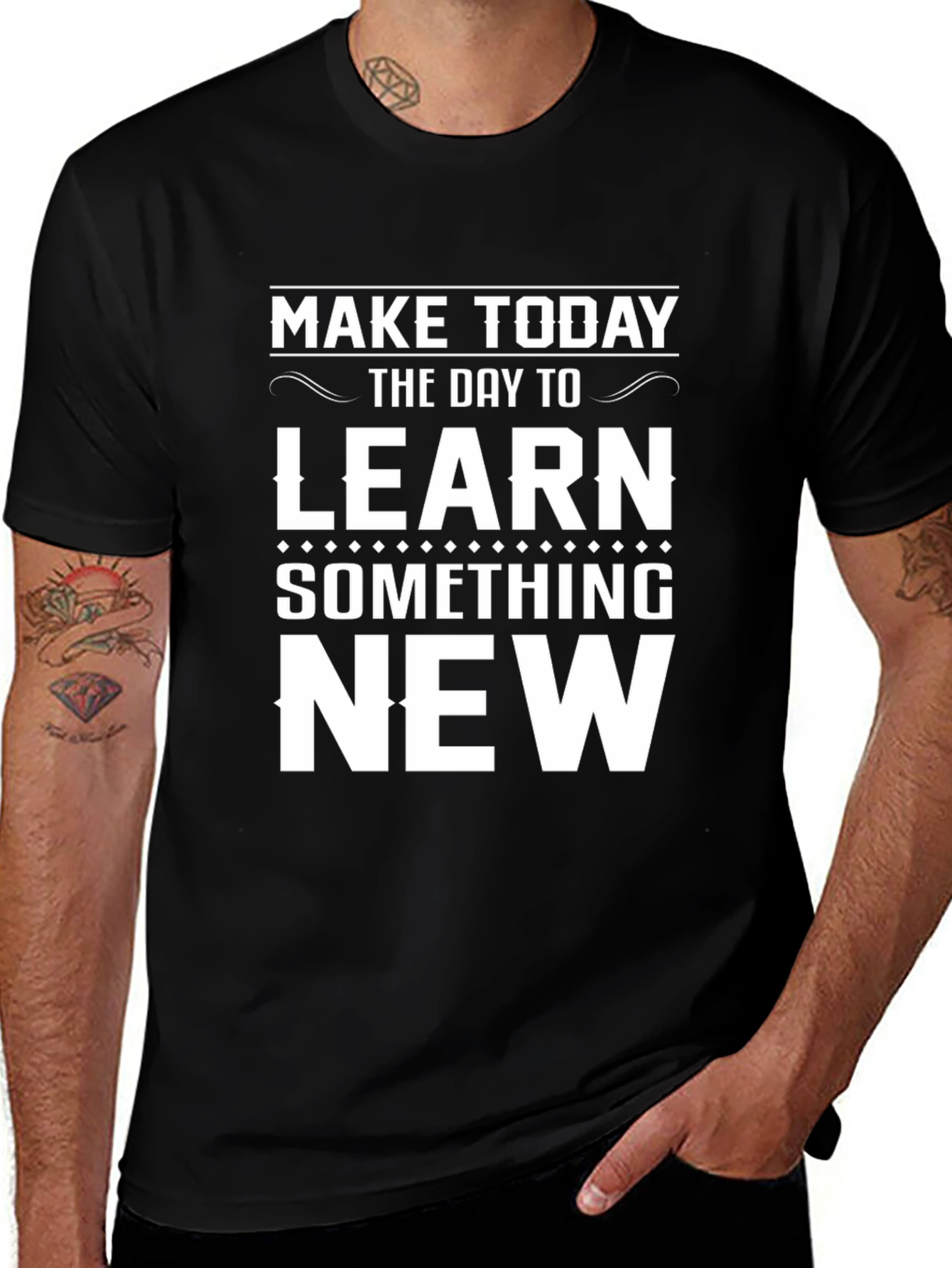 This classic black t-shirt features an inspiring graphic print in bold white lettering, encouraging the wearer to 'Make Today the Day to Learn Something New.' The design is simple, yet impactful, making it a great addition to any casual wardrobe. Made from what appears to be a soft and comfortable cotton blend, this short-sleeved tee is perfect for everyday wear. The shirt's relaxed fit ensures all-day comfort, whether you're running errands, relaxing at home, or meeting friends. Express your thirst for knowledge and inspire others with this stylish and thought-provoking tee. It's more than just clothing; it's a statement about lifelong learning.