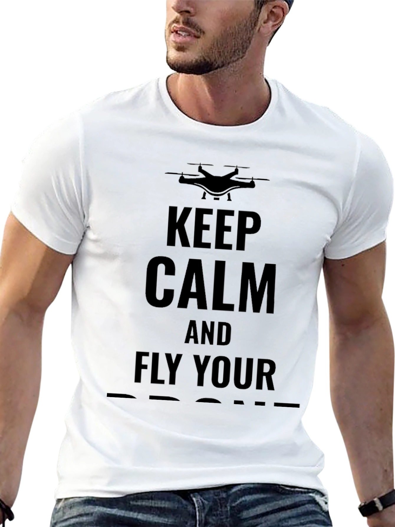 This black t-shirt features a bold graphic design with a silhouette of a drone above the phrase "KEEP CALM AND FLY YOUR DRONE" in prominent, capitalized letters. The tee appears to be made from a soft, comfortable cotton blend, judging by its smooth texture. The classic crew neck and short sleeves make it suitable for casual wear. Ideal for drone enthusiasts, hobbyists, and professionals who want to express their passion. This unique tee can be worn for casual outings, drone meetups, or as a fun everyday statement piece.