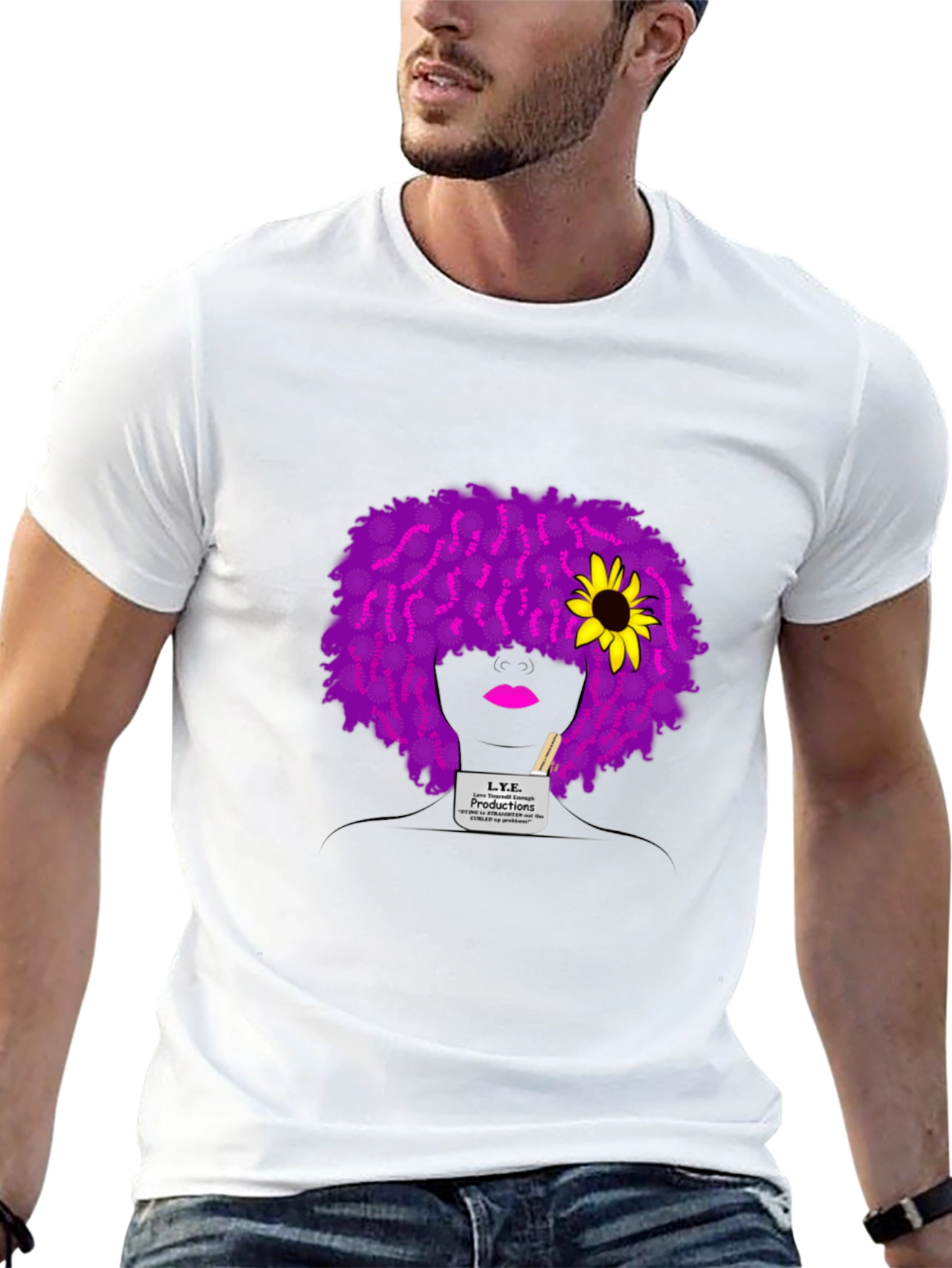 Make a statement with this eye-catching black t-shirt featuring a unique graphic design. The design includes a stylized silhouette with vibrant purple hair adorned with a bright yellow sunflower. The focal point of the graphic is the "L.Y.E. Productions" logo, adding a touch of artistic flair. Crafted from comfortable, breathable fabric, this tee is perfect for casual wear. Its classic fit and black color make it versatile and easy to pair with jeans, shorts, or skirts. Whether you're expressing your individuality or simply looking for a stylish and unique addition to your wardrobe, this graphic tee is sure to turn heads and spark conversations.