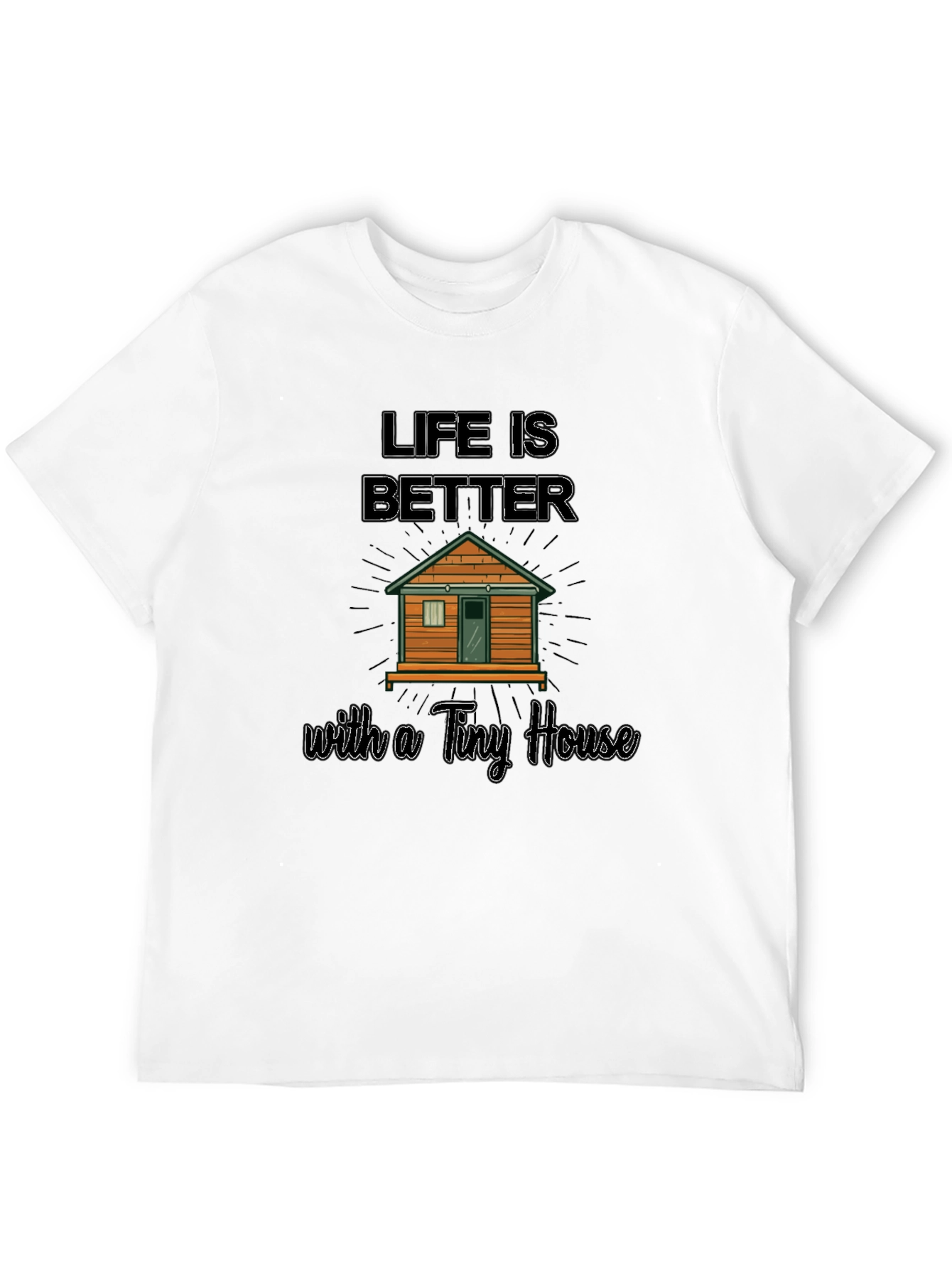 Embrace the tiny house movement with this stylish graphic t-shirt! Featuring a charming illustration of a small house, surrounded by the witty phrase "Life Is Better with a Tiny House", this shirt is perfect for those who appreciate minimalism, adventure, and cozy living. Made from soft, breathable black fabric, this tee ensures a comfortable fit. It's an ideal casual wear choice for expressing your unique lifestyle and passion for simple living. Great conversation starter and gift for tiny house enthusiasts!