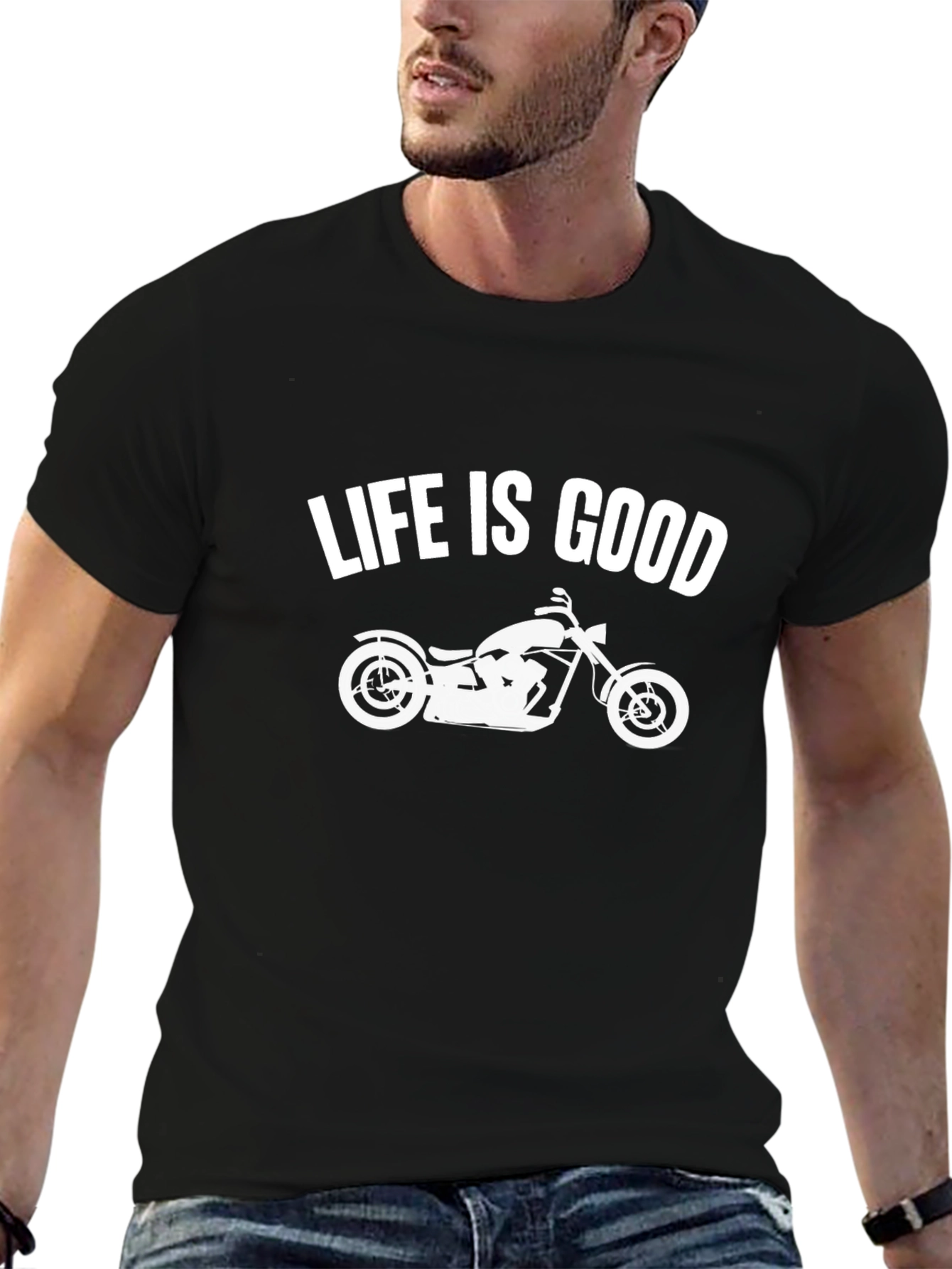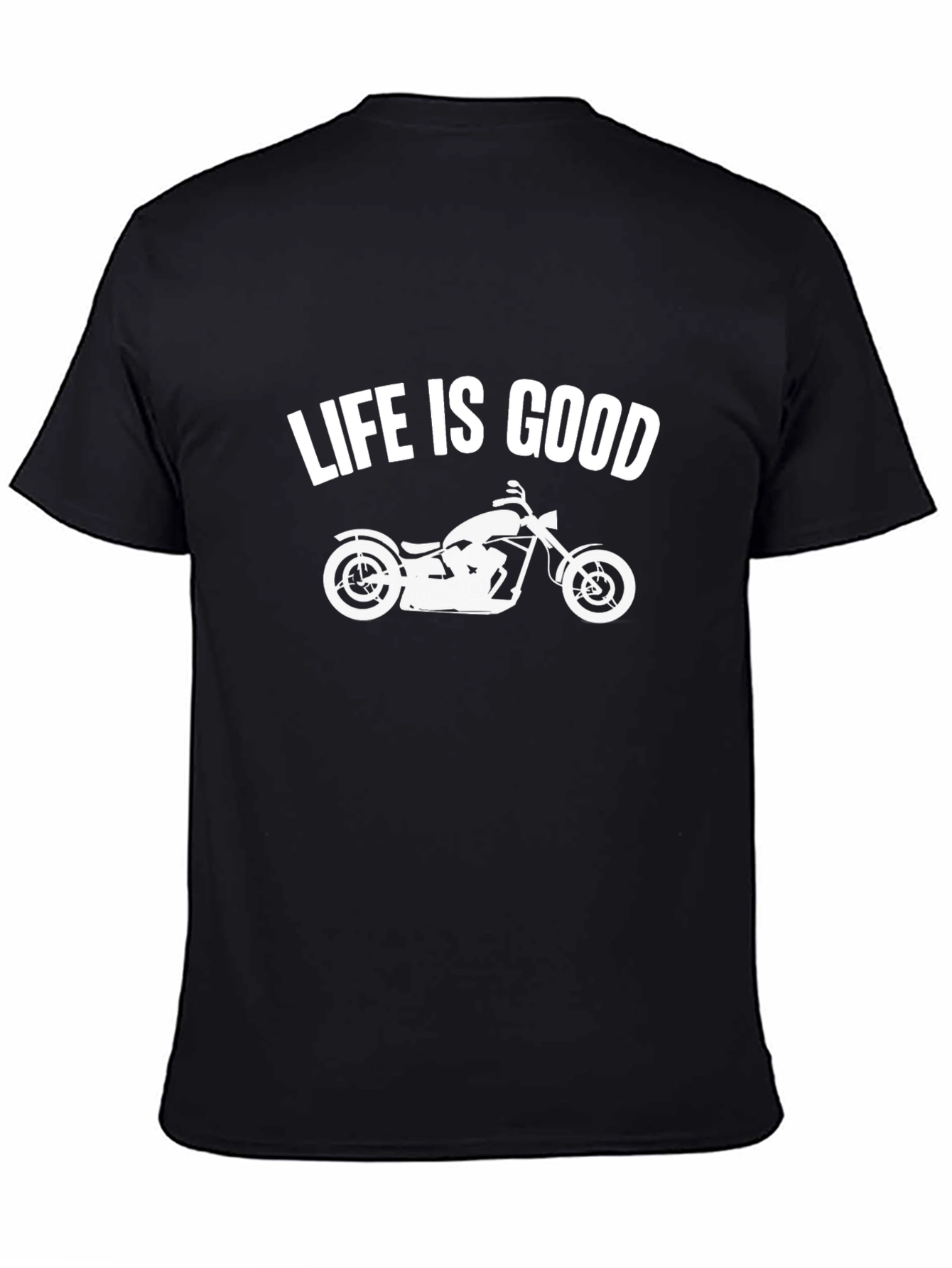 Showcase your love for the open road with this classic black t-shirt. Featuring a bold "Life Is Good" print above a stylish motorcycle graphic, this tee is perfect for riders and enthusiasts alike. Crafted from a comfortable fabric, it's ideal for casual wear, bike meets, or everyday adventures. This short-sleeved shirt offers a relaxed fit, making it a great addition to any wardrobe. Express your passion for riding and good vibes with this standout graphic tee.