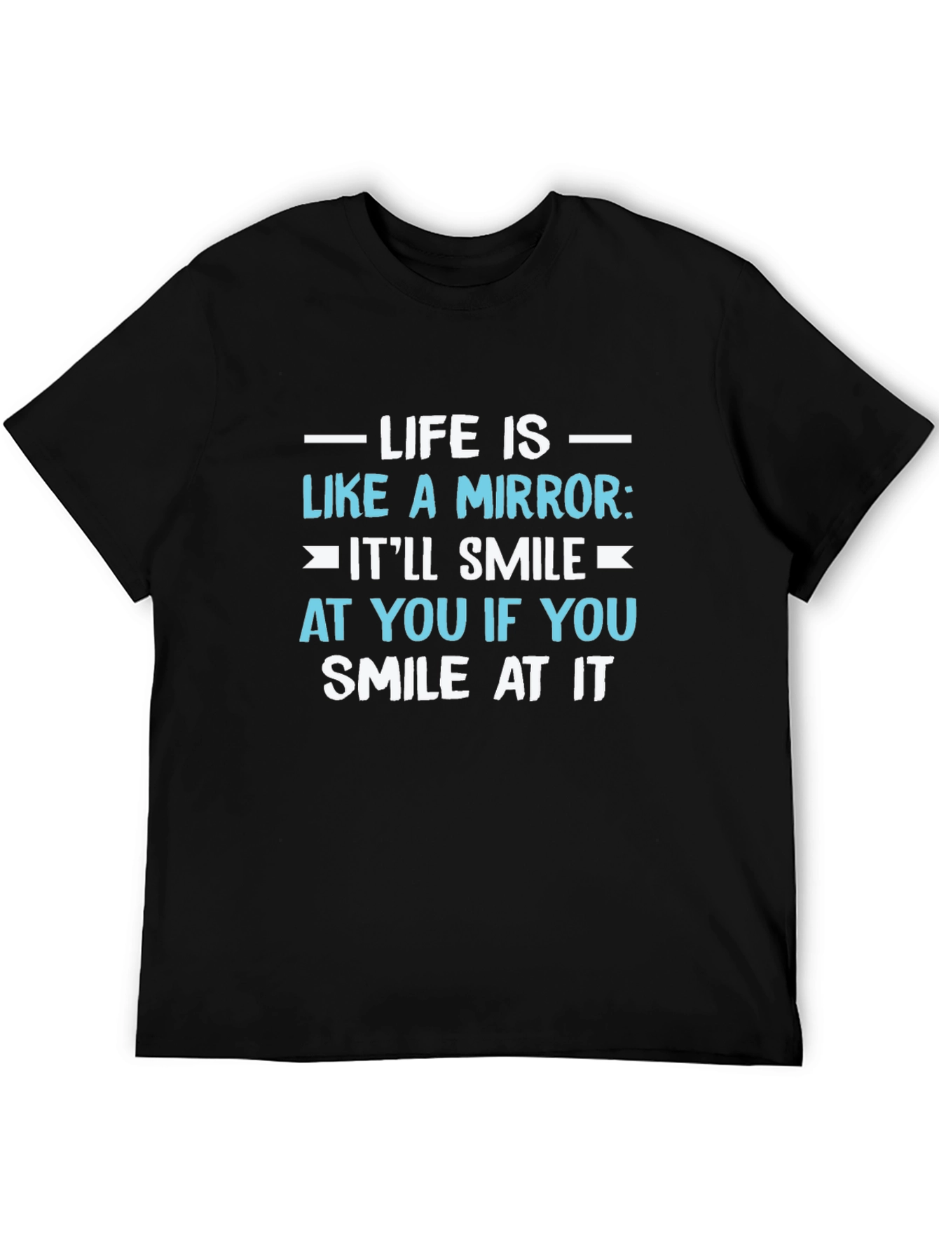 This stylish black t-shirt features a unique and inspiring graphic print. The design showcases the phrase "LIFE IS LIKE A MIRROR: IT'LL SMILE AT YOU IF YOU SMILE AT IT" in a clean, modern font. The t-shirt appears to be made from a soft, comfortable cotton blend, perfect for everyday wear. The classic fit makes it a versatile addition to any wardrobe. Wear it casually with jeans, shorts, or layer it under a jacket for a more dressed-up look. Show off your positive attitude with this eye-catching and meaningful t-shirt.