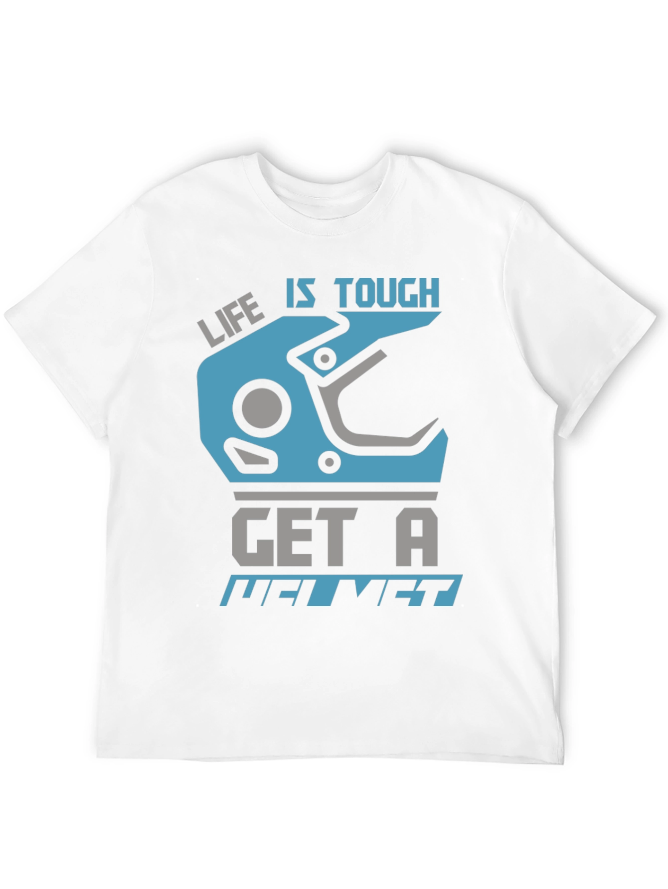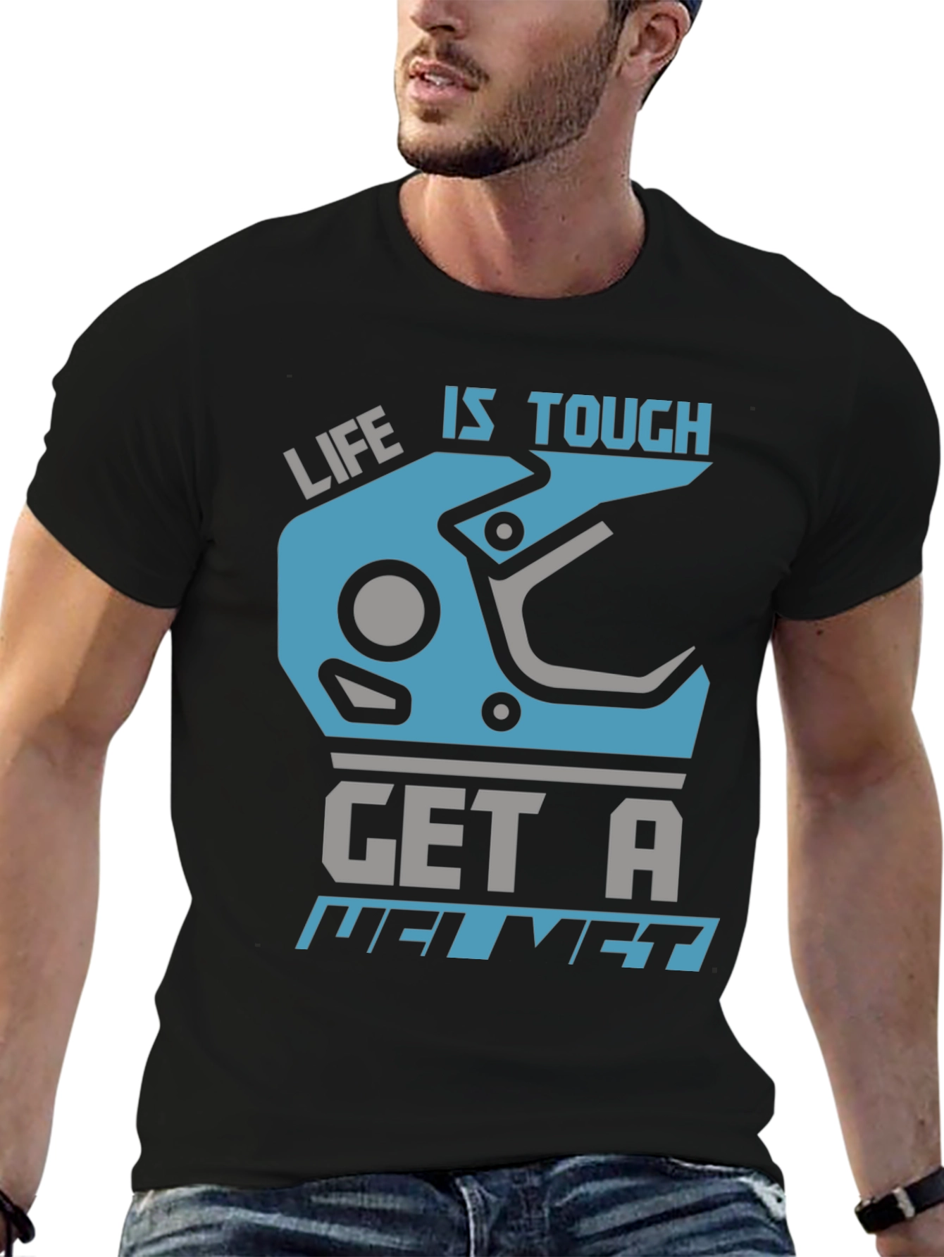 This stylish black t-shirt features a bold graphic design. The central image is a stylized blue and gray motocross helmet, accompanied by the text "Life is Tough" above and "Get a Helmet" below. The design conveys a message of resilience and safety. The t-shirt appears to be made of a comfortable, breathable fabric, ideal for everyday wear. Perfect for motorcycle enthusiasts, adrenaline junkies, or anyone who appreciates a cool, edgy look. Show off your adventurous side with this unique and eye-catching tee. It's a great conversation starter and a statement piece for casual outings.