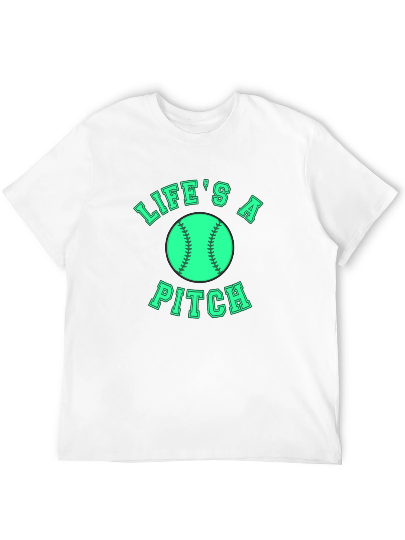Showcase your love for baseball with this stylish and comfortable black t-shirt. The shirt features a vibrant green graphic with the phrase 'Life's a Pitch' artfully arranged around a baseball design. Crafted from soft, breathable fabric, this tee is perfect for everyday wear, game days, or casual outings. Its classic fit ensures a flattering silhouette for all body types. Express your passion for the sport and make a statement with this eye-catching piece. A must-have for any baseball enthusiast's wardrobe!