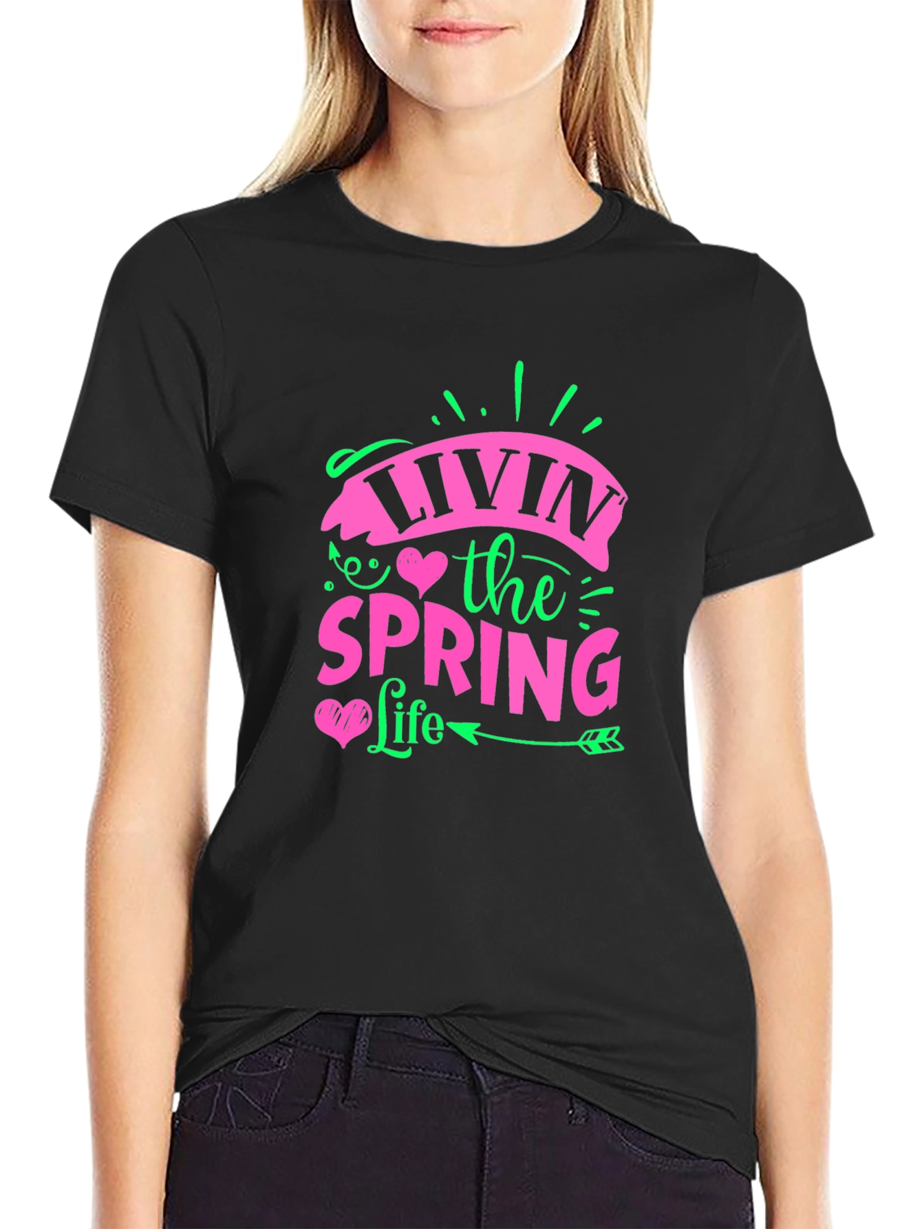 Embrace the season with this eye-catching "Livin' the Spring Life" graphic t-shirt. Featuring a vibrant design in pink and green, this black tee is perfect for adding a pop of color to your wardrobe. The playful graphic includes hearts and an arrow, suggesting a fun and adventurous spirit. Crafted from a comfortable-looking fabric, it's ideal for casual outings, spring festivals, or simply enjoying the warmer weather in style. Show off your love for spring with this unique and stylish t-shirt!