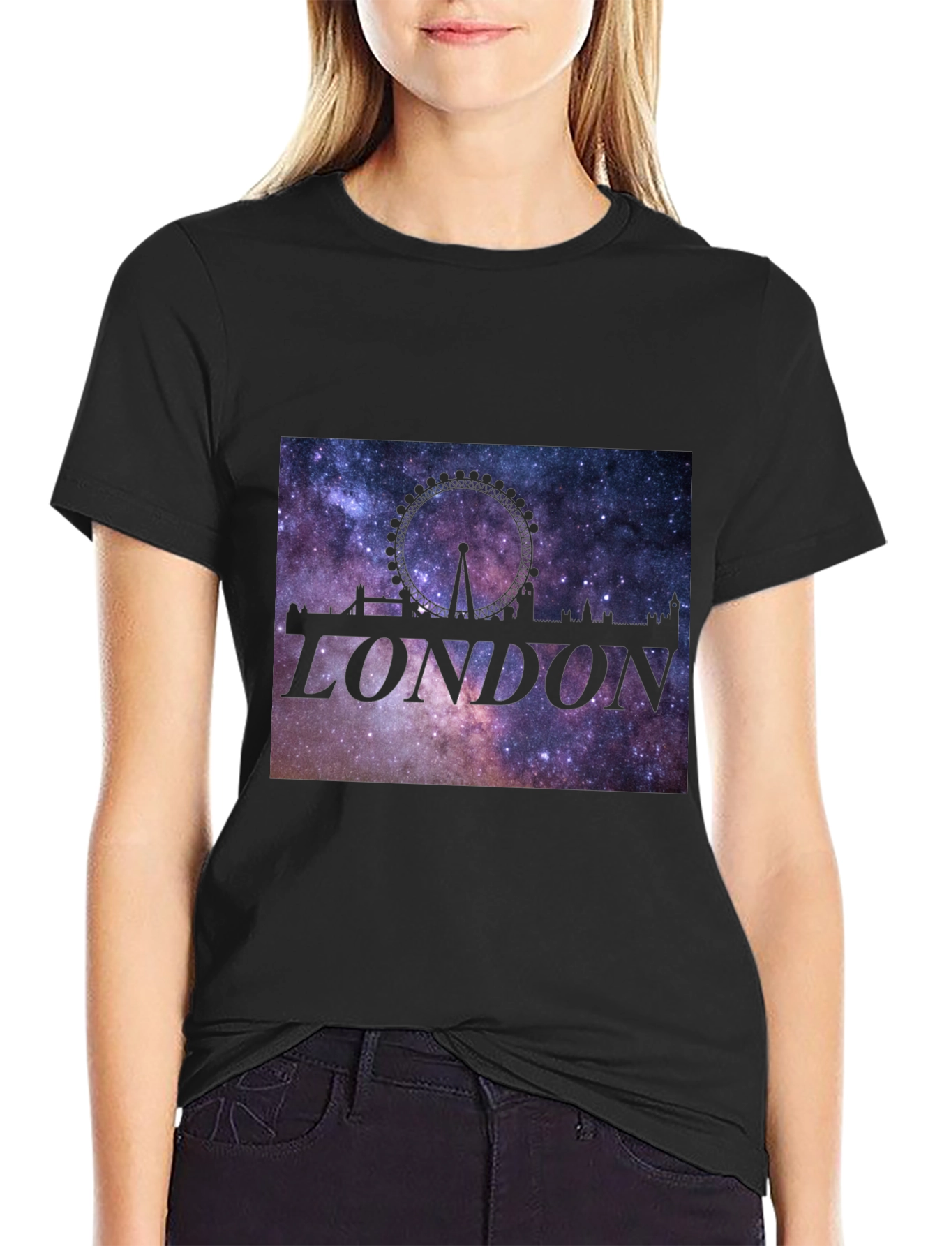 Showcase your love for London with this striking t-shirt! Featuring a sleek black backdrop, the shirt boasts a vibrant graphic of the London skyline with the iconic London Eye against a captivating galaxy background. The word "LONDON" is emblazoned across the image, making it a stylish statement piece. Perfect for casual wear, travel, or as a unique gift, this tee is sure to turn heads. Made with comfortable materials, this t-shirt offers both style and comfort for everyday wear. Grab yours today and celebrate the spirit of London!