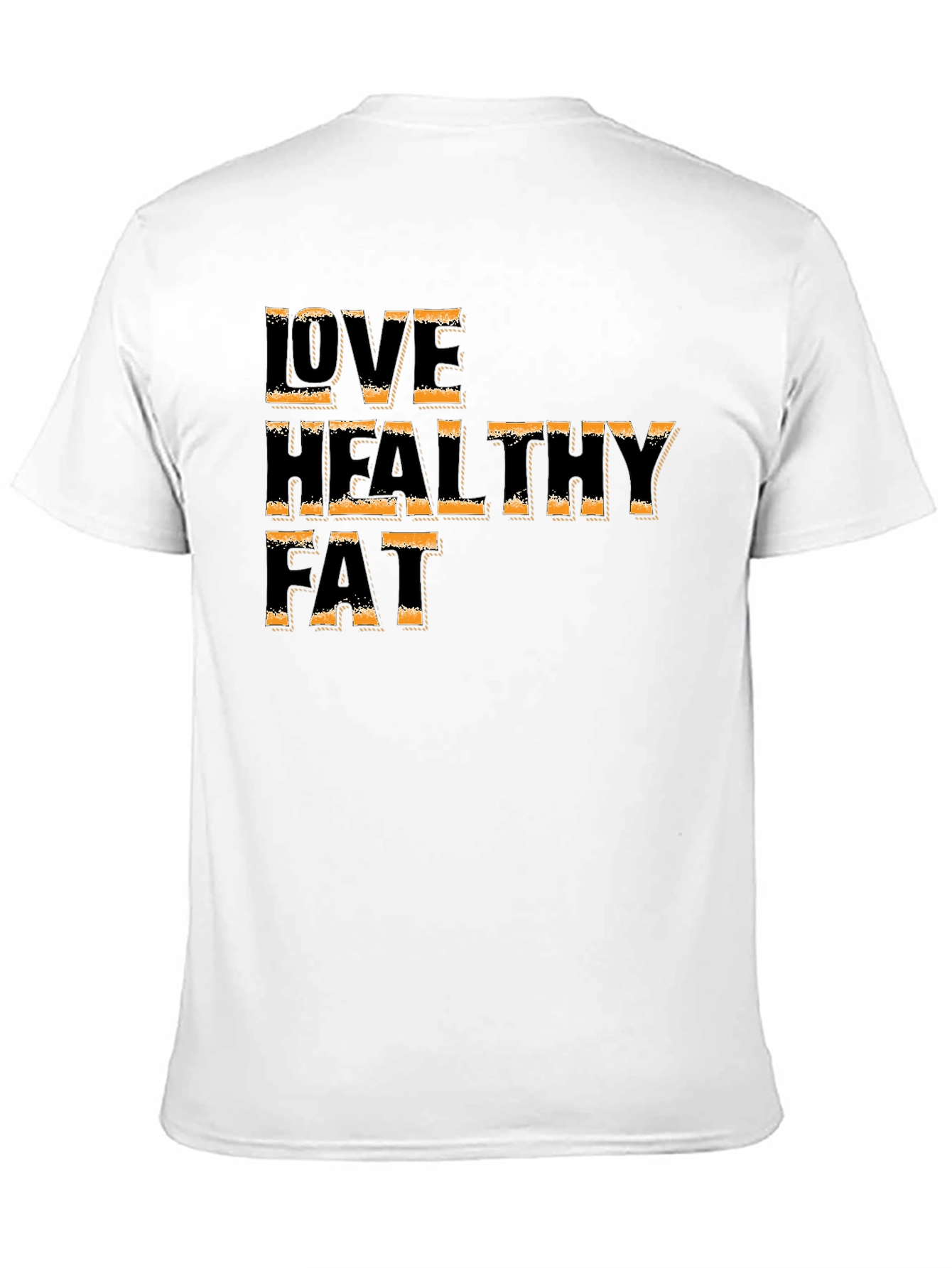 Show your love for healthy fats with this stylish black t-shirt. The tee features a bold, eye-catching graphic design spelling out "LOVE HEALTHY FAT" in a unique, textured font, possibly denim or canvas. Made from a soft, comfortable fabric, this classic fit tee is perfect for everyday wear. Whether you're a fitness enthusiast or just appreciate a good design, this shirt is sure to turn heads. It is suitable for casual occasions, workouts, or simply expressing your healthy lifestyle. Grab this conversation-starter tee today!