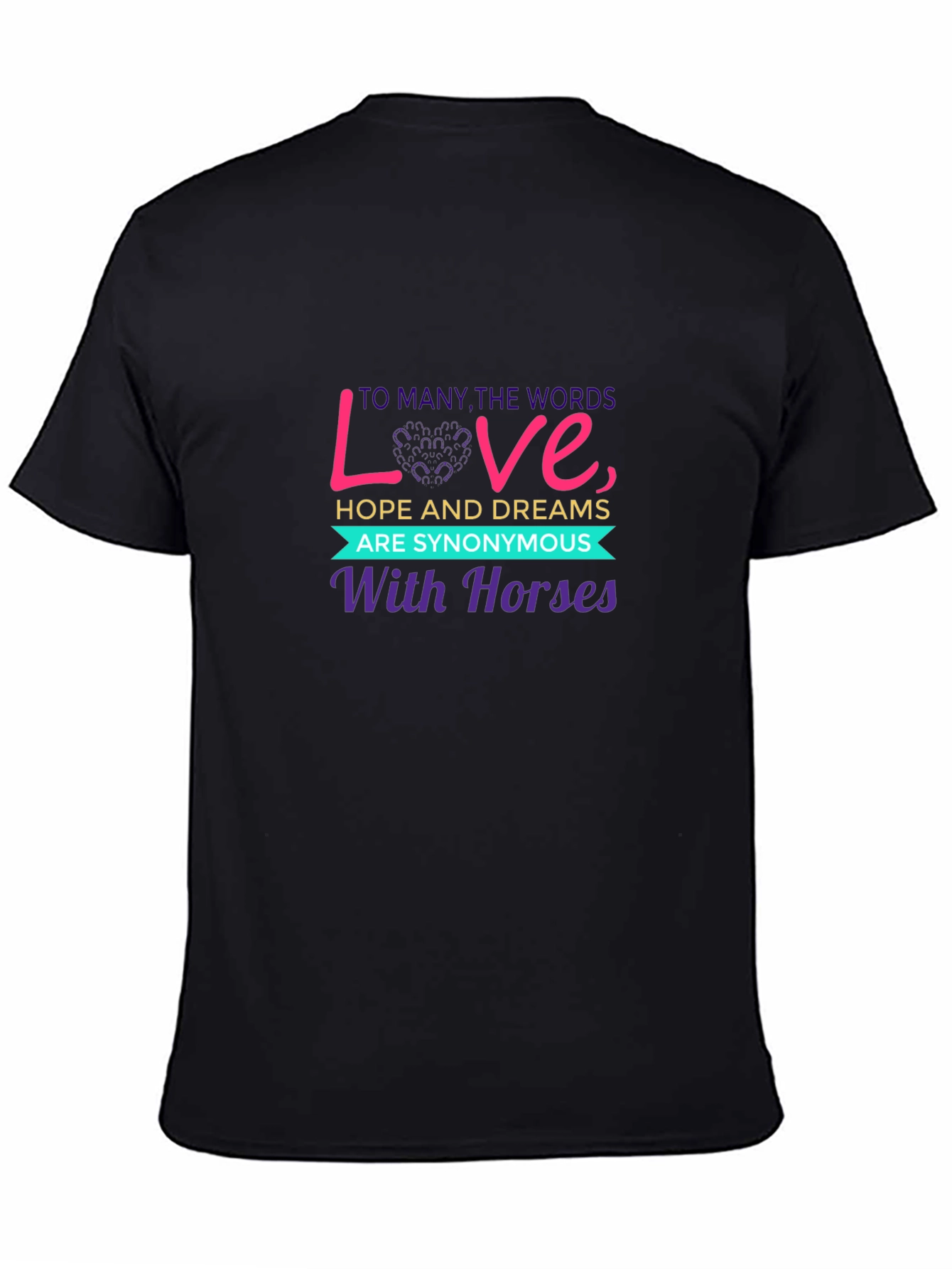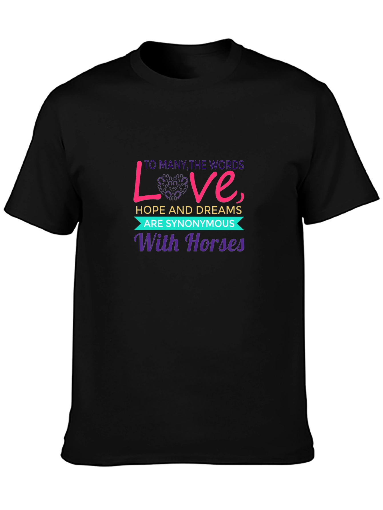 Show your love for horses with this stylish black t-shirt. The shirt features a vibrant graphic print that reads 'Love, Hope, and Dreams Are Synonymous With Horses'. Made from soft, breathable cotton, this tee offers a comfortable fit for everyday wear. Its unique design makes it a perfect gift for horse lovers. Pair it with jeans or shorts for a casual look or dress it up with a blazer for a more polished ensemble. Ideal for equestrian events, casual outings, or simply expressing your passion for horses.