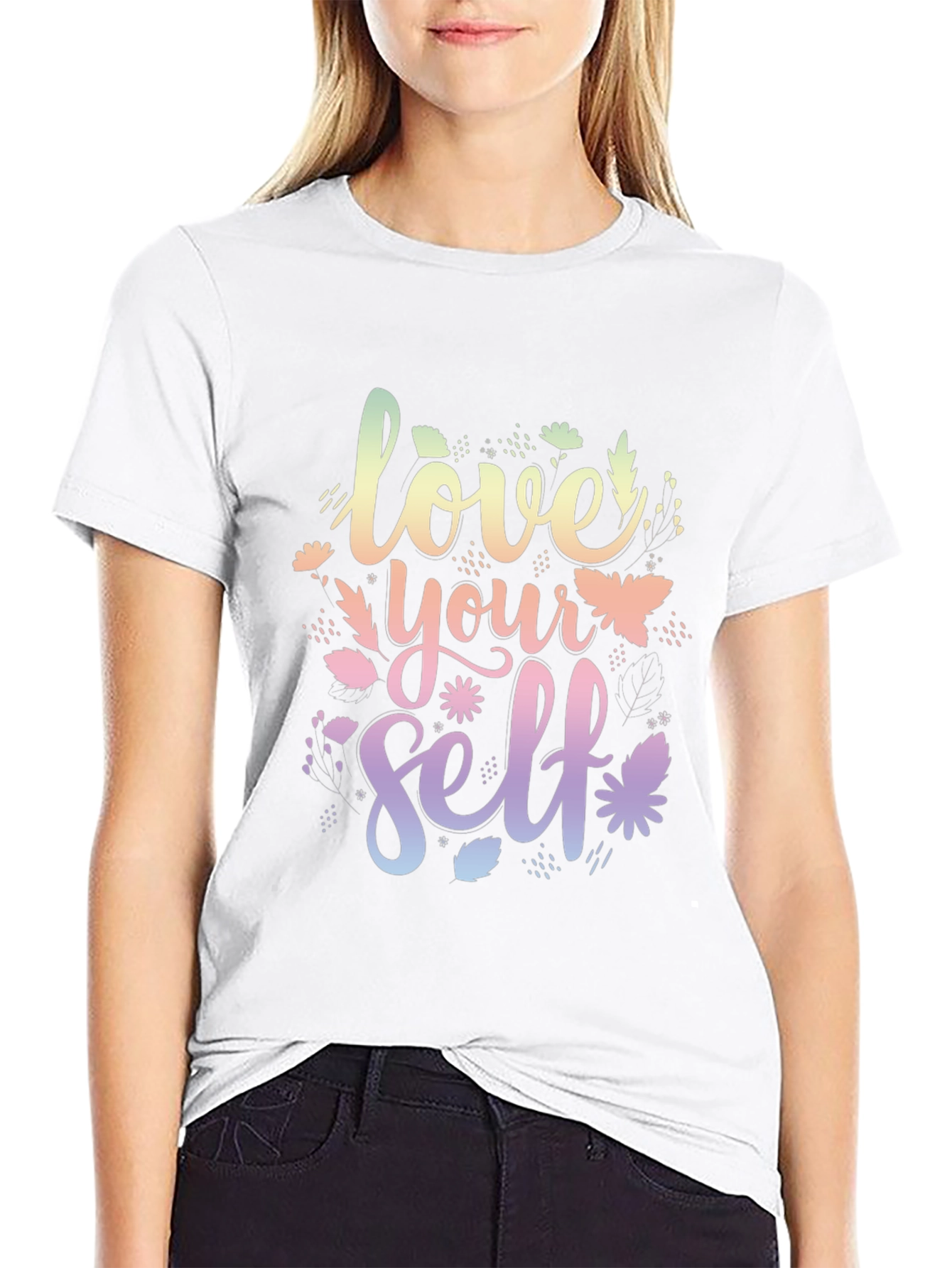 Show yourself some love with this stylish black T-shirt. Featuring a vibrant, multi-colored "Love Yourself" graphic, adorned with floral and butterfly accents, this tee is a perfect blend of comfort and positive vibes. Crafted from what appears to be soft cotton, it's ideal for casual wear, workouts, or lounging at home. The eye-catching design adds a pop of color to any outfit, making it a great conversation starter and a reminder to practice self-care. This tee is a must-have for anyone who values comfort, style, and a positive mindset. Get yours today and spread the love!