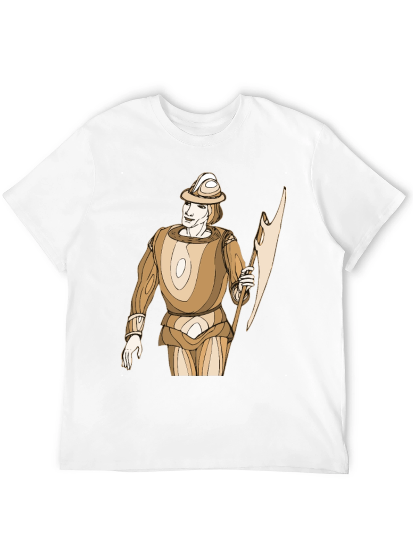 Step back in time with this unique black t-shirt featuring a detailed graphic of a medieval knight. The design showcases a figure clad in distinctive armor and holding a poleaxe, rendered in light brown shades with intricate details. The t-shirt itself appears to be made from a comfortable, soft fabric, perfect for everyday wear. This eye-catching tee is ideal for history enthusiasts, fantasy fans, or anyone looking to add a touch of medieval flair to their wardrobe. Wear it casually with jeans, or pair it with accessories for a themed event. Make a bold statement with this stand-out t-shirt!