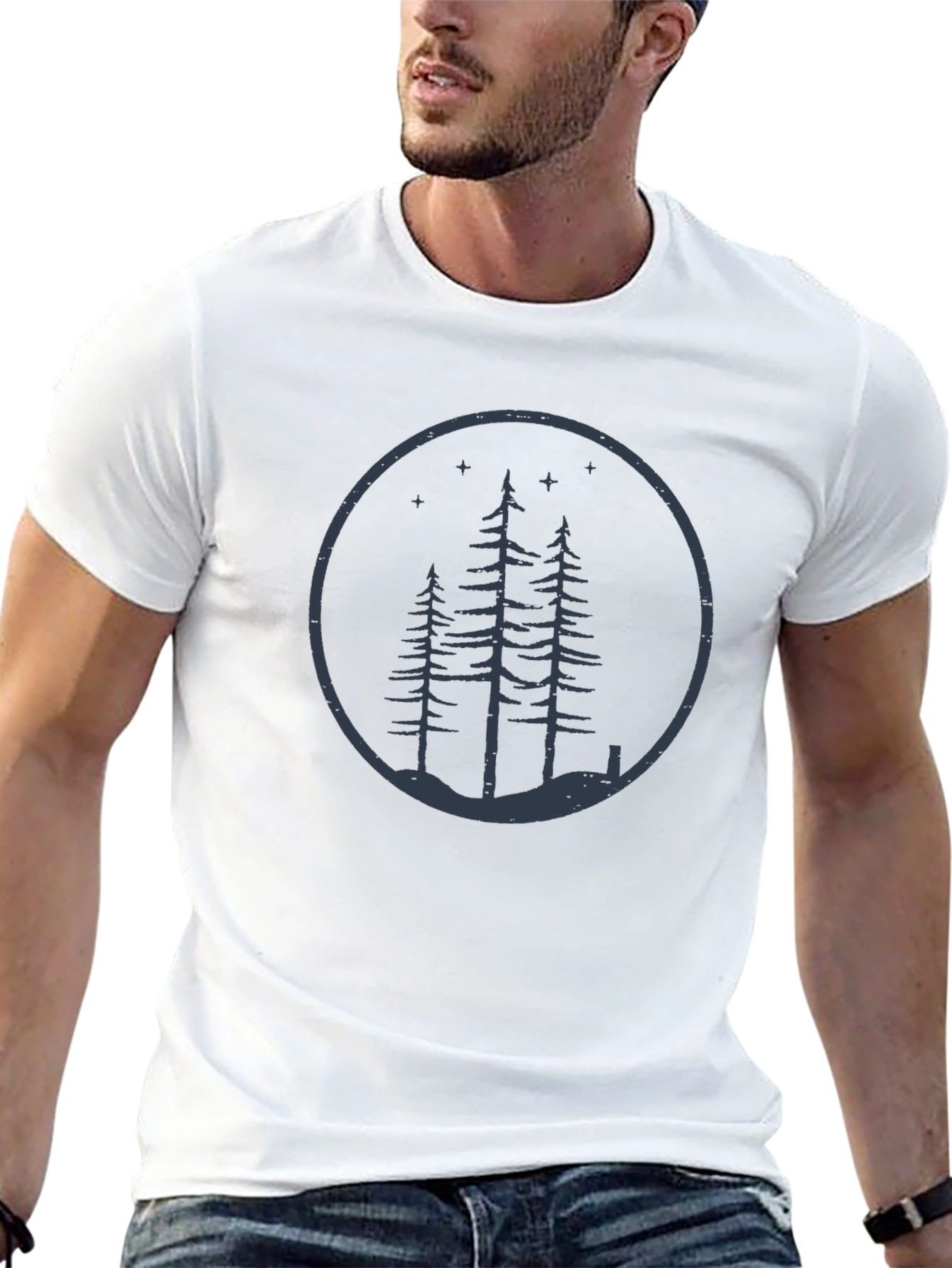 This stylish men's tee features a simple, yet elegant graphic design of tall trees within a circle. The design is a muted gray that contrasts nicely against the black shirt. It is likely crafted from a soft, breathable cotton blend, offering both comfort and durability. The classic crew neck and short sleeves make it a versatile piece for casual wear. Perfect for nature lovers or anyone who appreciates minimalist design, this tee can be paired with jeans, shorts, or layered under a jacket for a relaxed, everyday look. This tee is a must-have addition to any wardrobe.