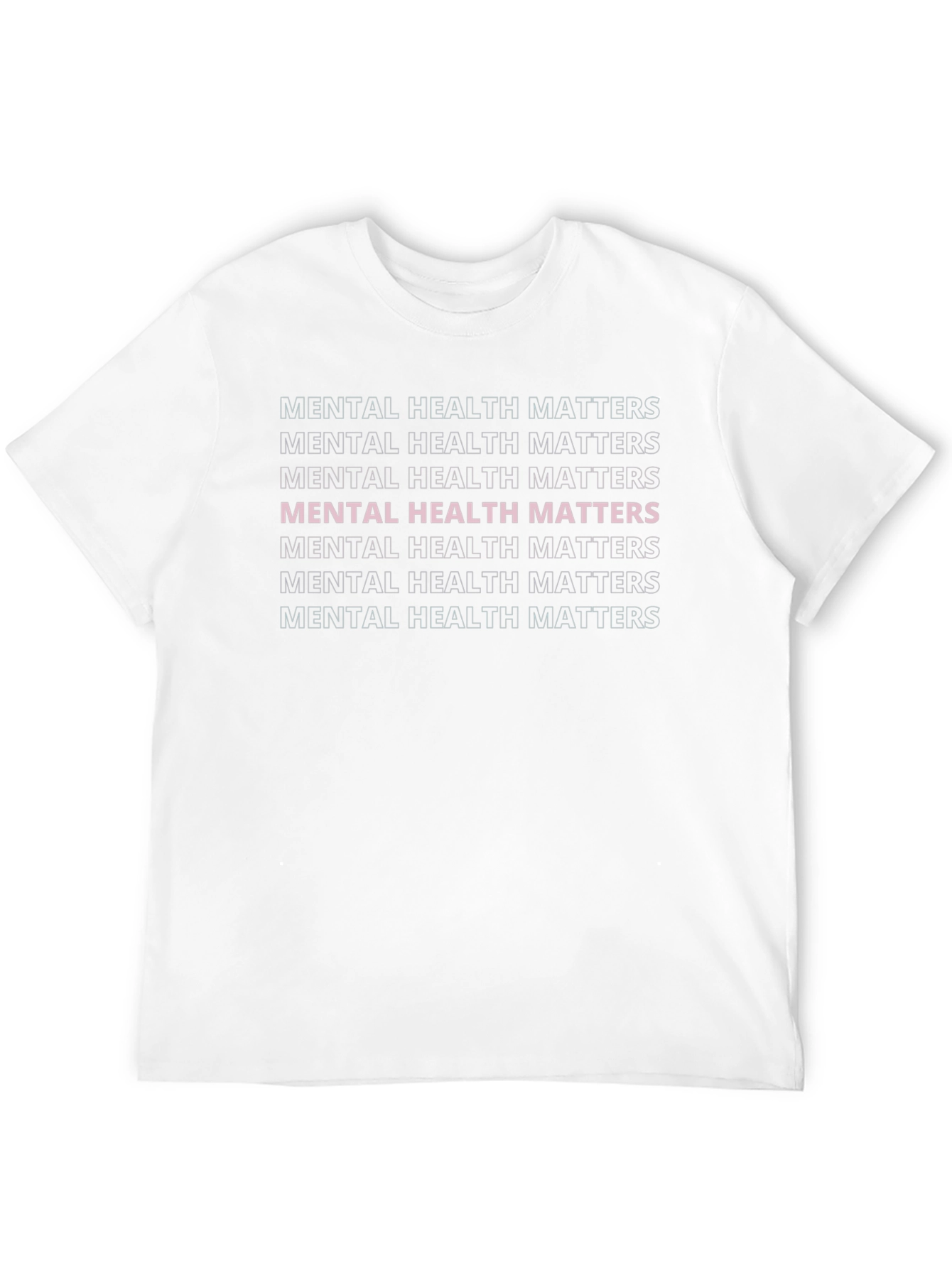 Show your support with this stylish black t-shirt featuring the message "Mental Health Matters" repeated in a unique stacked design. The text is rendered in a subtle gradient effect that accentuates the central row. Made from soft, breathable cotton, this tee offers a comfortable fit for all-day wear. Perfect for raising awareness or simply expressing your values, this shirt is versatile for casual outings, social events, or relaxed days at home. It’s not just a shirt; it's a conversation starter and a statement of solidarity. Get yours today and wear your support!