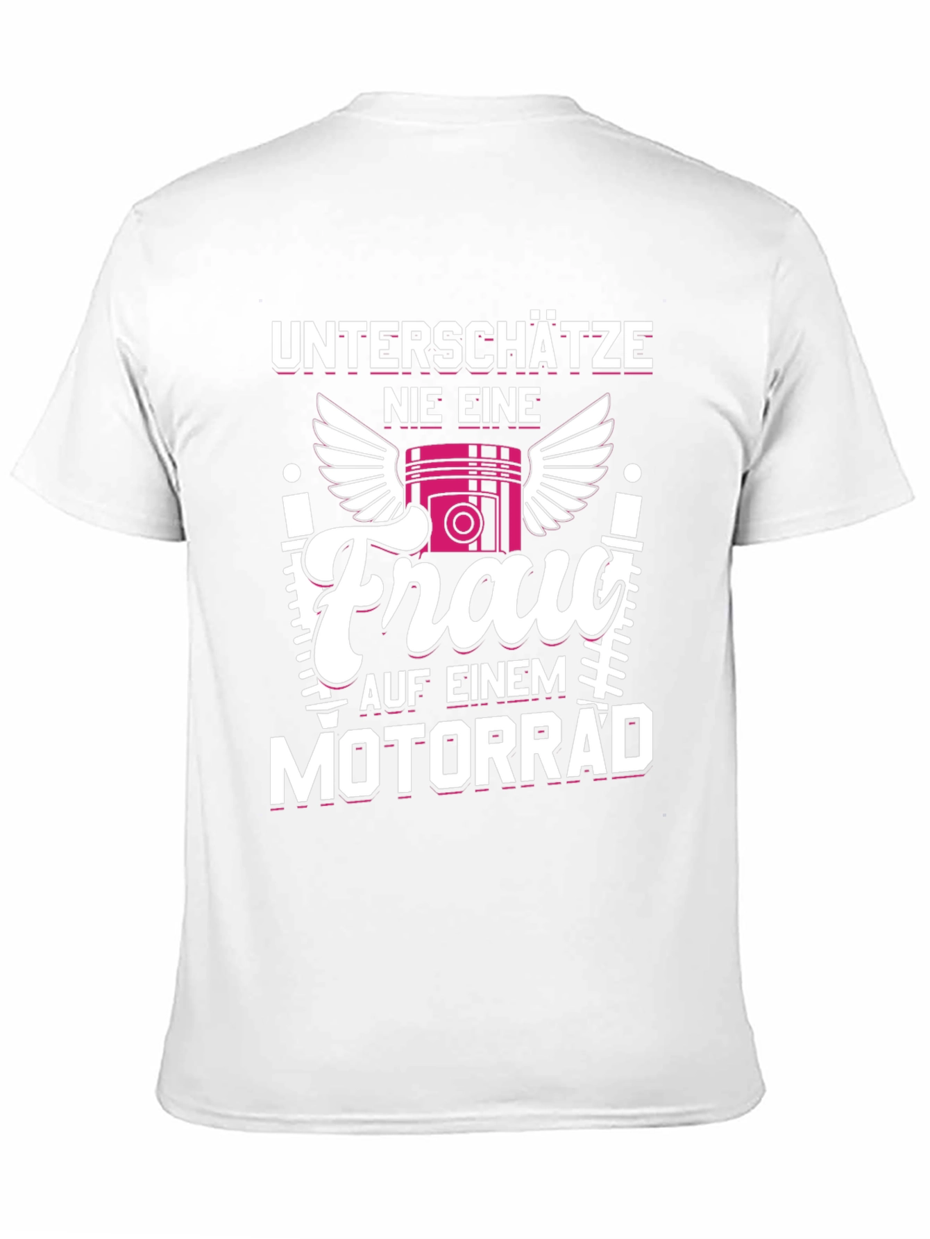 This stylish black t-shirt features a bold graphic design for motorcycle enthusiasts, particularly women. The print includes German text saying "Don't Underestimate A Woman On A Motorcycle" with an image of a motorcycle engine piston with wings. Made from a soft, comfortable material, this t-shirt is perfect for casual wear, bike meets, or as a statement piece. Show off your love for motorcycles and make a statement with this unique and eye-catching t-shirt. Great gift for female riders!