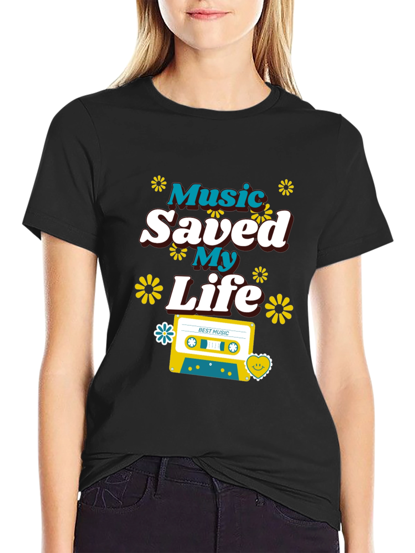 Express your passion for music with this eye-catching black graphic tee. The shirt features the phrase "Music Saved My Life" in a retro-inspired font with playful floral accents. A colorful cassette tape graphic adds a fun, nostalgic touch. Made from a comfortable, breathable fabric, this t-shirt is perfect for everyday wear. Show off your love for music and add a stylish statement piece to your wardrobe. Ideal for casual outings, music events, or simply relaxing at home. Get yours today and let the world know how music has impacted your life!