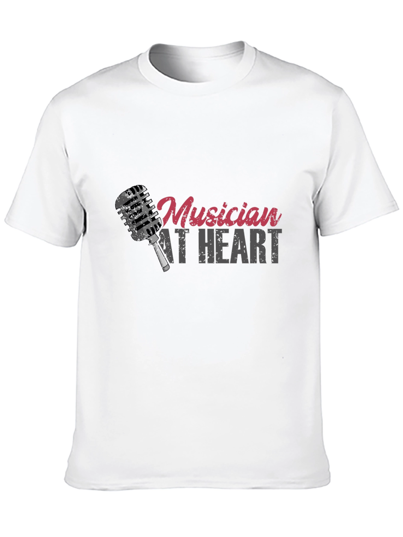 Express your passion for music with this stylish black t-shirt. Featuring a classic microphone graphic and the words 'Musician At Heart', this shirt is perfect for music lovers and performers alike. The design incorporates a vintage, slightly distressed aesthetic, giving it a cool, worn-in feel. Made from a comfortable fabric, this tee is ideal for casual wear, band practice, or music-themed events. Show off your musical spirit with this unique and eye-catching t-shirt, a must-have for any true musician's wardrobe. It's more than just apparel, it's a statement!