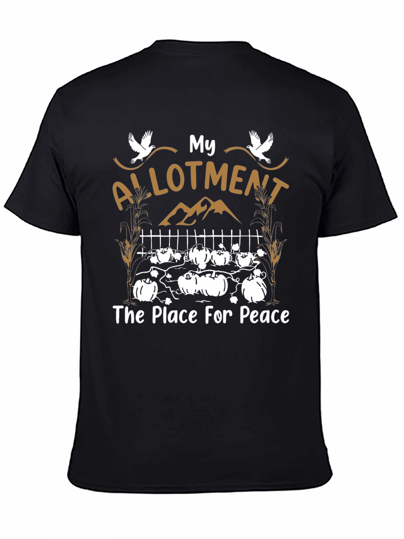 This black t-shirt features a charming graphic perfect for gardeners and peace-seekers alike. The design showcases "My Allotment" in a stylized font above a mountain illustration. Below, a row of pumpkins sits behind a picket fence, flanked by corn stalks. The phrase "The Place For Peace" completes the design. Ideal for casual wear, gardening, or showing off your love for nature, this tee offers both comfort and style. A great gift for allotment enthusiasts!