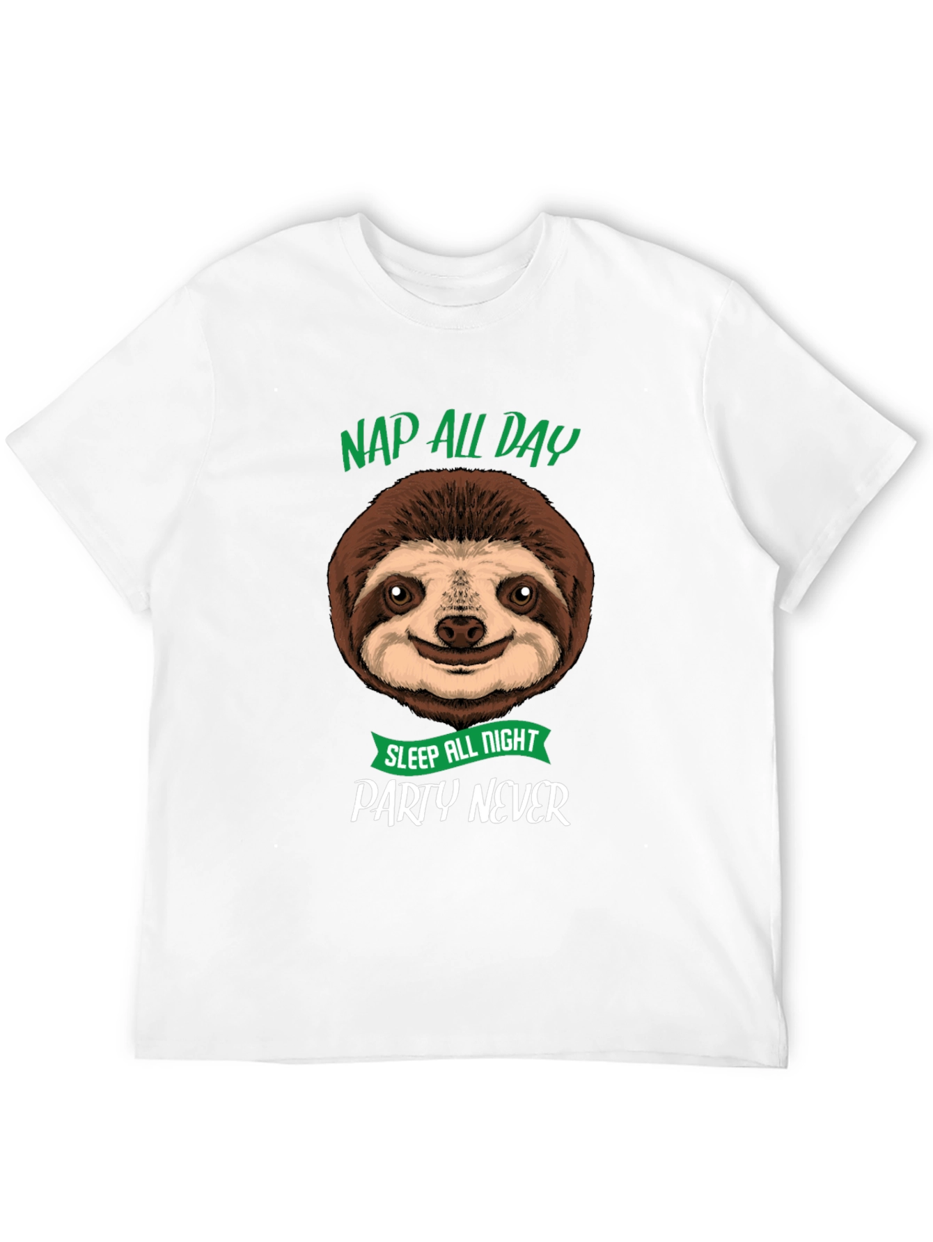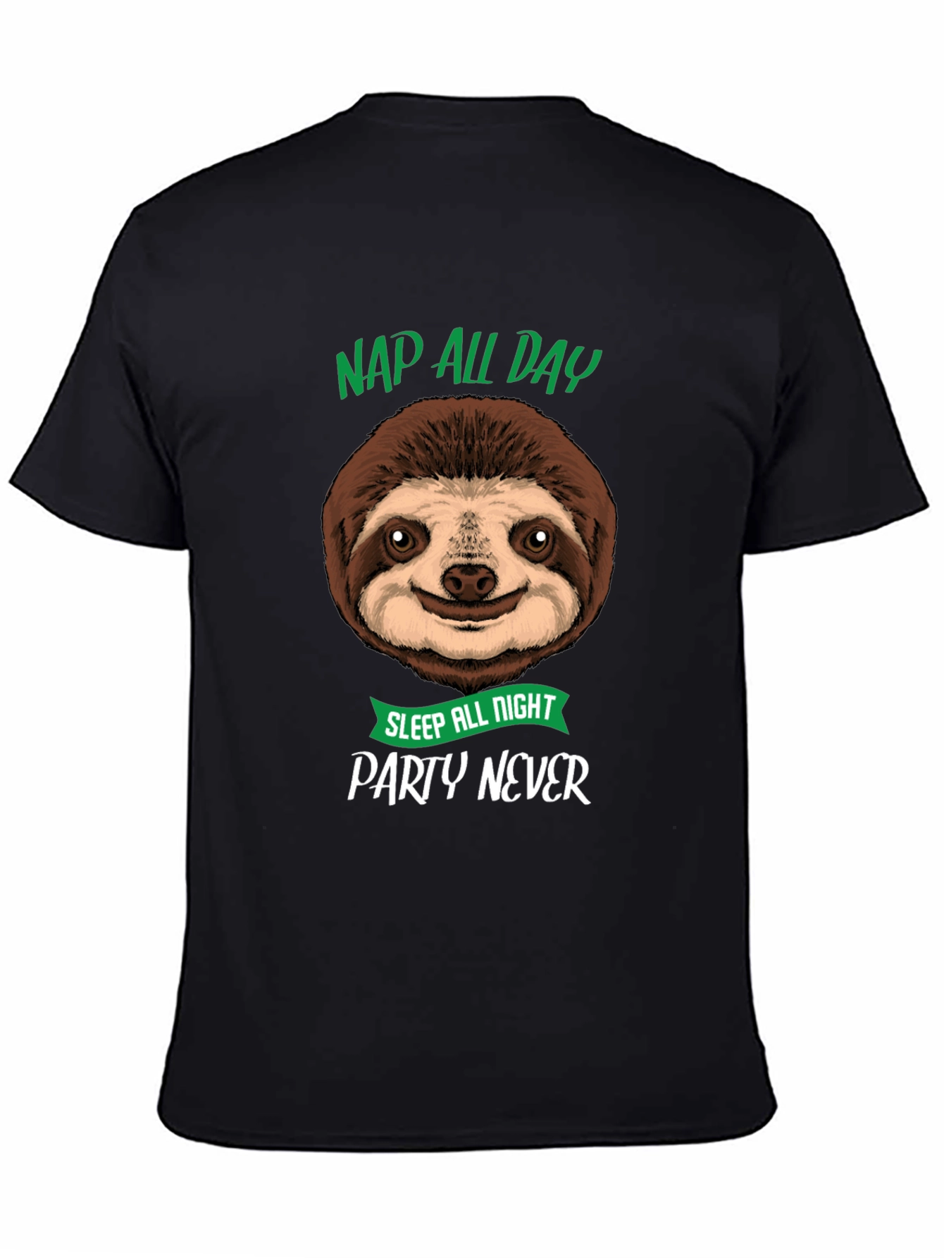 Embrace your inner sloth with this comfortable black tee! Featuring a cute sloth graphic with the funny saying "Nap All Day, Sleep All Night, Party Never", this shirt is perfect for anyone who loves to relax and unwind. The design is printed clearly on a soft, breathable fabric, making it ideal for lounging at home, running errands, or casual outings. Show off your laid-back style with this eye-catching tee, guaranteed to spark smiles and start conversations. A must-have for sloth lovers and nap enthusiasts alike! It's a great addition to any casual wardrobe and is sure to become a go-to favorite.