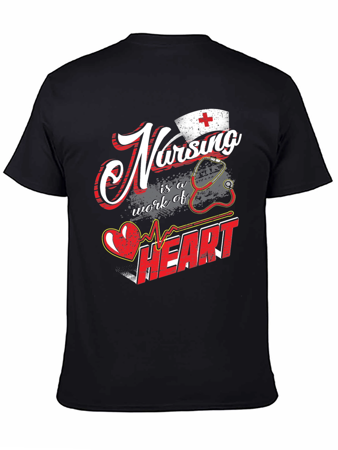 This striking black t-shirt features a vibrant graphic print celebrating the nursing profession. The design incorporates the word "Nursing" in an elegant font, complemented by a nurse's cap, stethoscope, and a stylized heart. The phrase "is a work of HEART" emphasizes the caring nature of nurses. Made from a soft-looking fabric, this tee appears comfortable and breathable, ideal for everyday wear. Perfect for nurses, nursing students, or anyone who appreciates the dedication of healthcare professionals. Show your support and admiration with this unique and meaningful t-shirt. It's more than just apparel; it's a statement of compassion and care.
