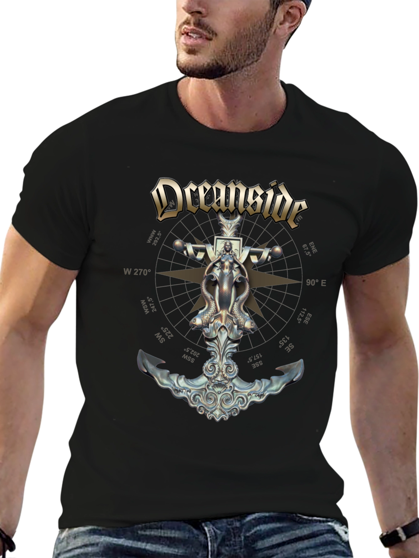 Show your love for the sea with this striking black t-shirt. The central graphic features a detailed silver anchor interwoven with a compass design, topped with a nautical emblem and the word "Oceanside". The intricate details create a bold, eye-catching image. Made from comfortable materials, this tee is perfect for casual wear. It’s ideal for everyday wear, weekend outings, or casual get-togethers. Embrace the nautical theme and add this unique graphic tee to your wardrobe today!