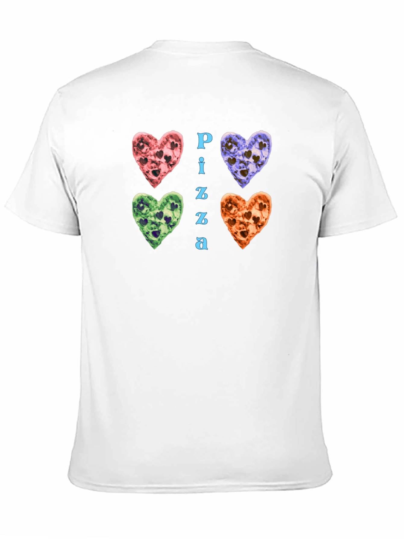 Show your love for pizza with this fun and unique t-shirt. This black tee features colorful heart shapes filled with pizza graphics and the word 'Pizza' vertically aligned. The soft fabric and comfortable fit make it ideal for everyday wear. It is perfect for casual outings, pizza parties, or simply lounging at home. A great way to express your passion for everyone's favorite food!