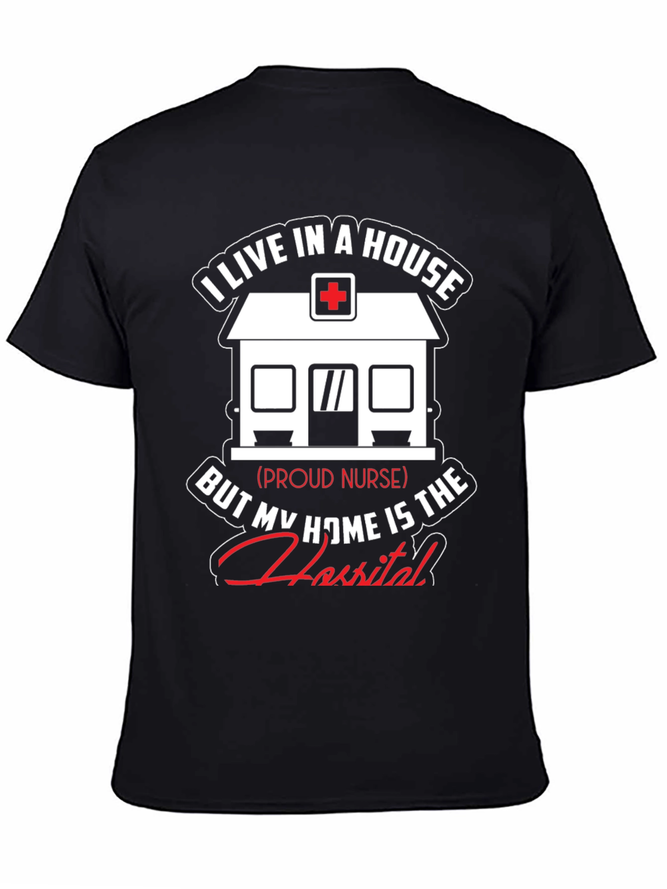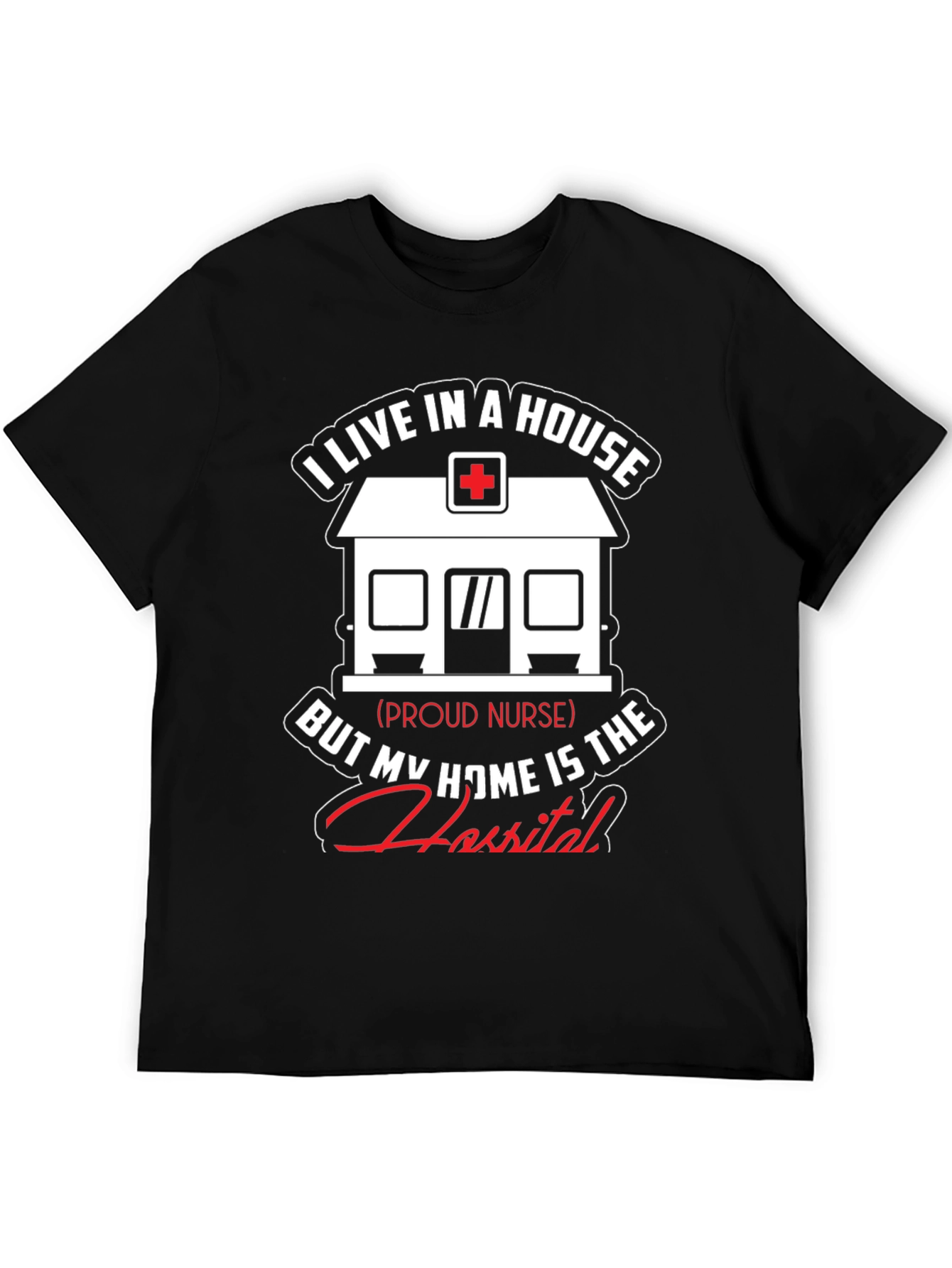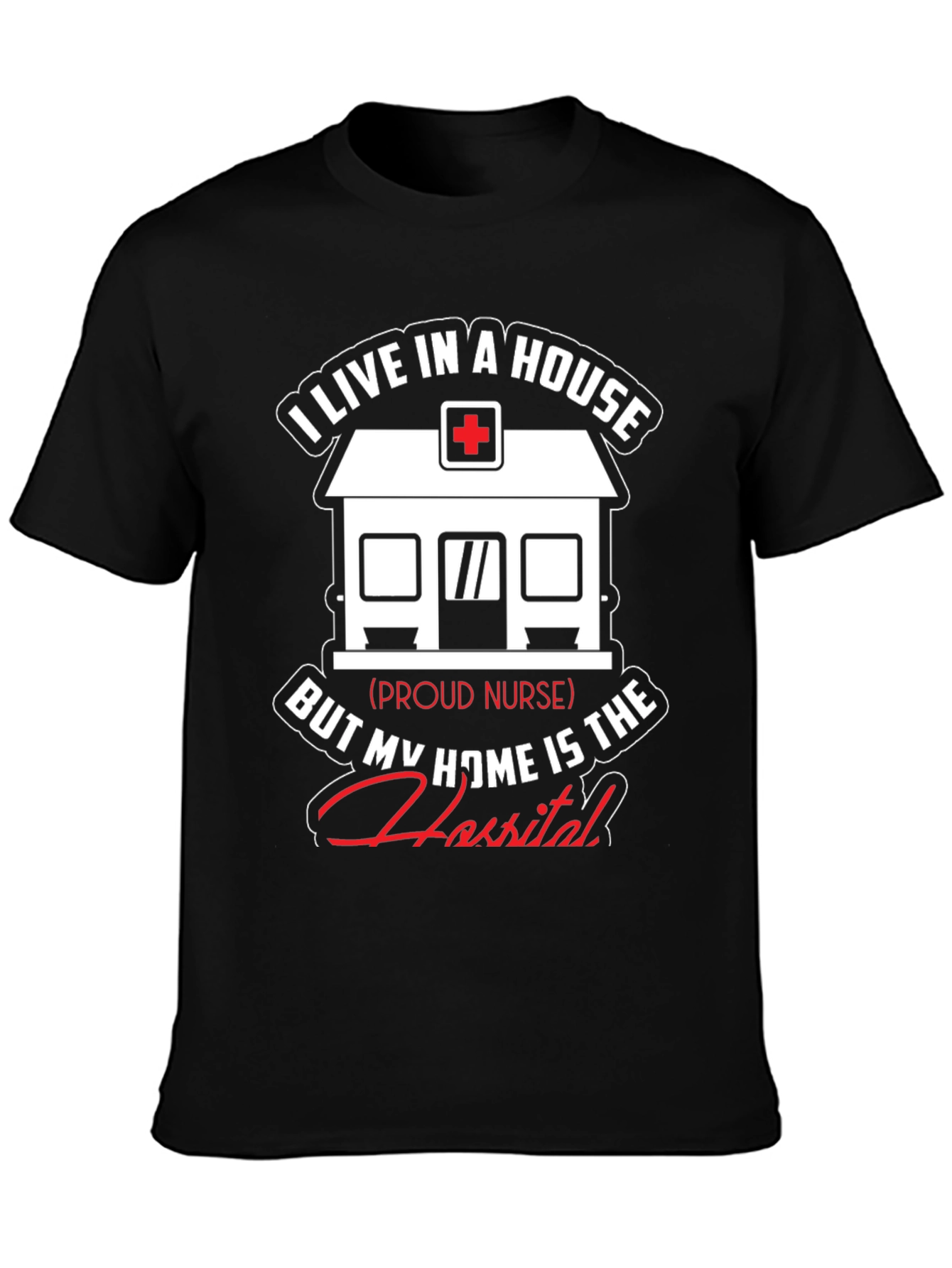 Show your dedication as a nurse with this unique t-shirt! The design features a graphic of a house with a medical cross on top, symbolizing a hospital. The text reads, "I live in a house, but my home is the hospital," showcasing the nurse's commitment to their profession. This black t-shirt is perfect for nurses who take pride in their work. It is made from comfortable fabric, ideal for everyday wear, whether at work or relaxing at home. A great gift idea for nurses!