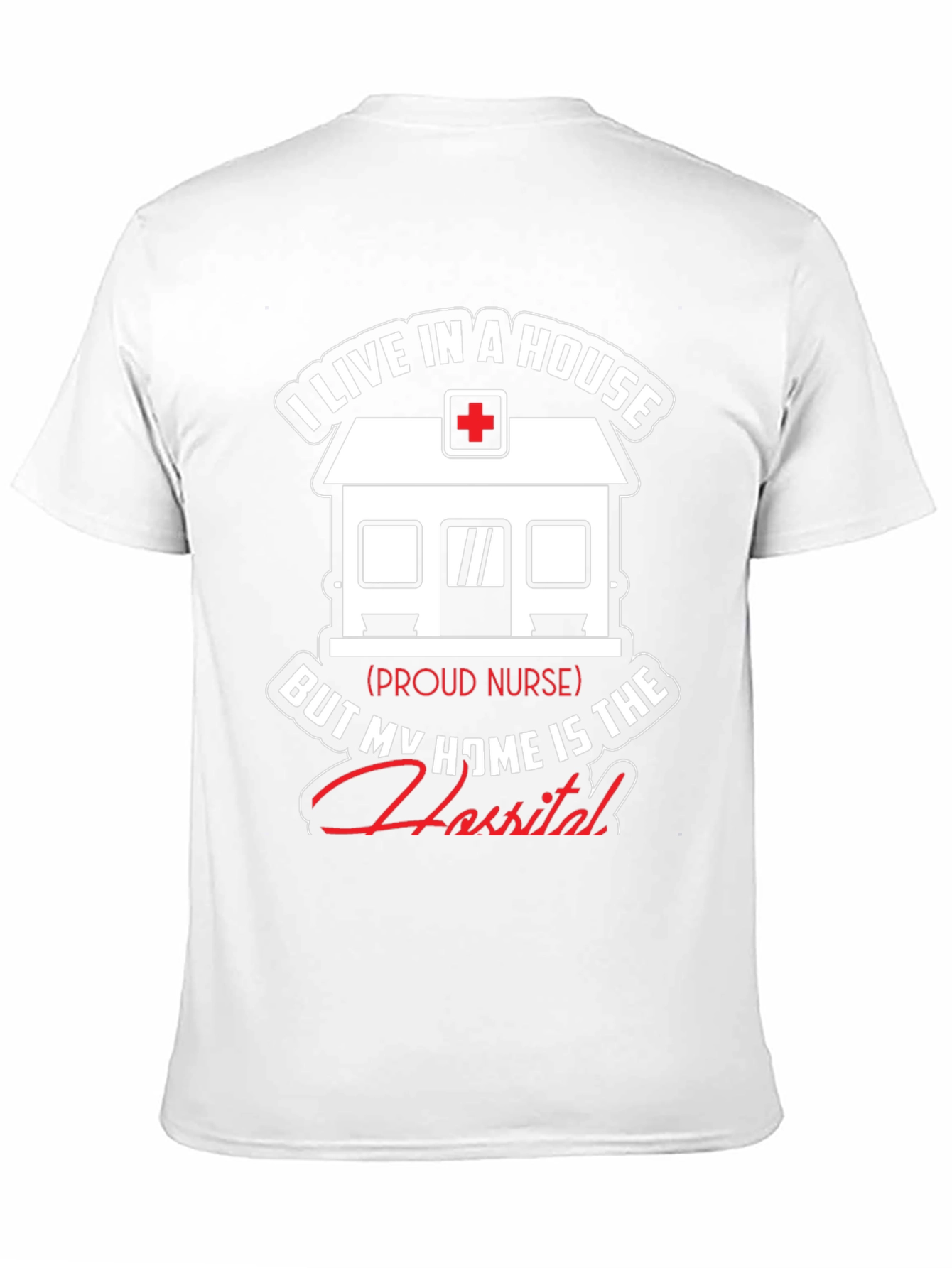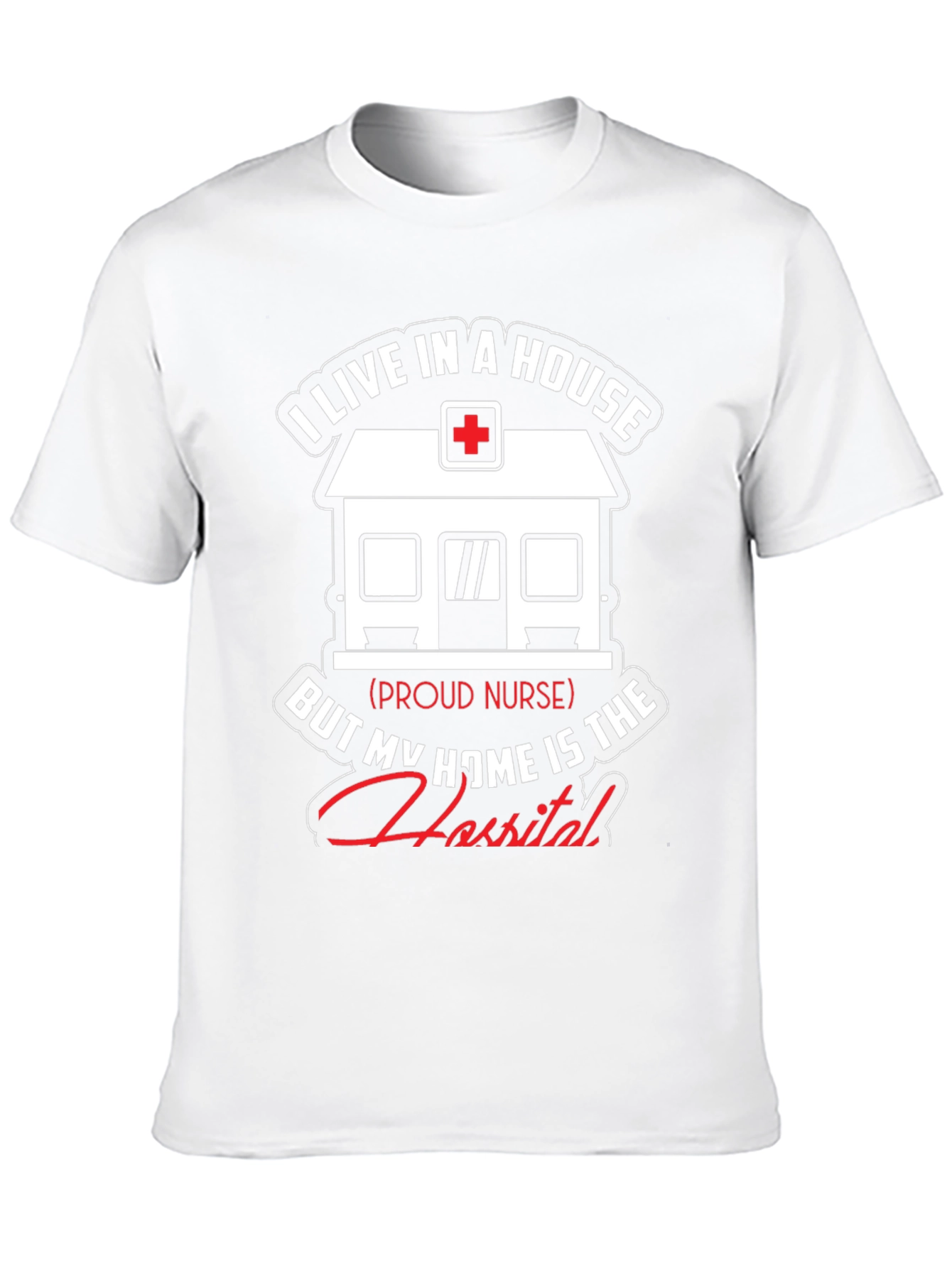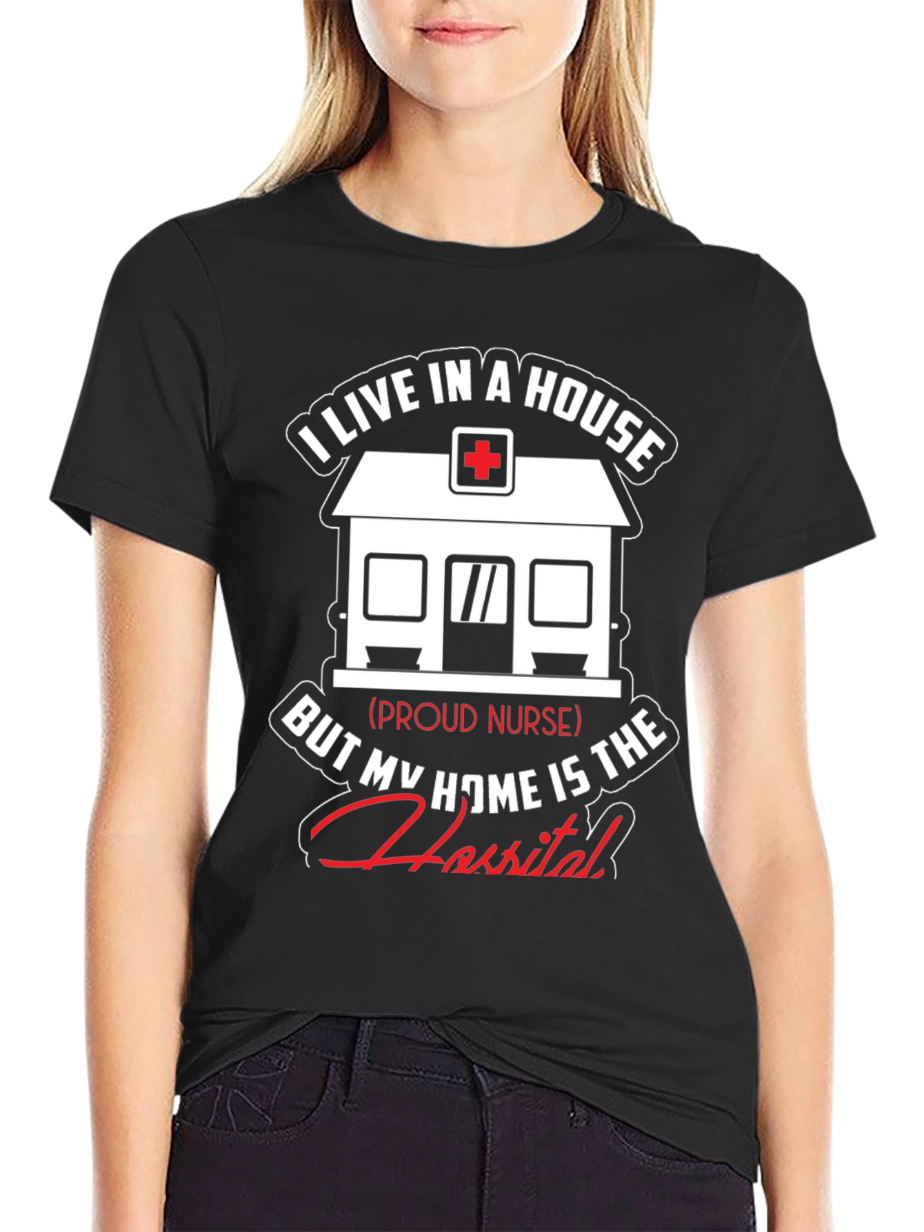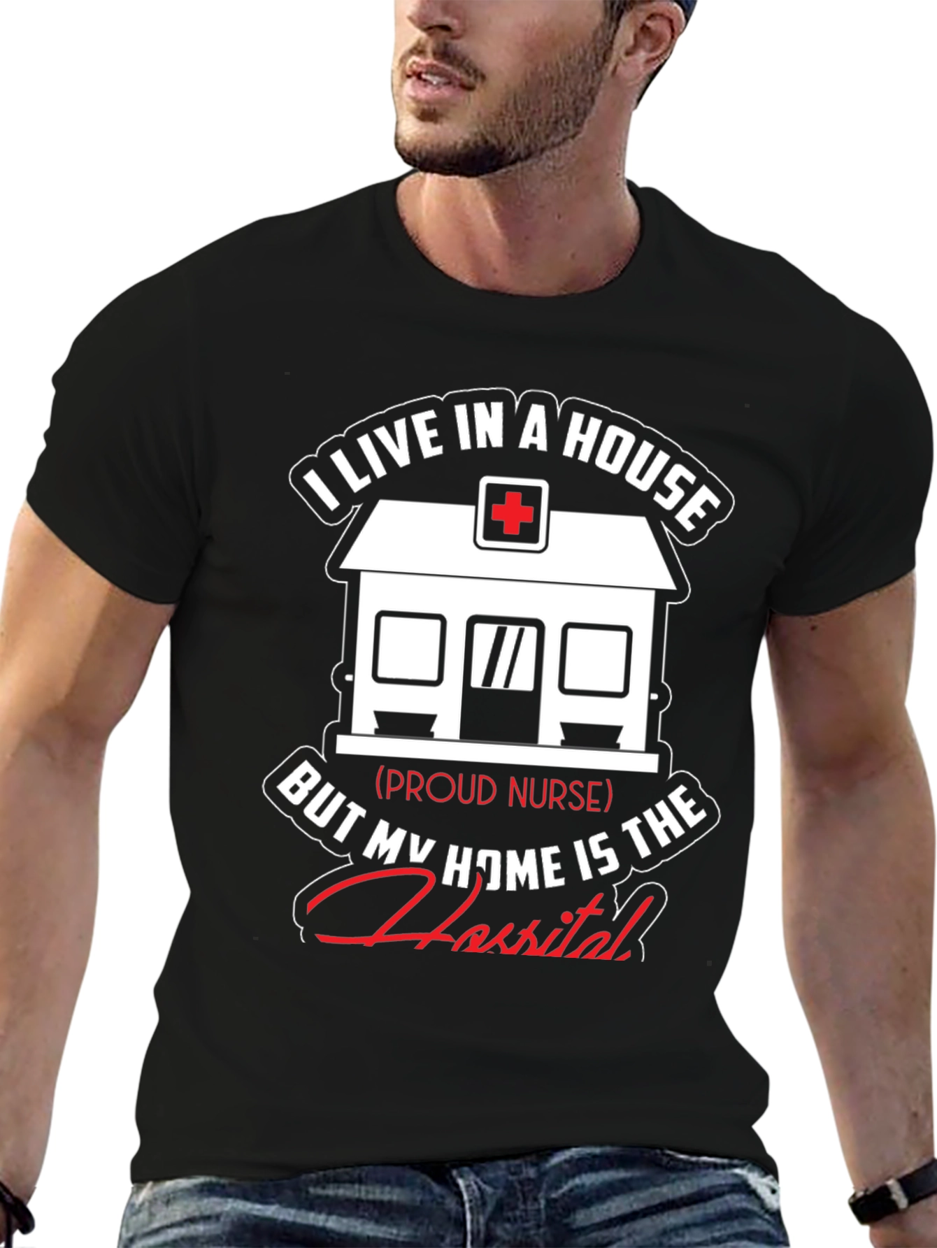 Show your dedication as a nurse with this unique t-shirt! The design features a graphic of a house with a medical cross on top, symbolizing a hospital. The text reads, "I live in a house, but my home is the hospital," showcasing the nurse's commitment to their profession. This black t-shirt is perfect for nurses who take pride in their work. It is made from comfortable fabric, ideal for everyday wear, whether at work or relaxing at home. A great gift idea for nurses!