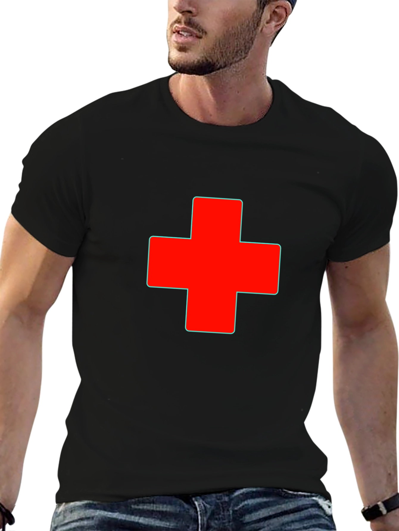 Show your support with this classic black t-shirt featuring a vibrant red cross design. Made from a comfortable, breathable fabric, this tee is perfect for everyday wear. The bold, simple graphic makes a statement while maintaining a clean, modern aesthetic. Ideal for medical professionals, first responders, or anyone who wants to show their support for healthcare, this versatile t-shirt pairs well with jeans, shorts, or casual wear. Add this unique and meaningful shirt to your wardrobe today!