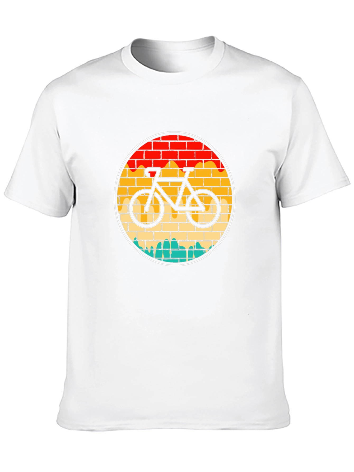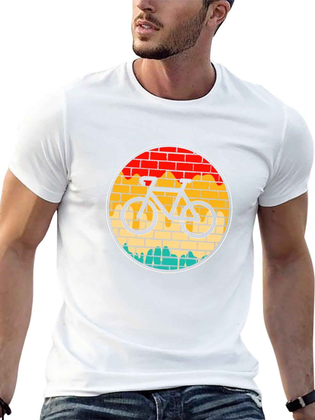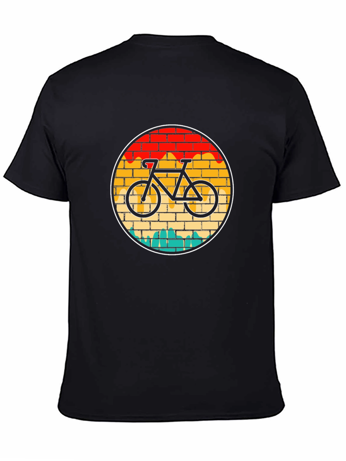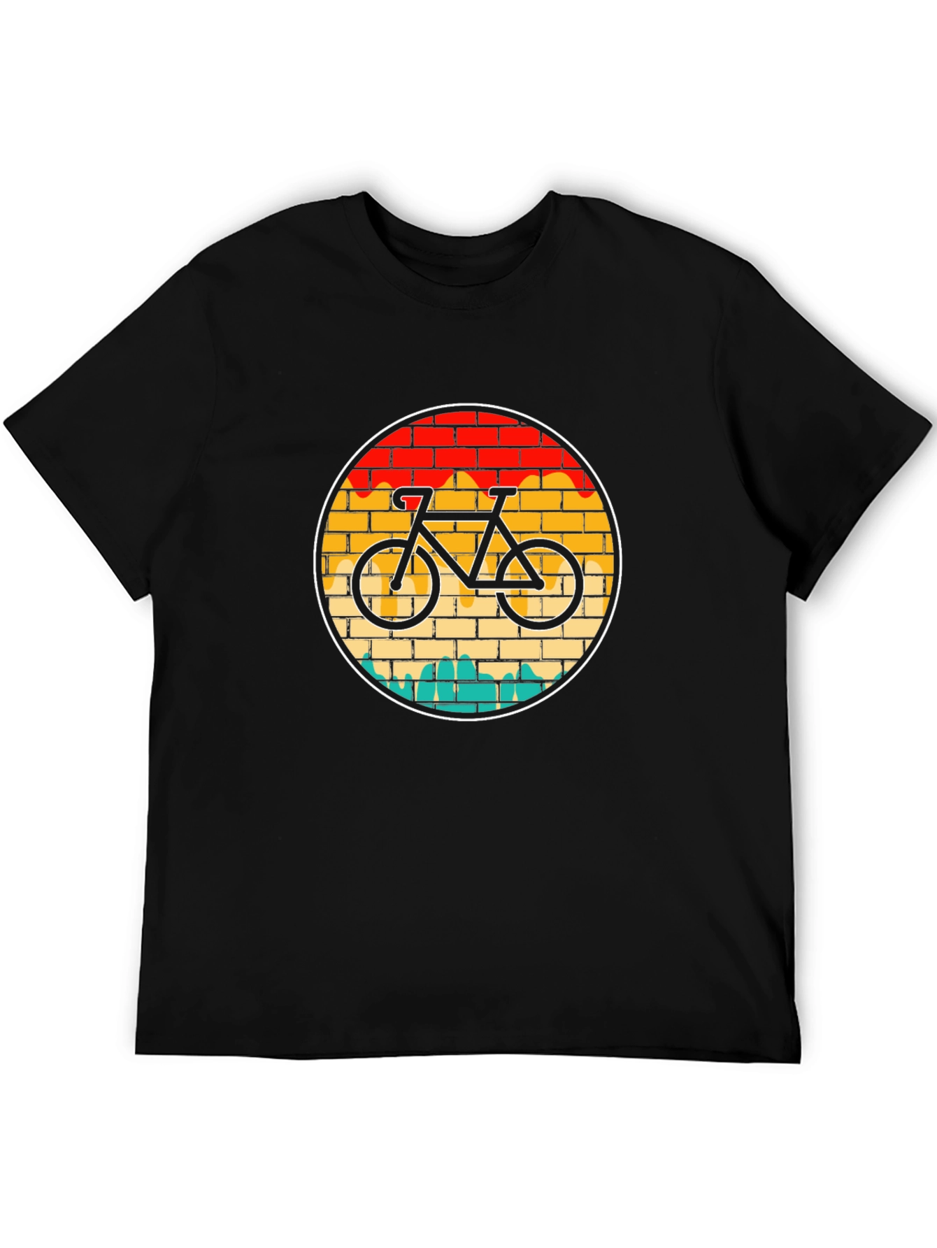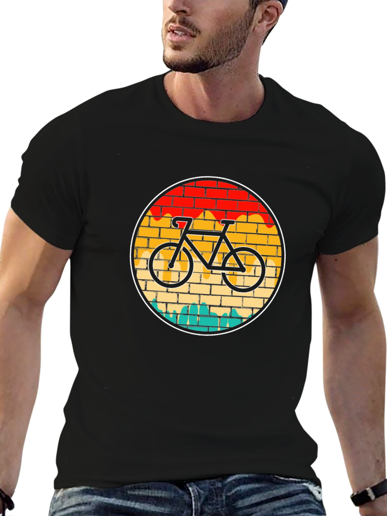 Show off your love for cycling with this unique graphic tee! This black t-shirt features a retro-inspired design of a bicycle silhouette set against a colorful brick wall background inside a circle. The bricks transition from red to orange to teal, adding a vintage pop to the classic black tee. Made from a comfortable fabric blend, this shirt is perfect for everyday wear, biking adventures, or casual outings. The eye-catching design is sure to spark conversations and showcase your unique sense of style. Get yours today and ride in style!