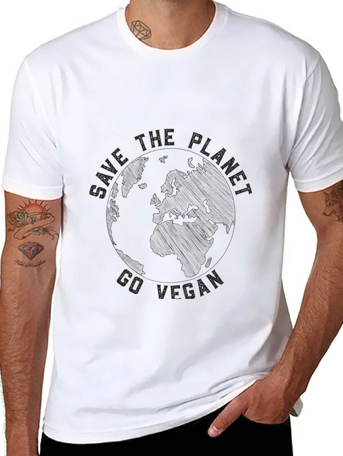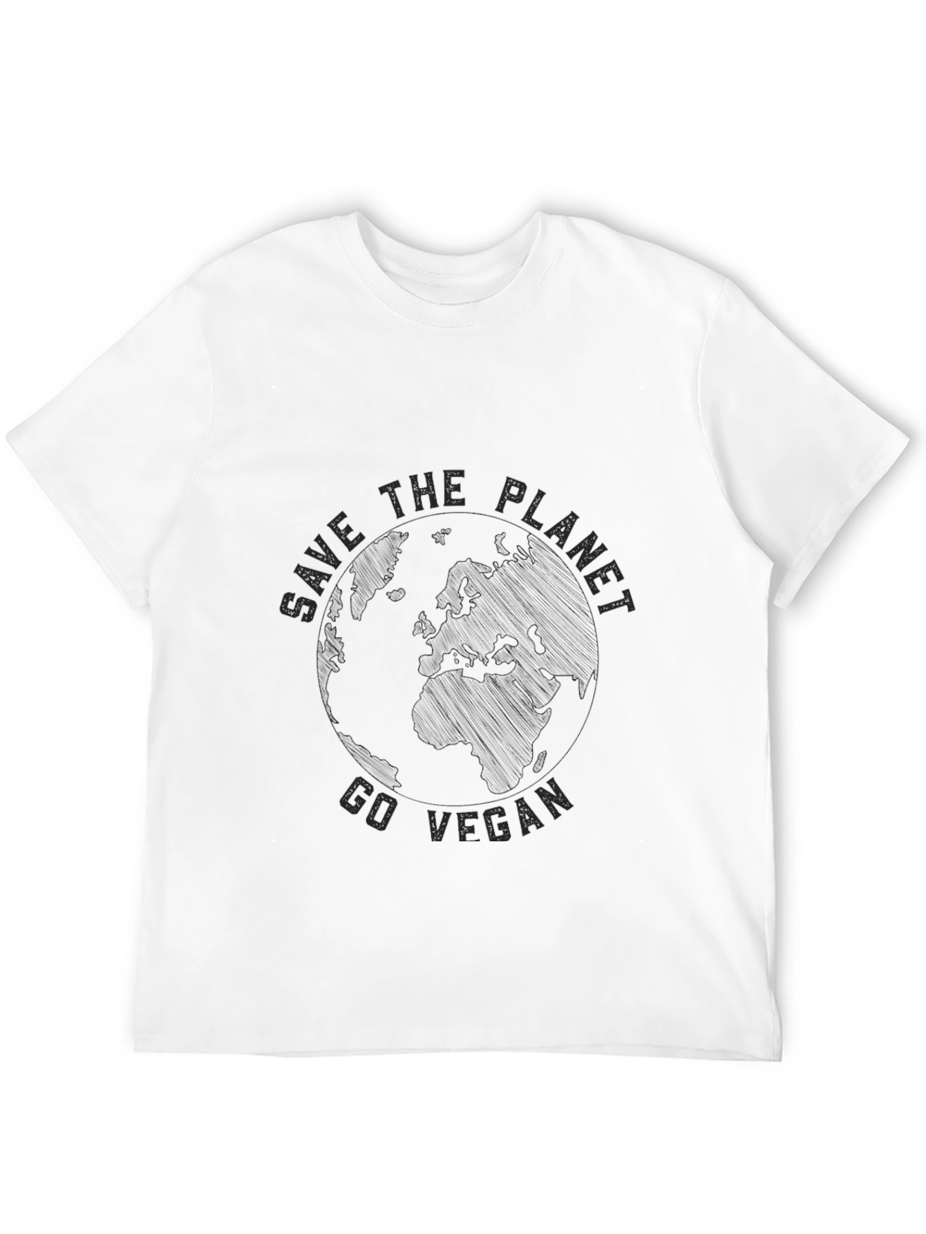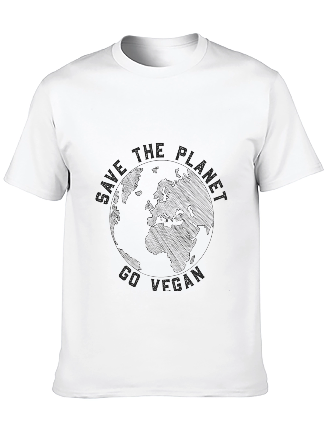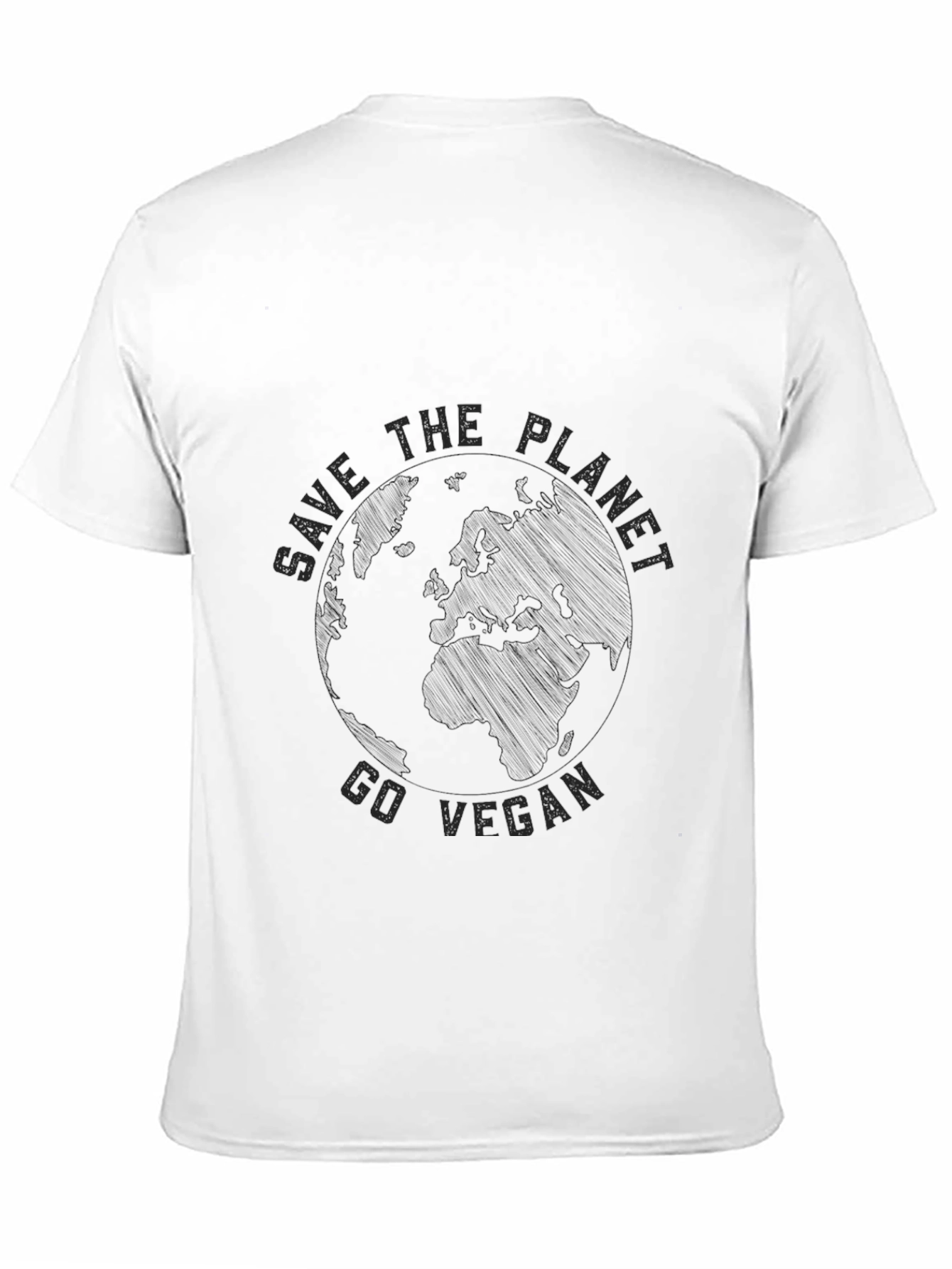 Show your support for a sustainable future with this stylish black T-shirt. The design features a globe graphic with the words "Save the Planet" in an arc above and "Go Vegan" in an arc below. Perfect for everyday wear, activism events, or promoting a plant-based lifestyle. This tee is made from a soft fabric, ensuring comfort and durability. Wear it with pride and spread the message of environmental responsibility. Get yours today and make a statement!