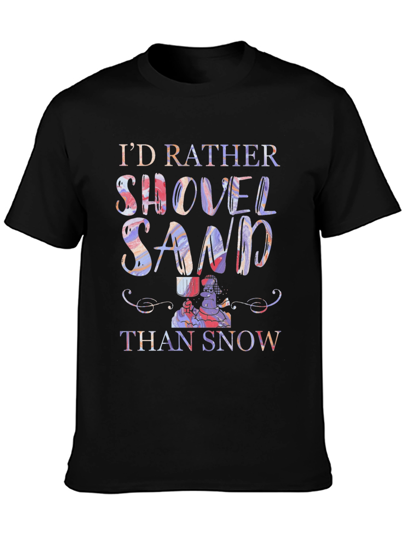 Embrace the beach vibes with this unique graphic tee! This eye-catching black t-shirt features a vibrant design with the phrase "I'd Rather Shovel Sand Than Snow". The colorful, marbled lettering gives a playful and artistic touch. Below the lettering sits a cartoon-style graphic which adds charm and whimsy. Made from a comfortable material, this tee is perfect for casual wear, beach outings, or as a fun gift for those who prefer the sun over snow. Show off your love for sandy shores with this stand-out shirt!